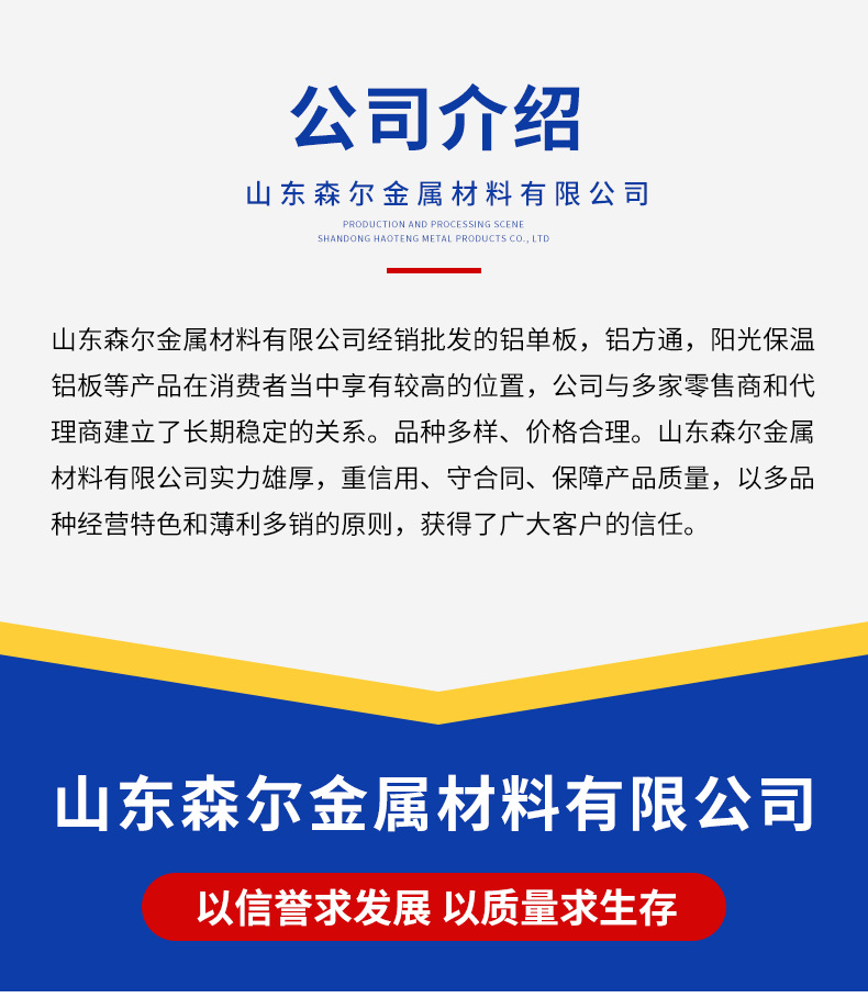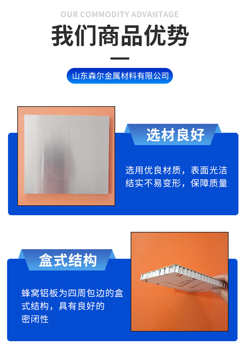 山东森尔金属材料有限公司是一家拥有完整、科学的质量管理体系专业生产铝蜂窝芯,铝蜂窝板复合材料的诚信企业。本公司采用先进的数控流水线作业,拥有经验丰富、细心工作、勇于创新的工作团队。为广大客户研发和生产各种产品。 山东森尔金属材料有限公司秉着“以品质赢市场,以诚信求合作”的生产经营理念,脚踏实地,勤奋创新,由小到大。目前拥有5600㎡的标准化作业车间,内设有铝蜂窝芯、铝蜂窝板、石材铝蜂窝复合板、卫生间隔断、大型天花板、隔音墙板、PVC复合板、密封喷涂房、机械钣金等车间组成了科学、合理的流水生产线,再加不懈创新的产品研发员,细心负责的车间作业员;严肃贴心的行政部管理及各区域的业务精英共计160多人组成了研发、生产、销售、管理一体的强大队伍,为国内外广大客户和合作伙伴提供可靠的服务。是蜂窝铝板、铝单板、铝方通等产品专业生产加工的公司,拥有完整、科学的质量管理体系。山东森尔金属材料有限公司的诚信、实力和产品质量获得业界的认可。欢迎各界朋友莅临参观、指导和业务洽谈。