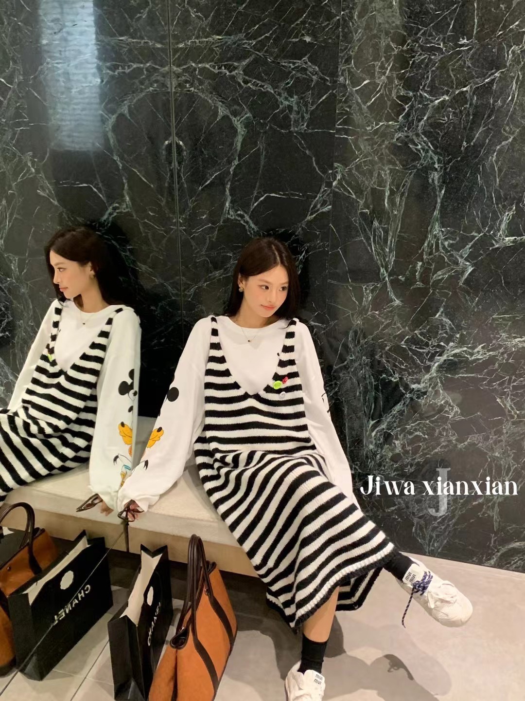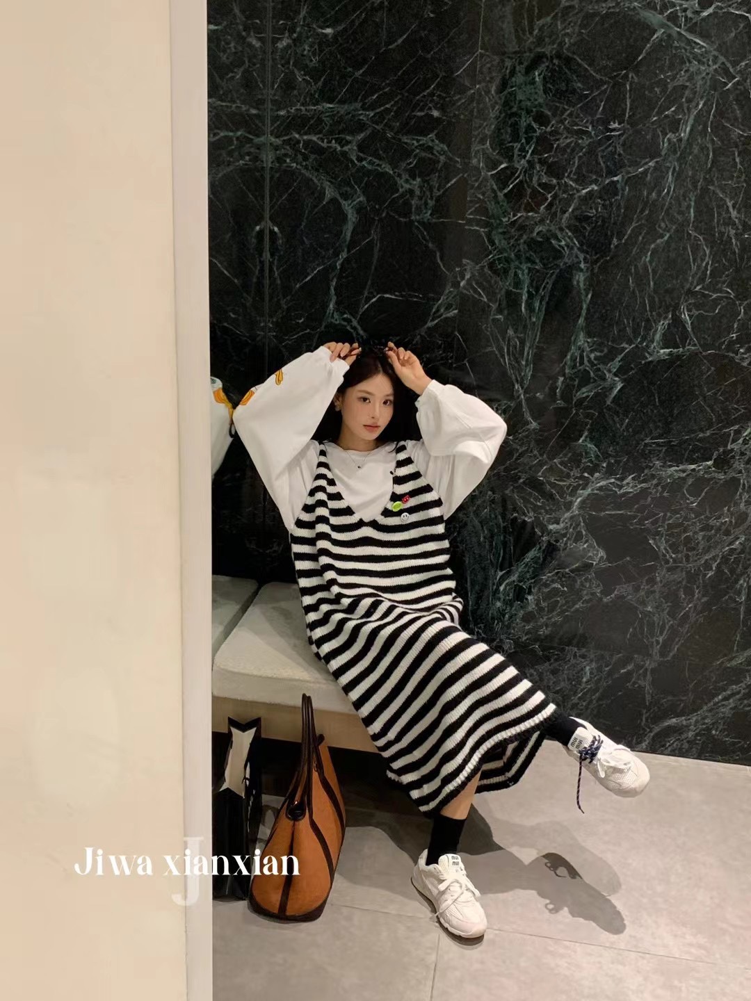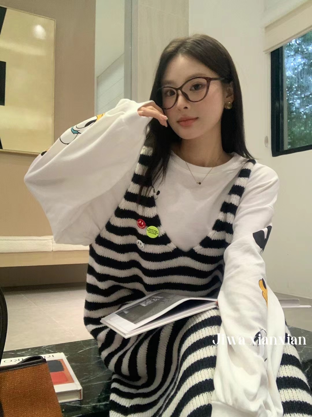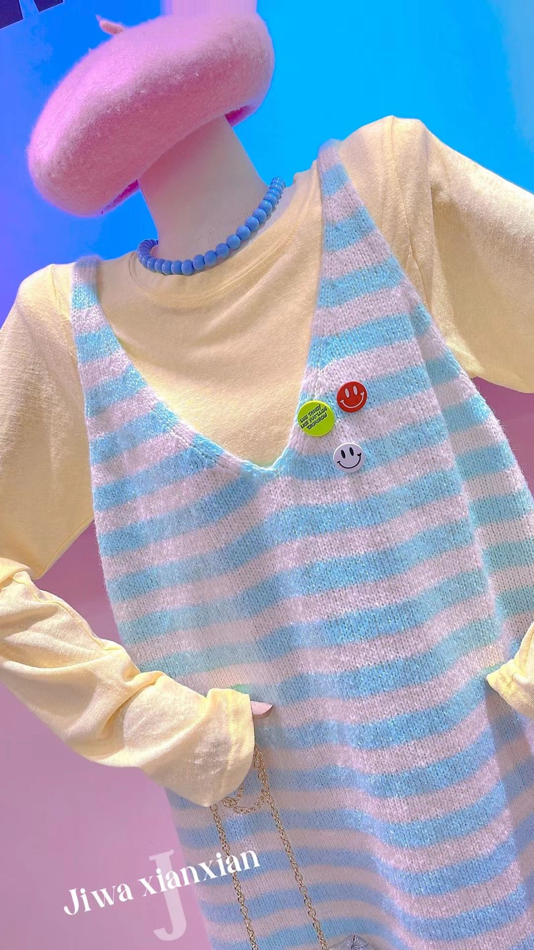 Ji Wa Xianxian мультфильм смайлик трехмерная пуговица подтяжка в полоску платье