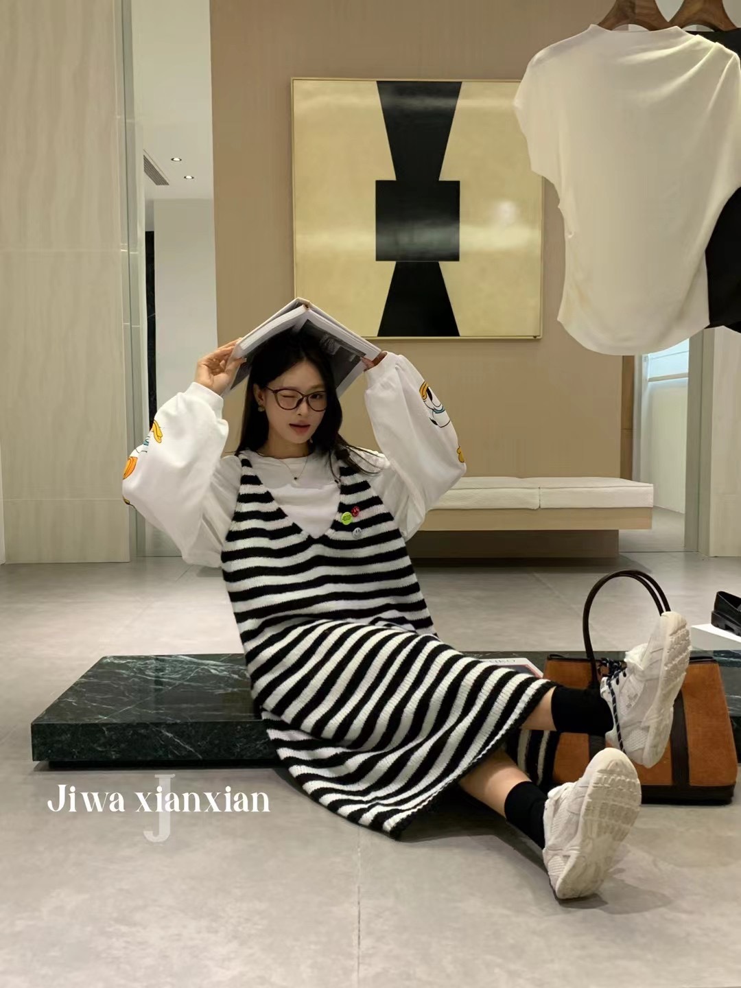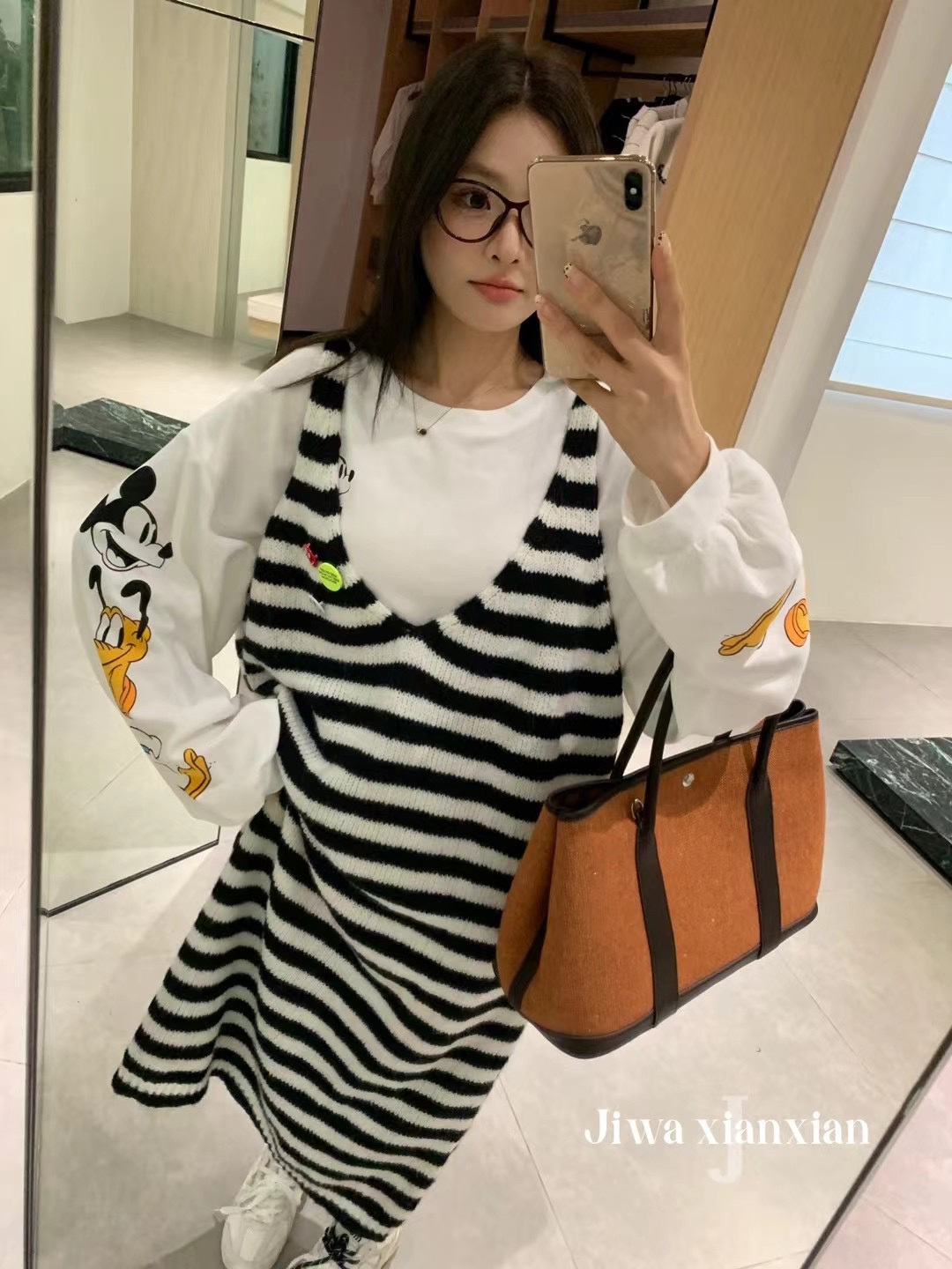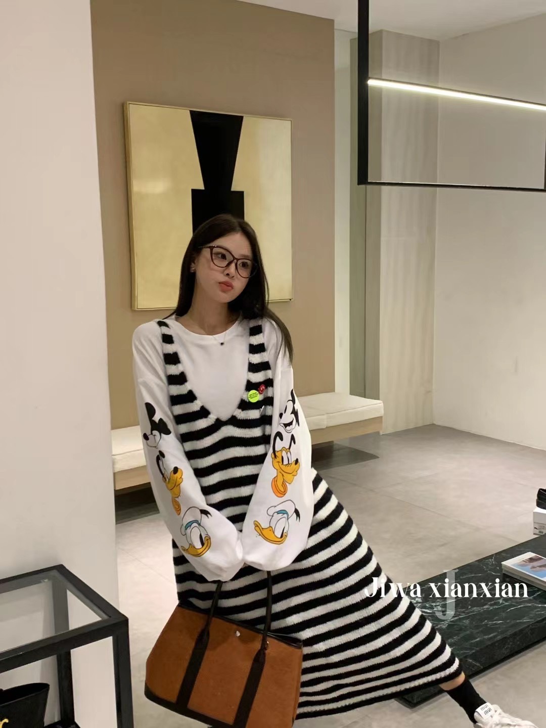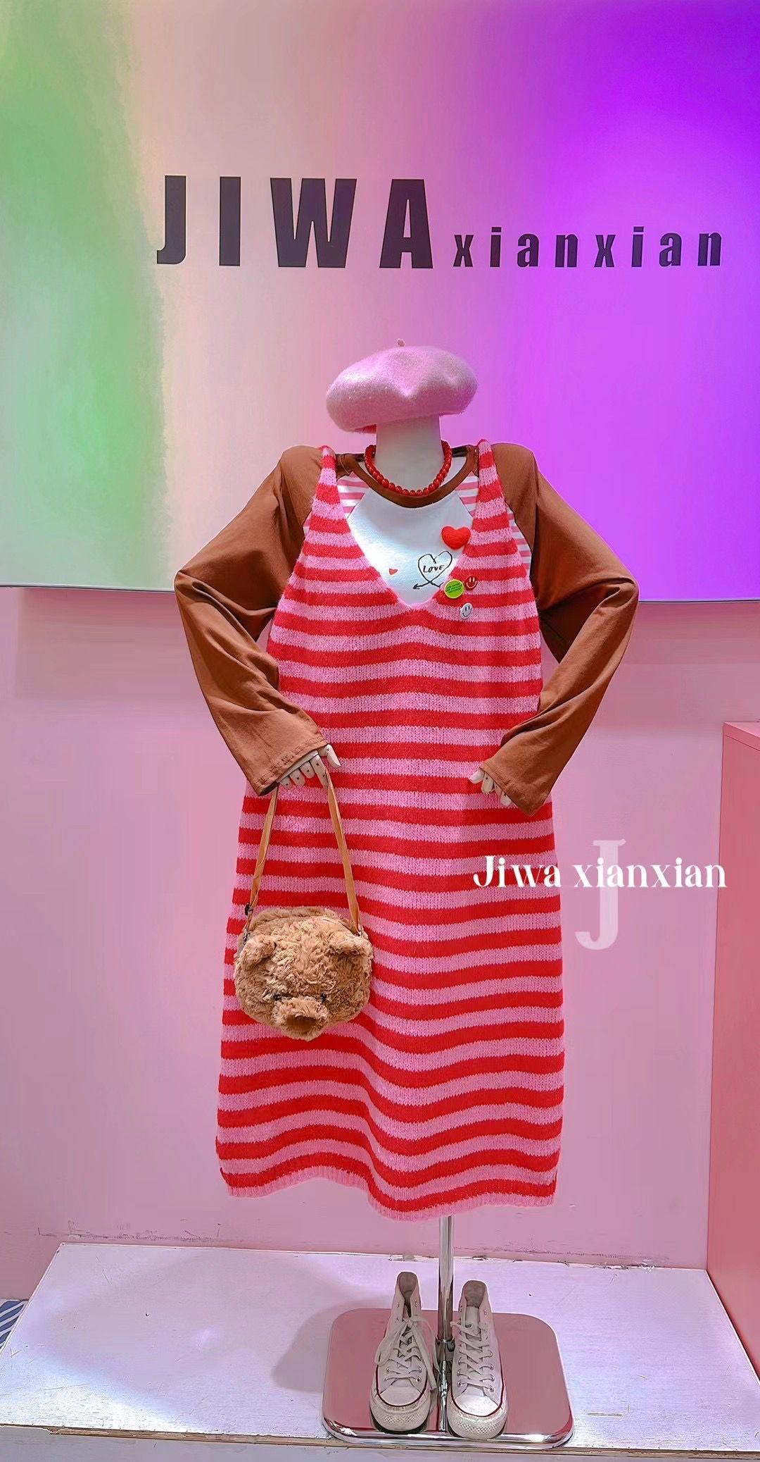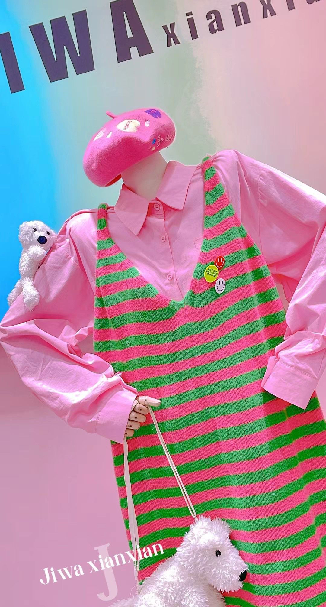 Ji Wa Xianxian мультфильм смайлик трехмерная пуговица подтяжка в полоску платье