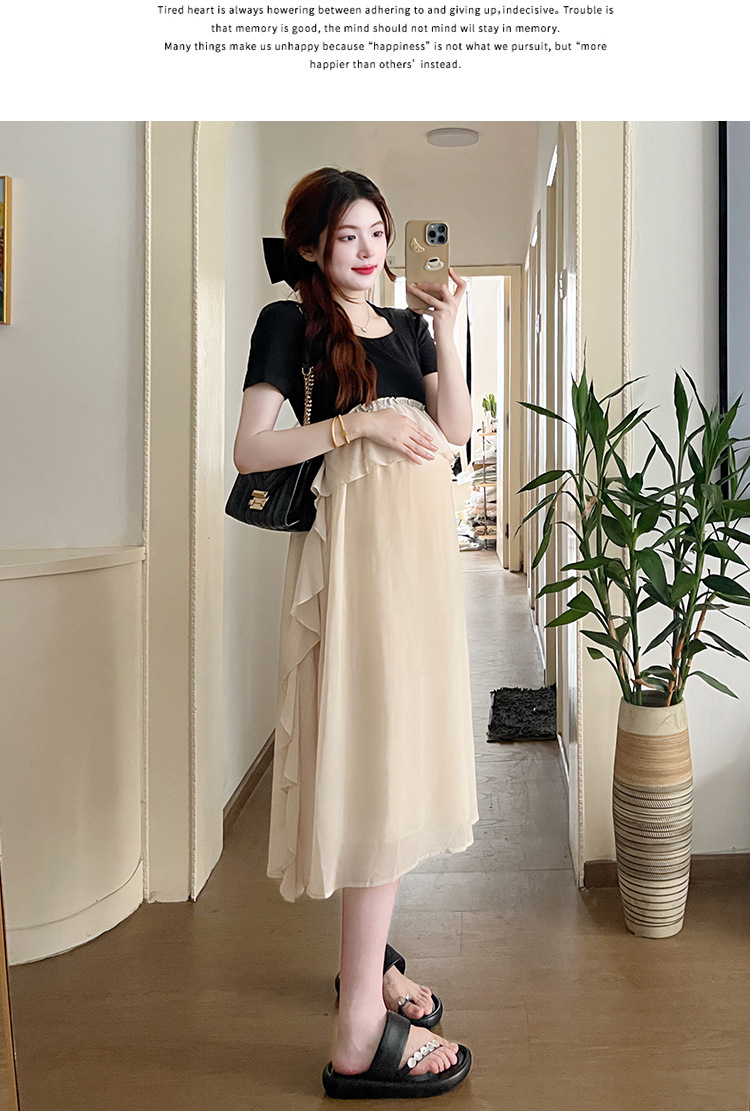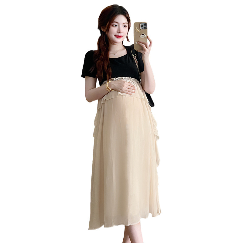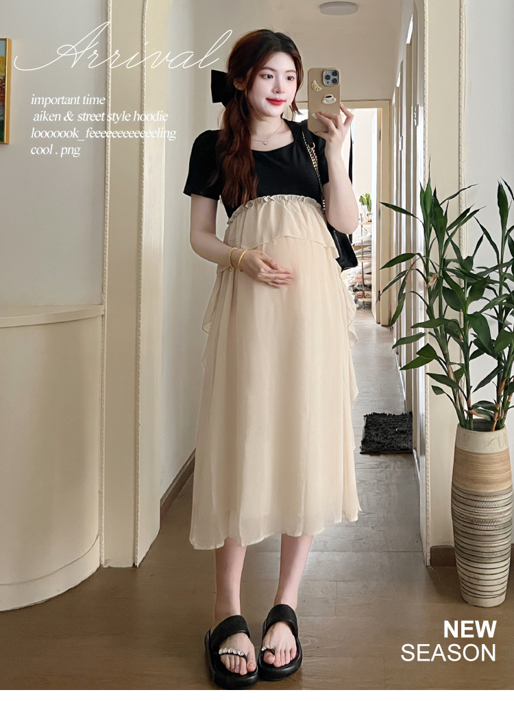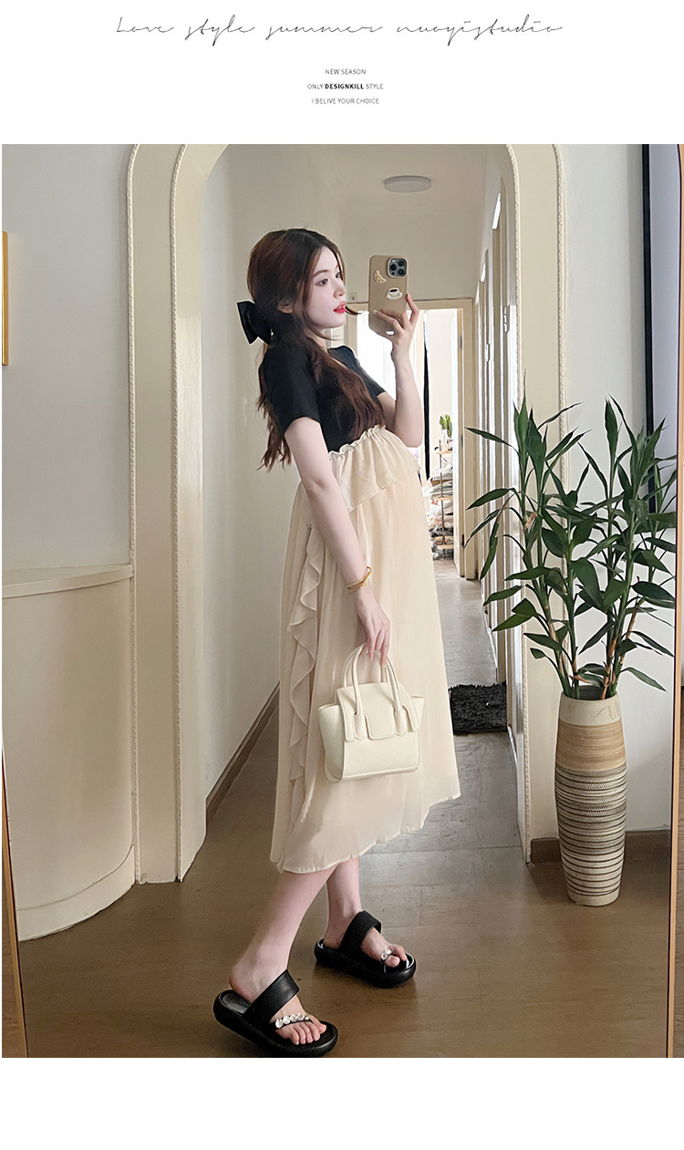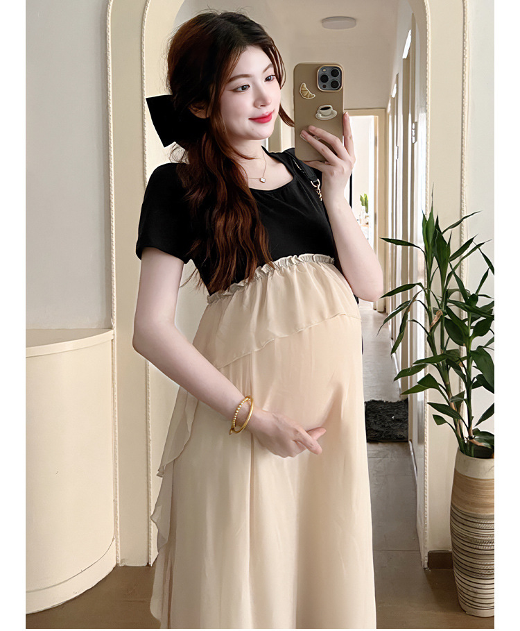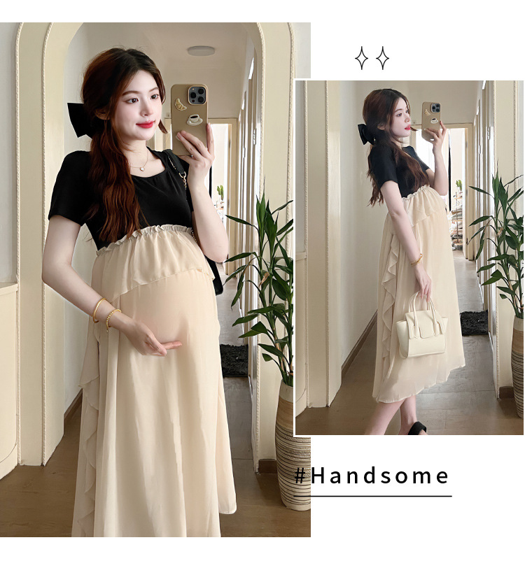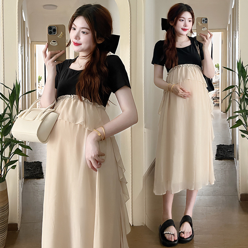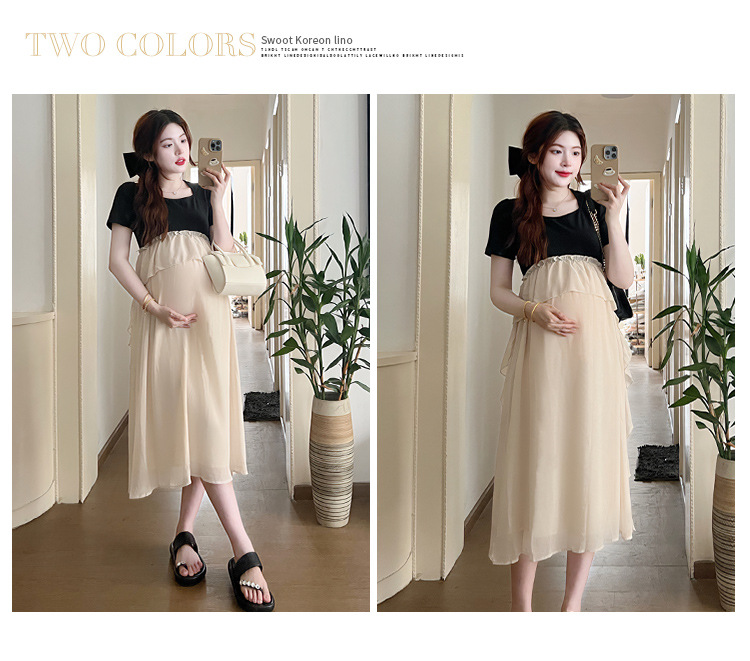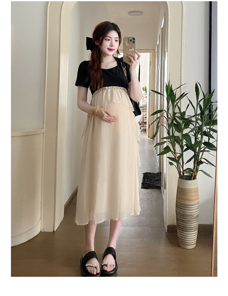 Одежда для беременных 2025 летняя новая маленькая корейская модная футболка сетка сращивание средней и длинной одежды для беременных