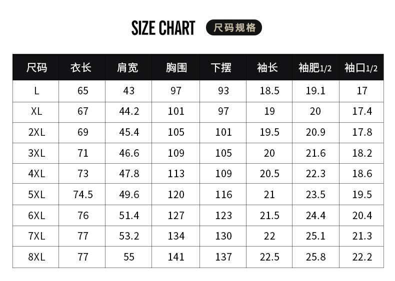 L; XL; XXL; 3XL; 4XL; 5XL; 6XL; 7XL; 8XL