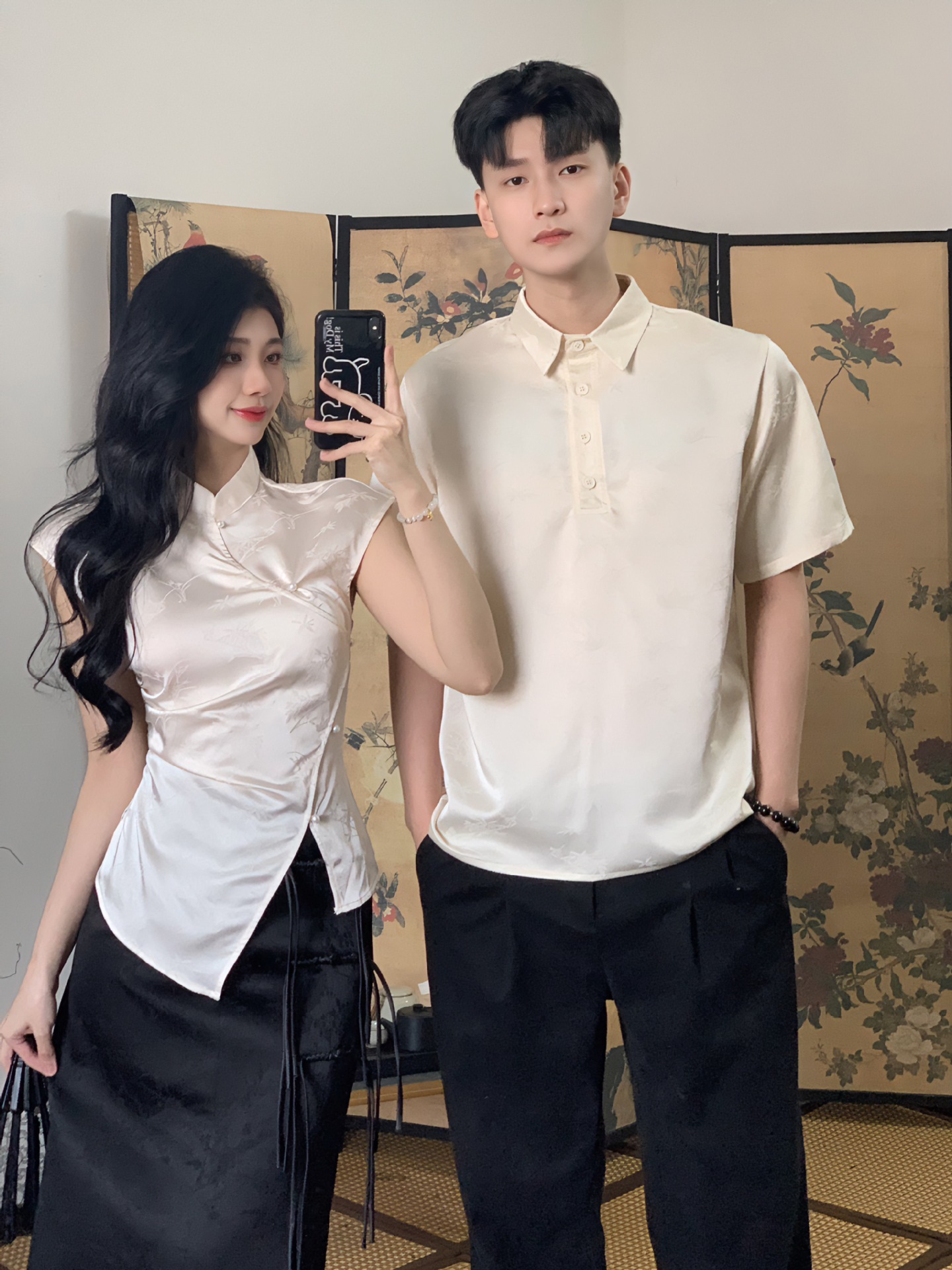 женские белые топы; Женская черная юбка; мужские рубашки