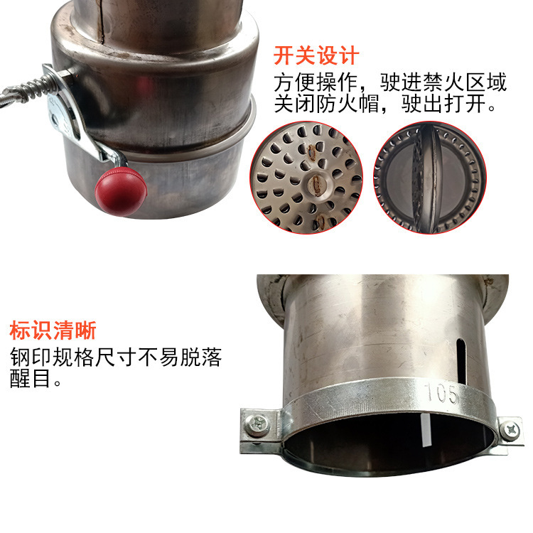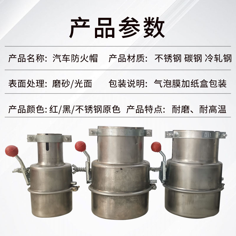 防火帽采用世界先进的涡流阀式结构,用夹紧箍固定于机动车排气管尾部,可长期配带,不腊故纹项影响排气。进入禁火区域时关闭防火阀门,驶出后开启。篮全在易燃品燃点较低浓度较大的场所,能够完全熄灭汽车排气管尾气中夹带的火花。是保障国家重点防火单位和一切运输车辆在易燃易爆区必配的安全防火重要产品。