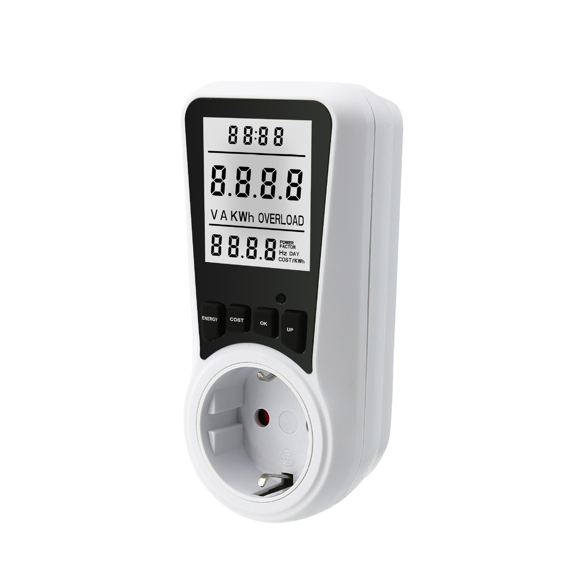 该仪表具有清晰的 LCD 显示屏,可以读取伏特、瓦特、安培和千瓦时。电价可用于计算设备的总用电量成本。产品可以满足德、英、澳、美、法、意大利、以色列、比利时、丹麦、南非、巴西等不同国家标准定制