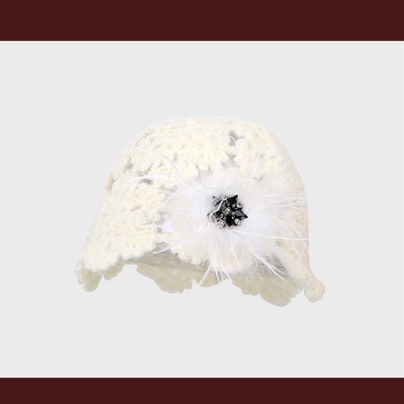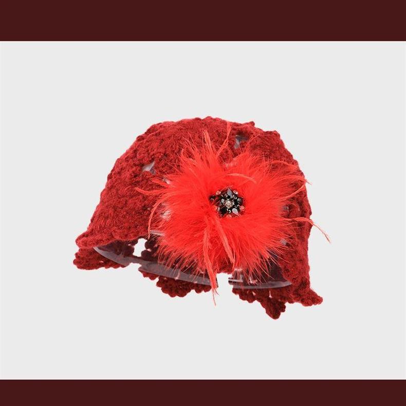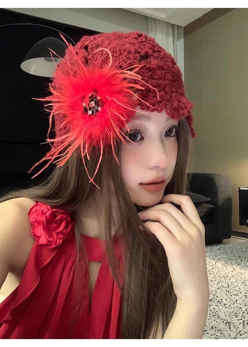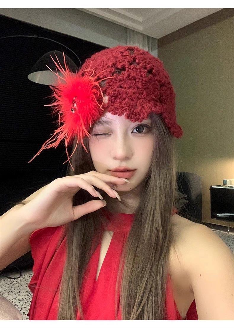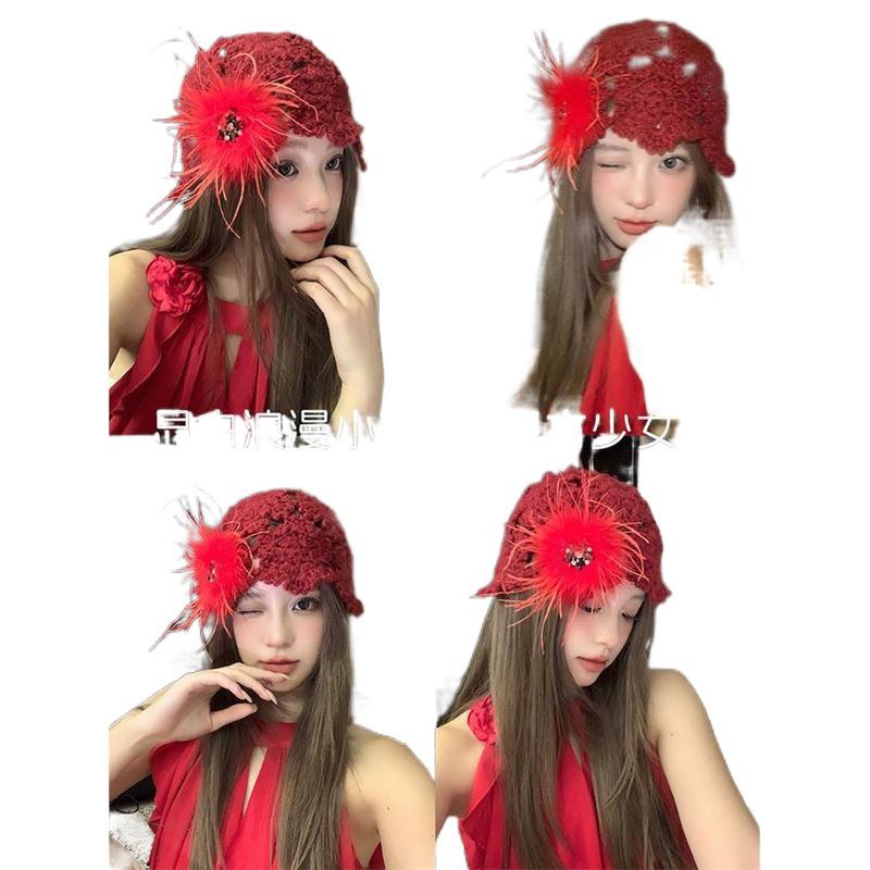 2024 новый дизайнер ручной работы с красными перьями с полыми сумками шляпа женская весна и осень Сладкая вязаная шапка