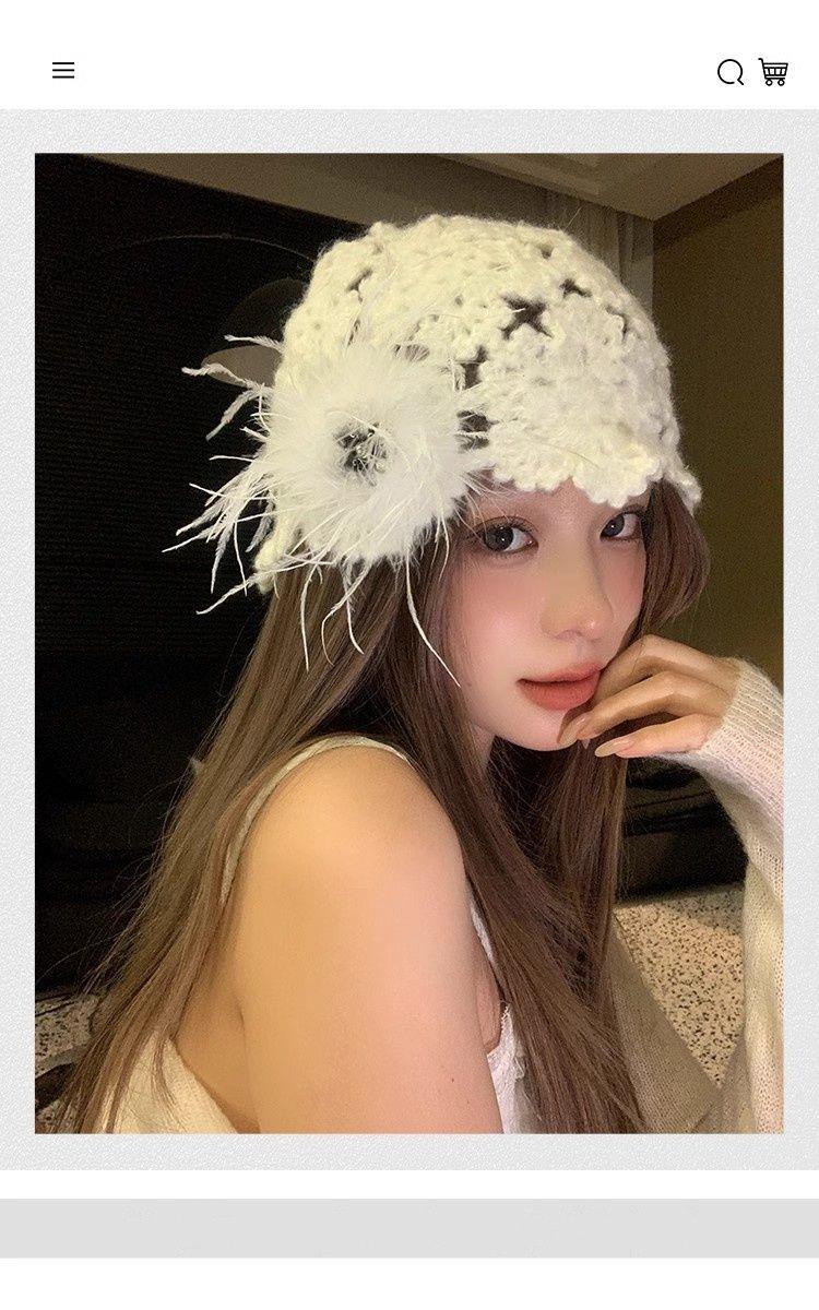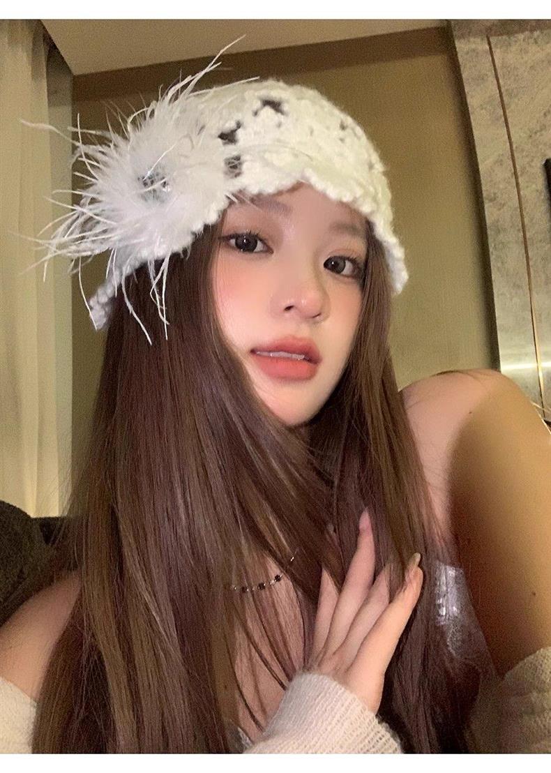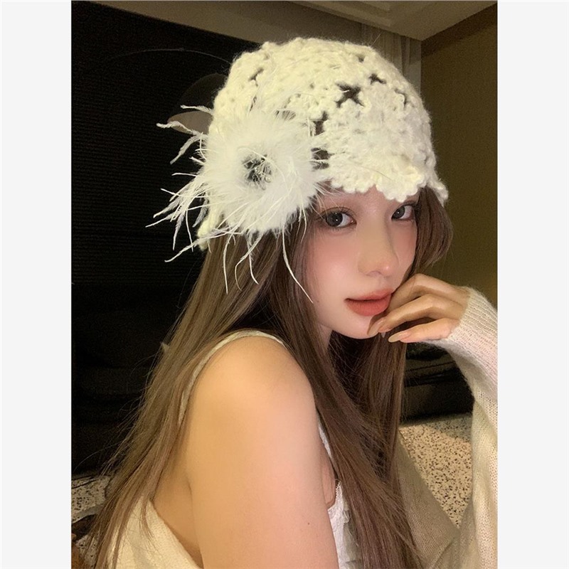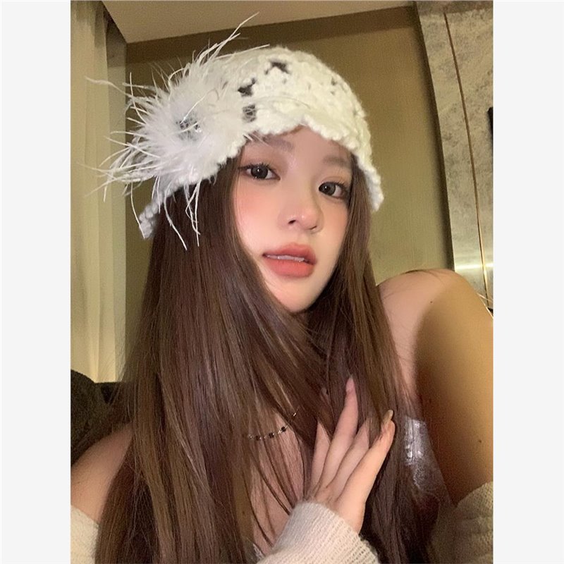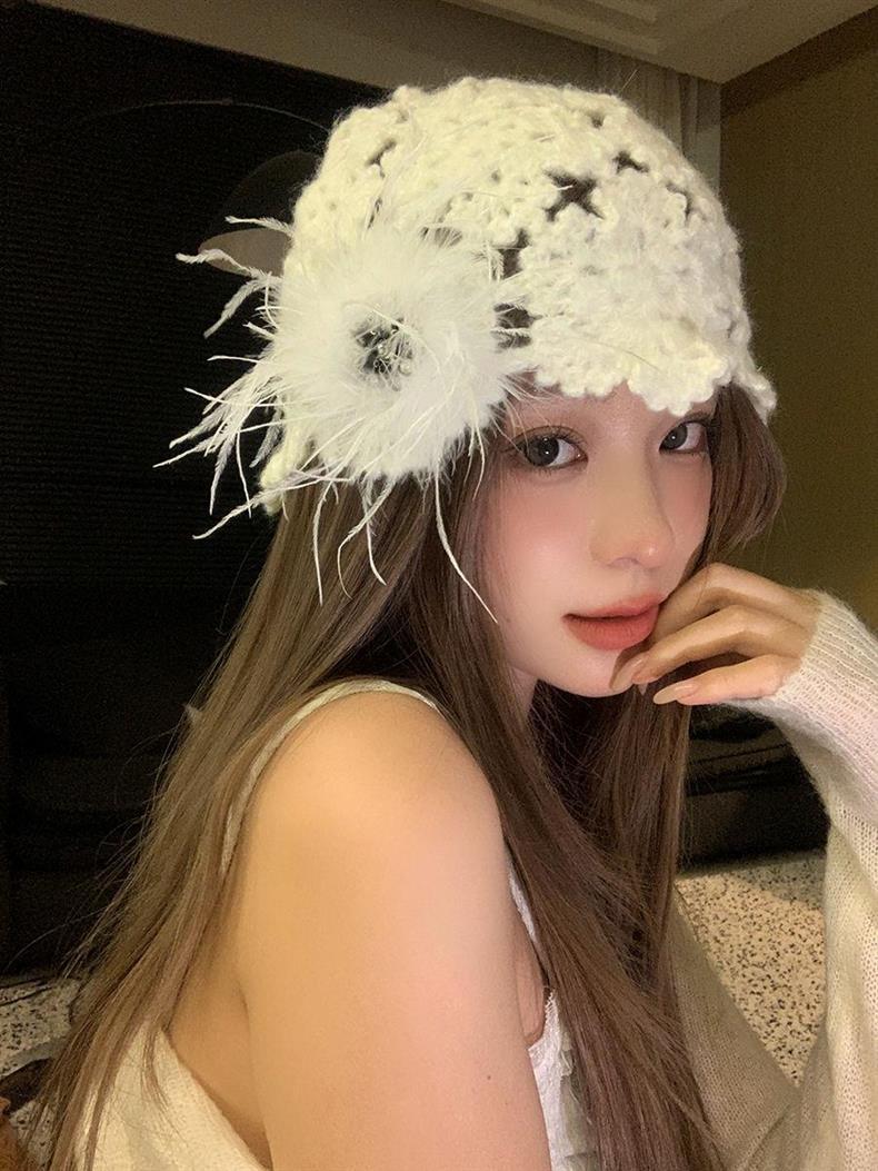 2024 новый дизайнер ручной работы с красными перьями с полыми сумками шляпа женская весна и осень Сладкая вязаная шапка
