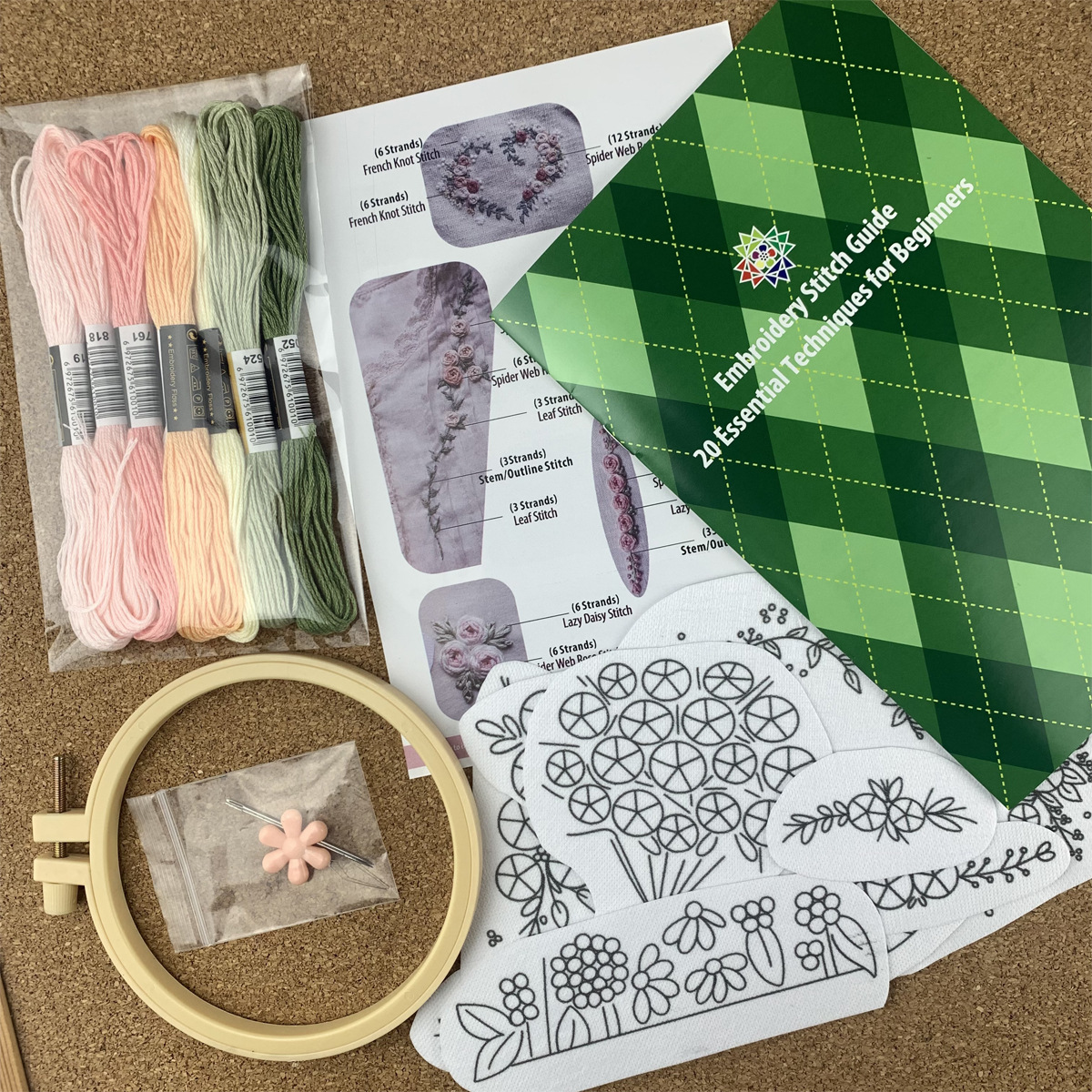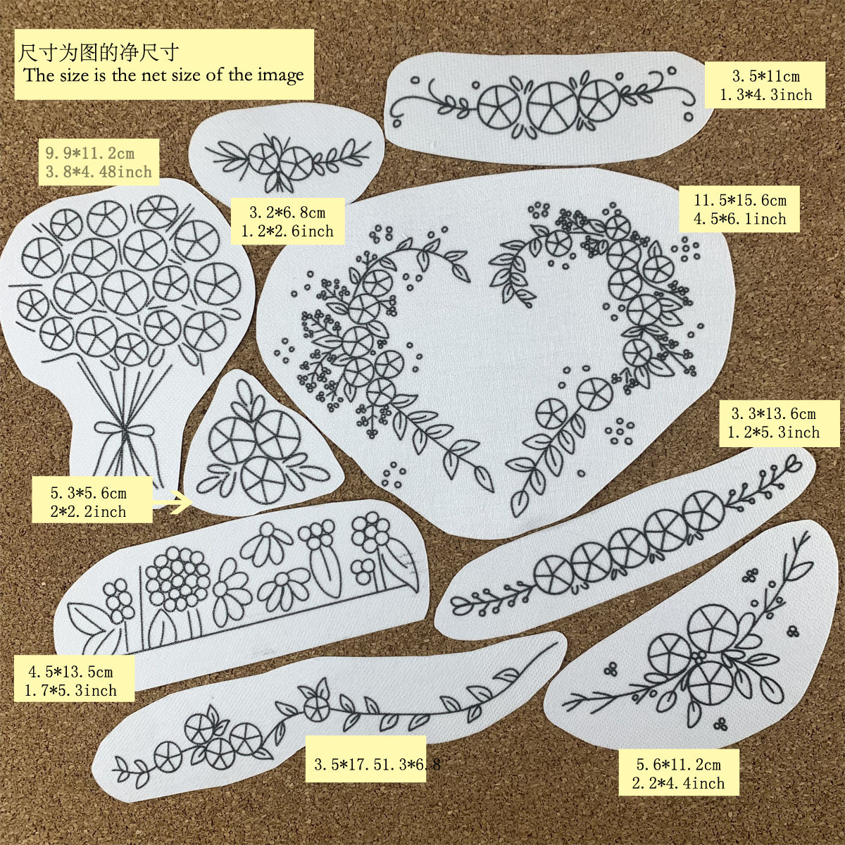 产品明细:9张 50克加厚高品质冷水溶无纺布 9个款式+8色特配色绣线+2根5cm刺绣针+1个粉色小花穿线器+12cm仿竹绣绷+一份英文说明+一本刺绣针法册子+OPP袋