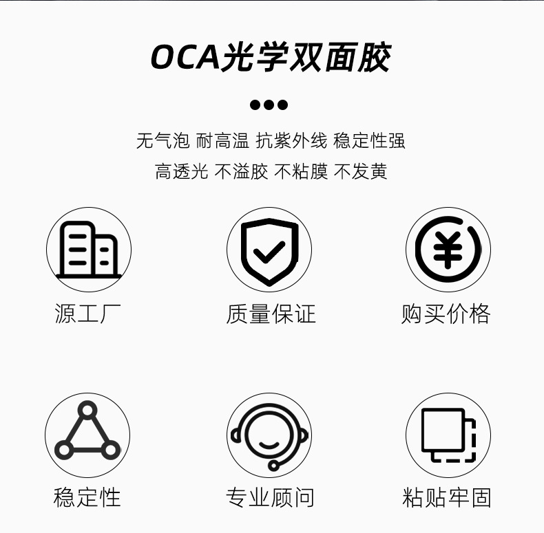 Устойчивый к высоким температурам базовый материал. Оптическая двусторонняя лента OCA подходит для пузырьков без высокопрозрачной двусторонней ленты, подходящая для клея для сенсорного экрана.