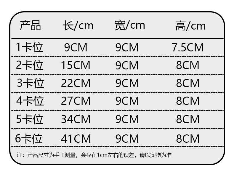 9*9*7,5 см, 1 слот для карты, сумка для хранения часов; 15*9*8 см сумка для хранения часов с 2 слотами для карт; 22*9*8 см сумка для хранения часов с 3 слотами для карт; 27*9*8 см сумка для хранения часов с 4 слотами для карт; 34*9*8 см сумка для часов на 5 карт; 41*9*8 см сумка для хранения часов с 6 слотами для карт; Специальная губка для сумки для часов.