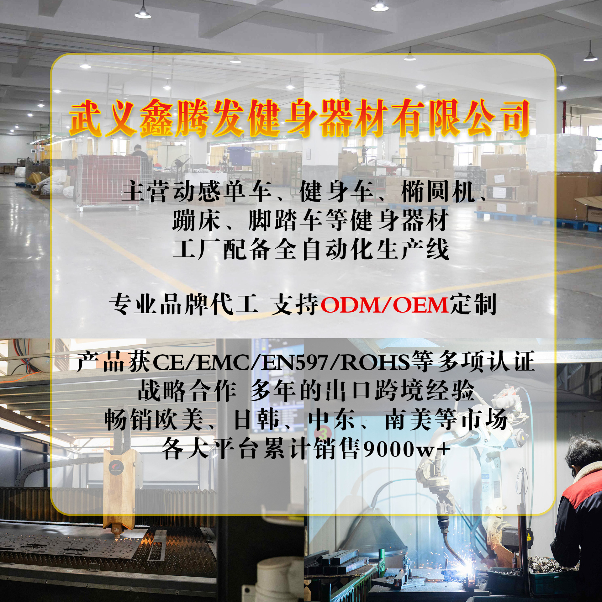 工厂主营动感单车、健身车、脚踏车、椭圆机、蹦床、登山机、力量训练器材、抖抖机、电动椭圆机、电动爬楼机等多类目家用健身器材,满足不同市场需求。配备全自动化生产线,日产1000+台。