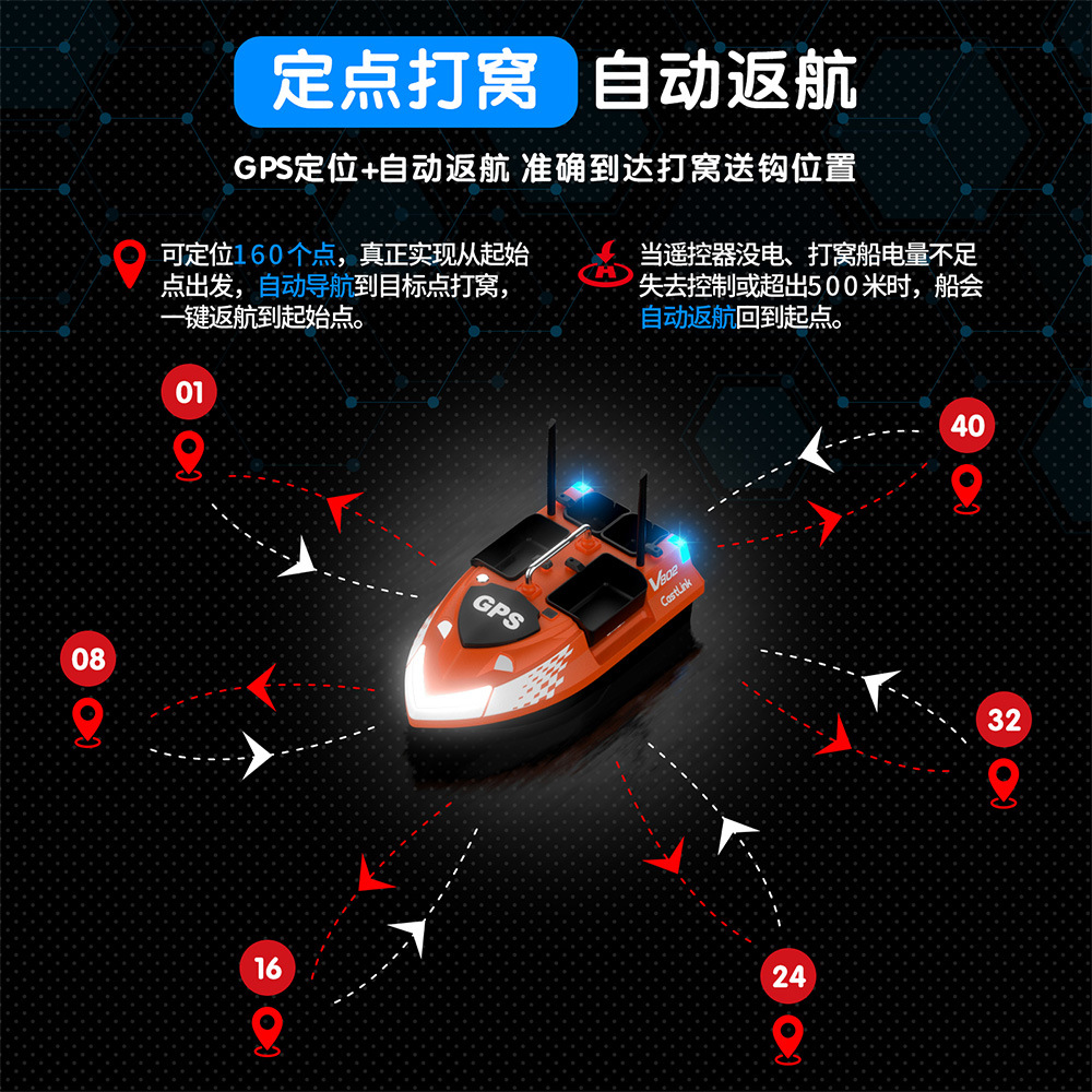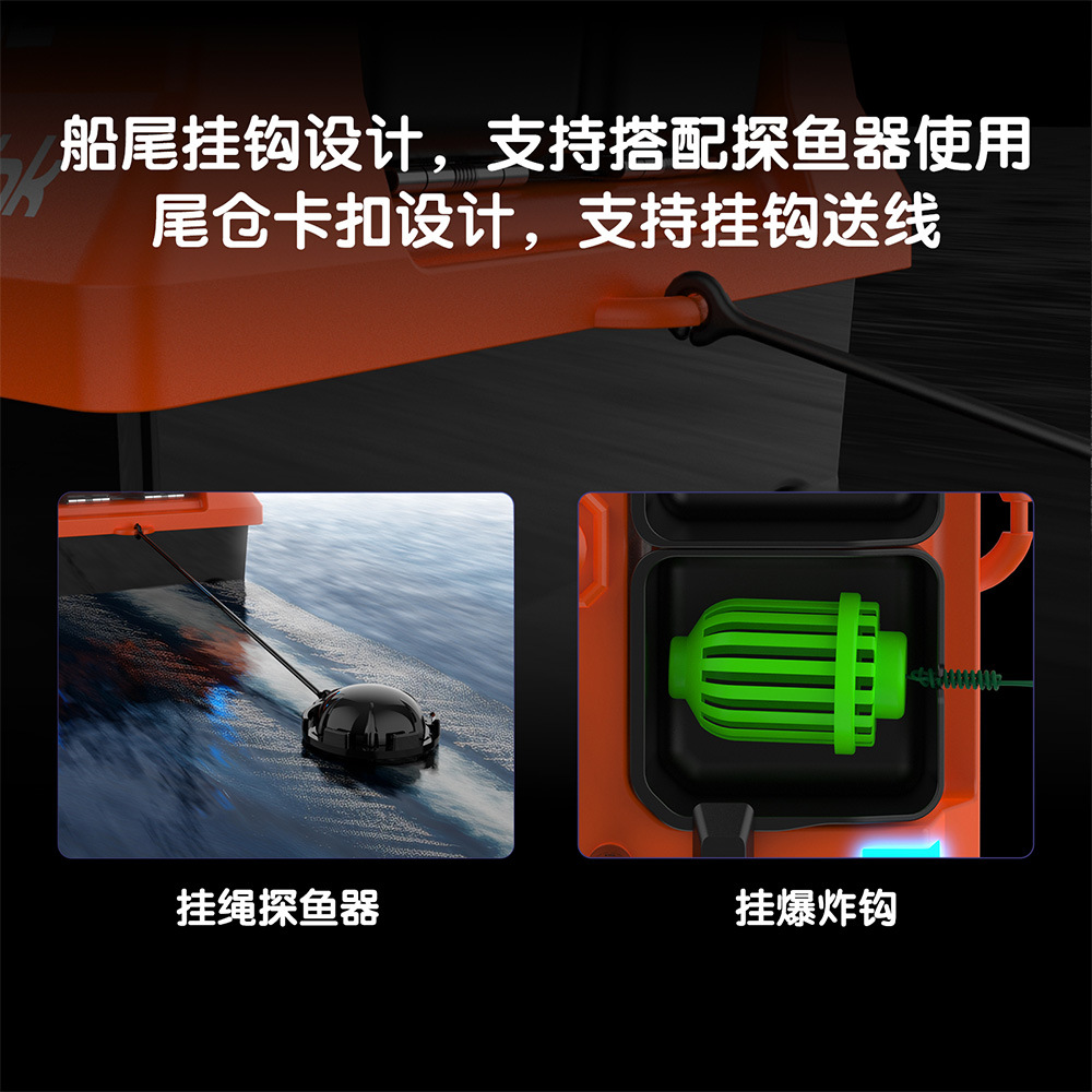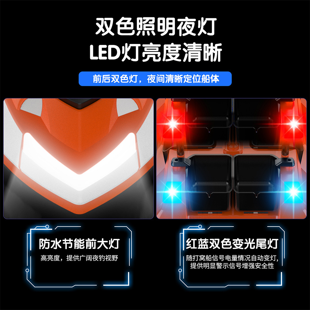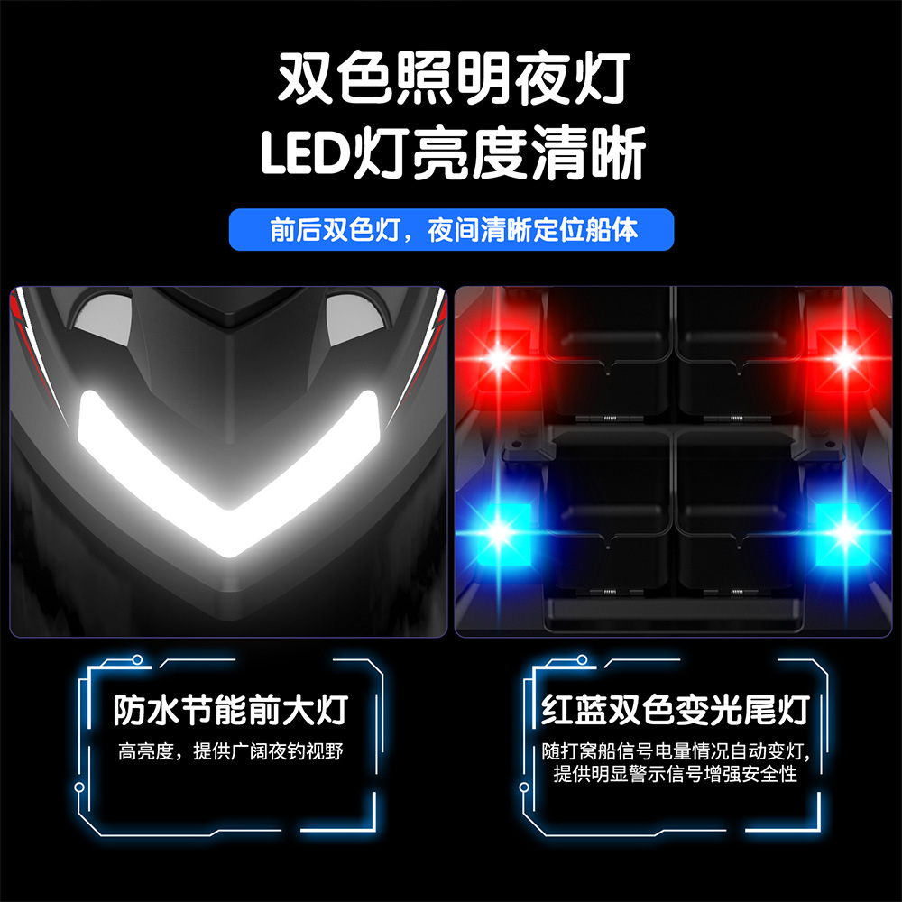 8.船头高亮夜航灯、船尾转向提示灯;两种灯光模式(常亮/闪烁)