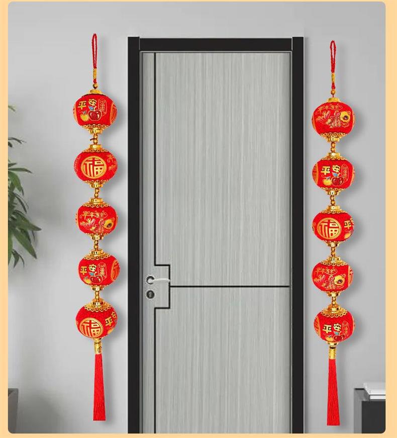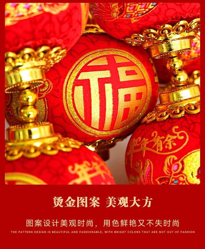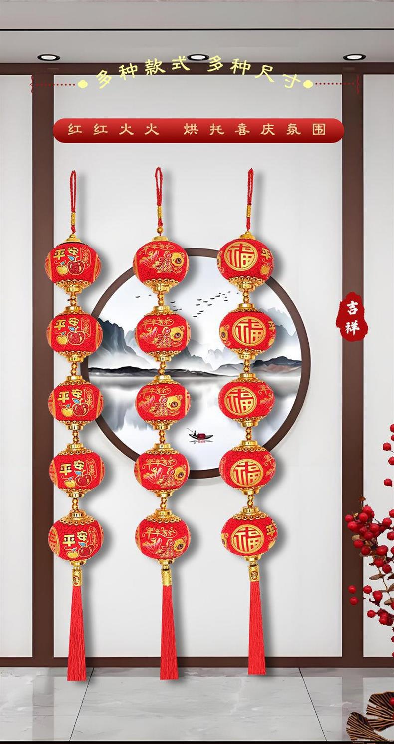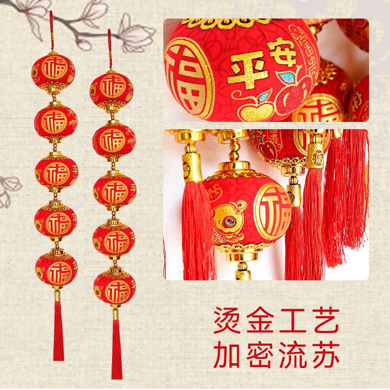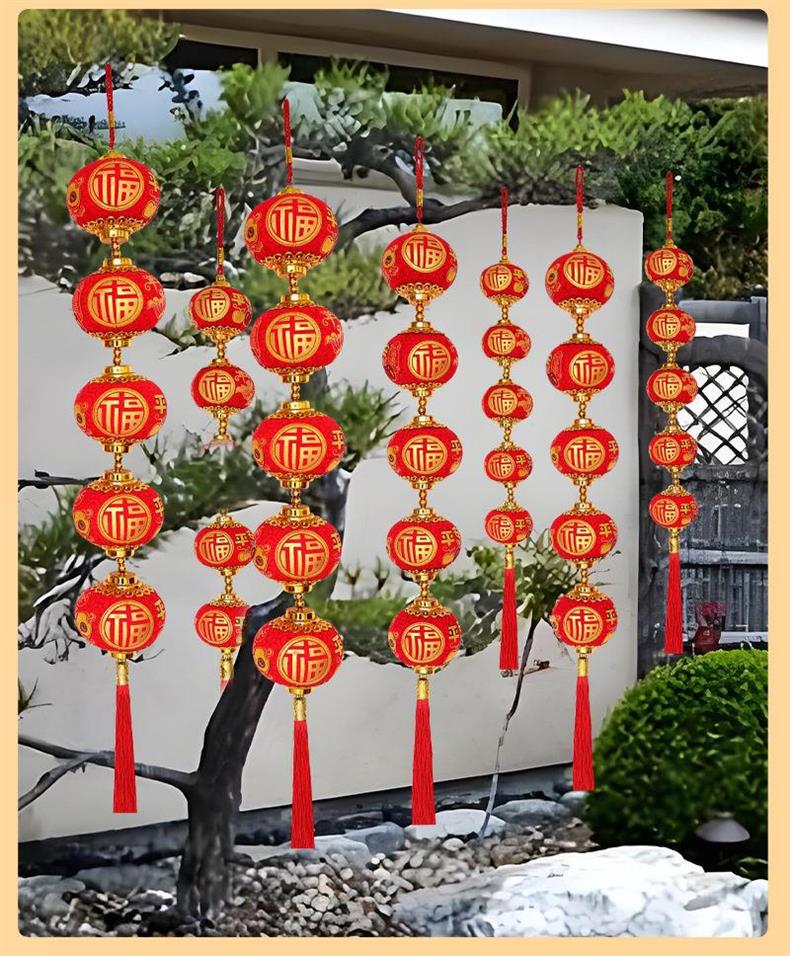 Маленький одиночный фонарь с благословляющим персонажем - стандартный; Одиночный фонарь среднего размера с благословляющим персонажем - стандартный; Большой одиночный фонарь с благословляющим персонажем - стандарт; Нить из пяти шариков со словом благословение - стандарт; Нить из пяти шариков со словом благословение посередине - стандарт.; Нить из пяти шариков с надписью благословение большого размера - стандарт; Пара труб с пятью шариками и надписью «Фу» - стандарт.; Пара шаров среднего размера с пятью шариками и благословляющими символами - стандарт.; Пара больших чисел с пятью шариками и словом «Фу» — стандарт.