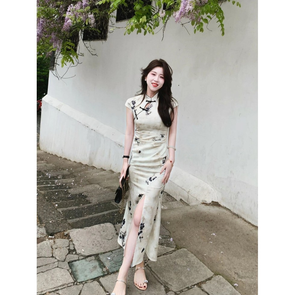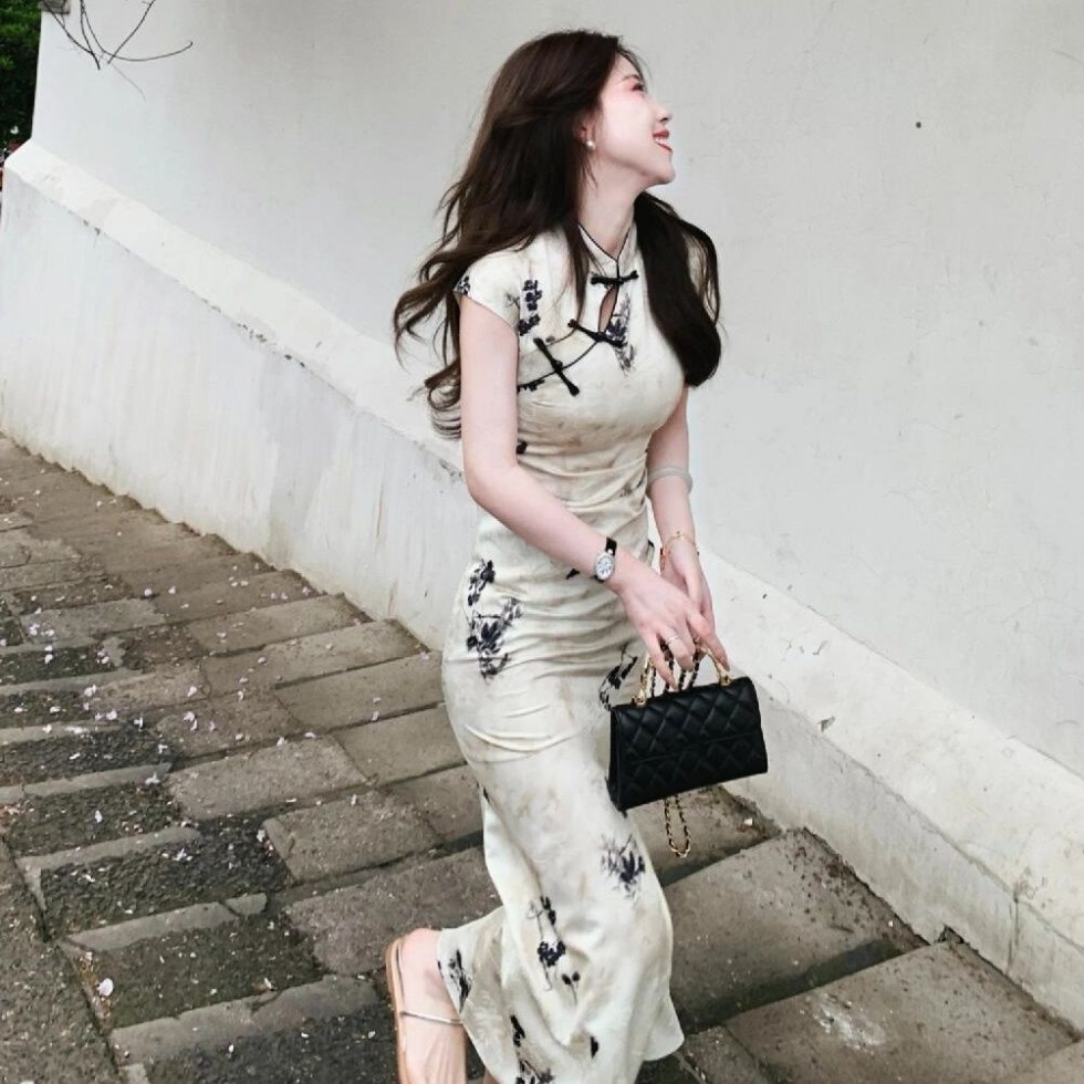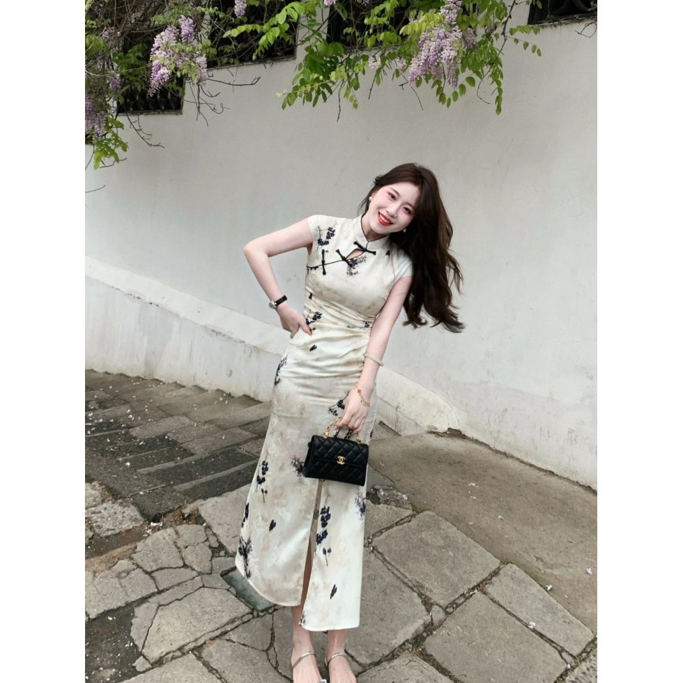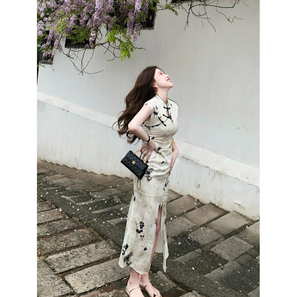 Молодая девушка улучшенный чонсам женский 2025 лето новый ретро темперамент элегантный высокий смысл длинное маленькое платье