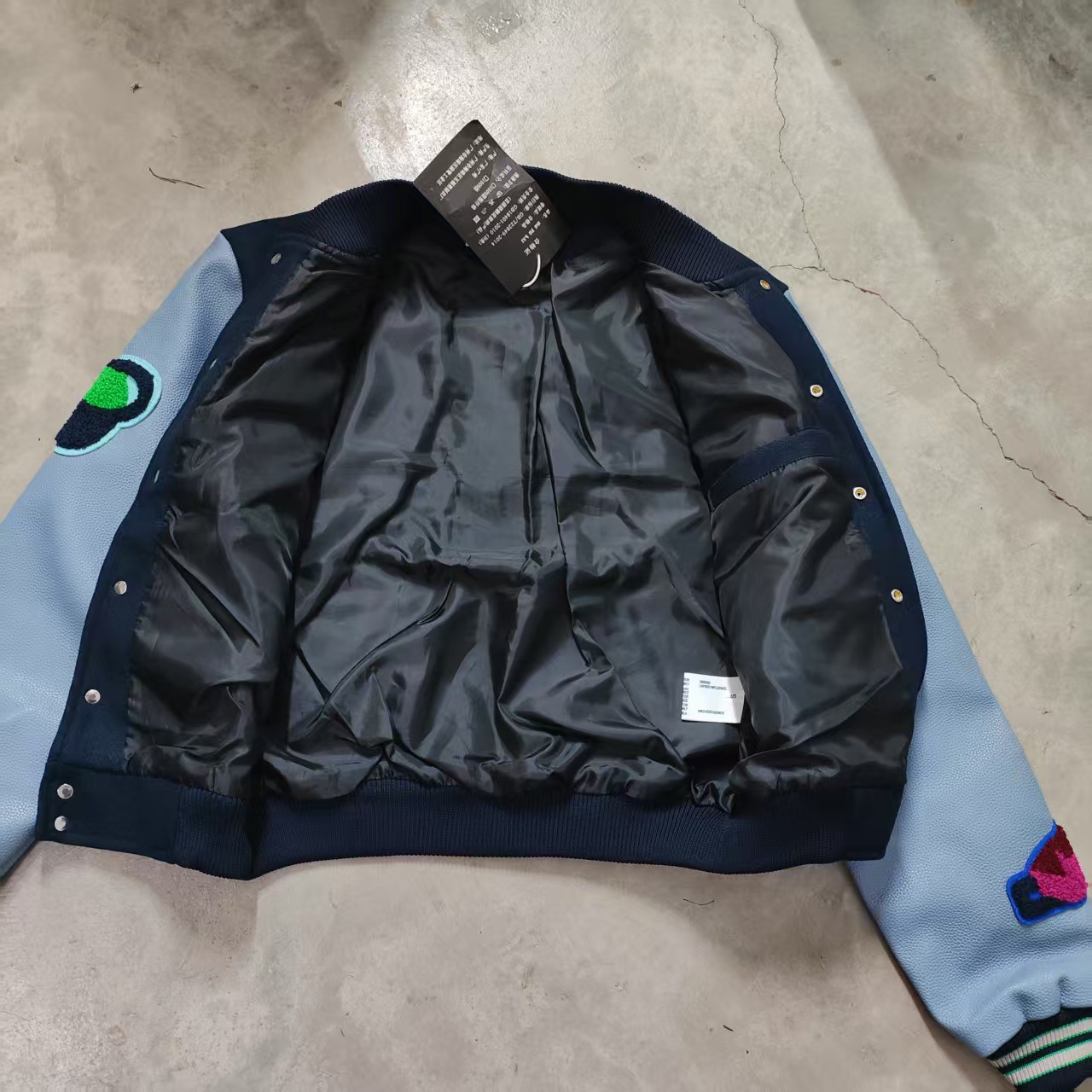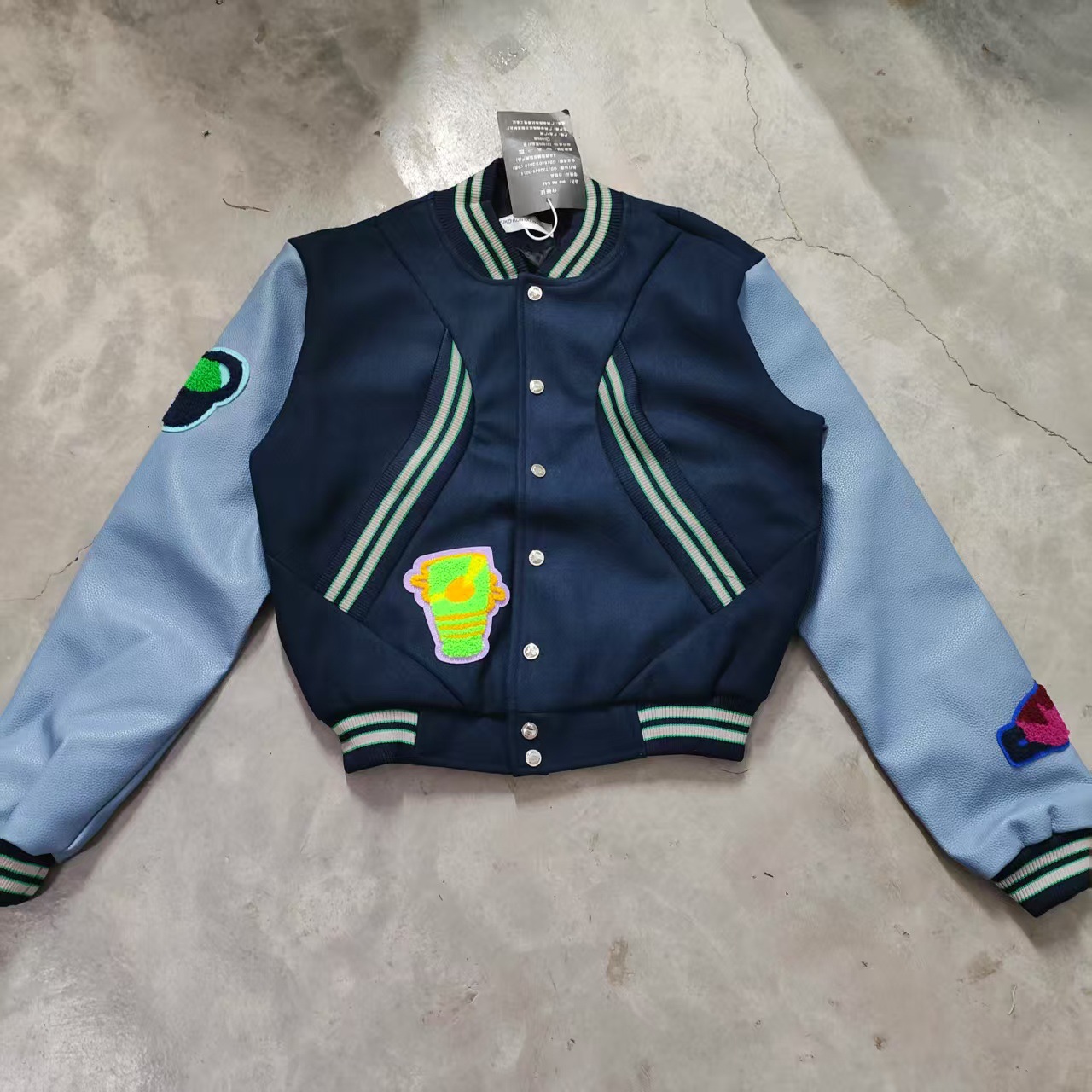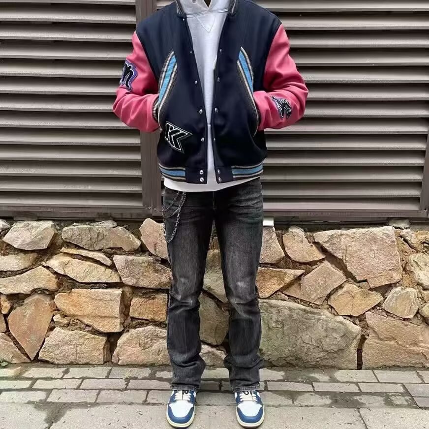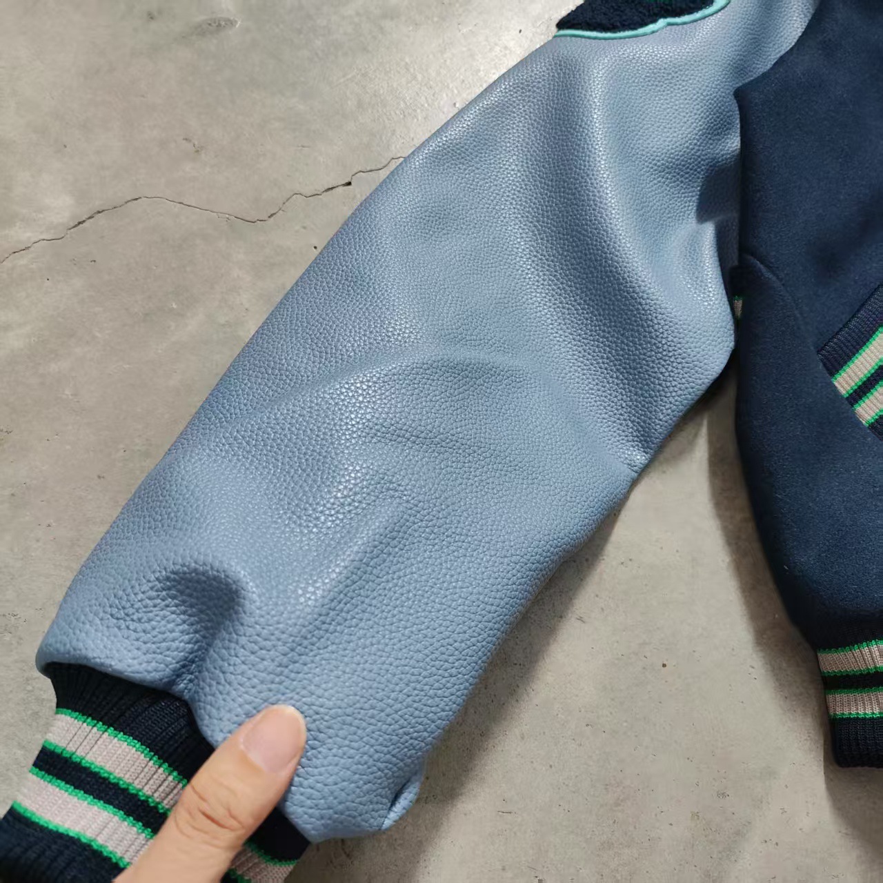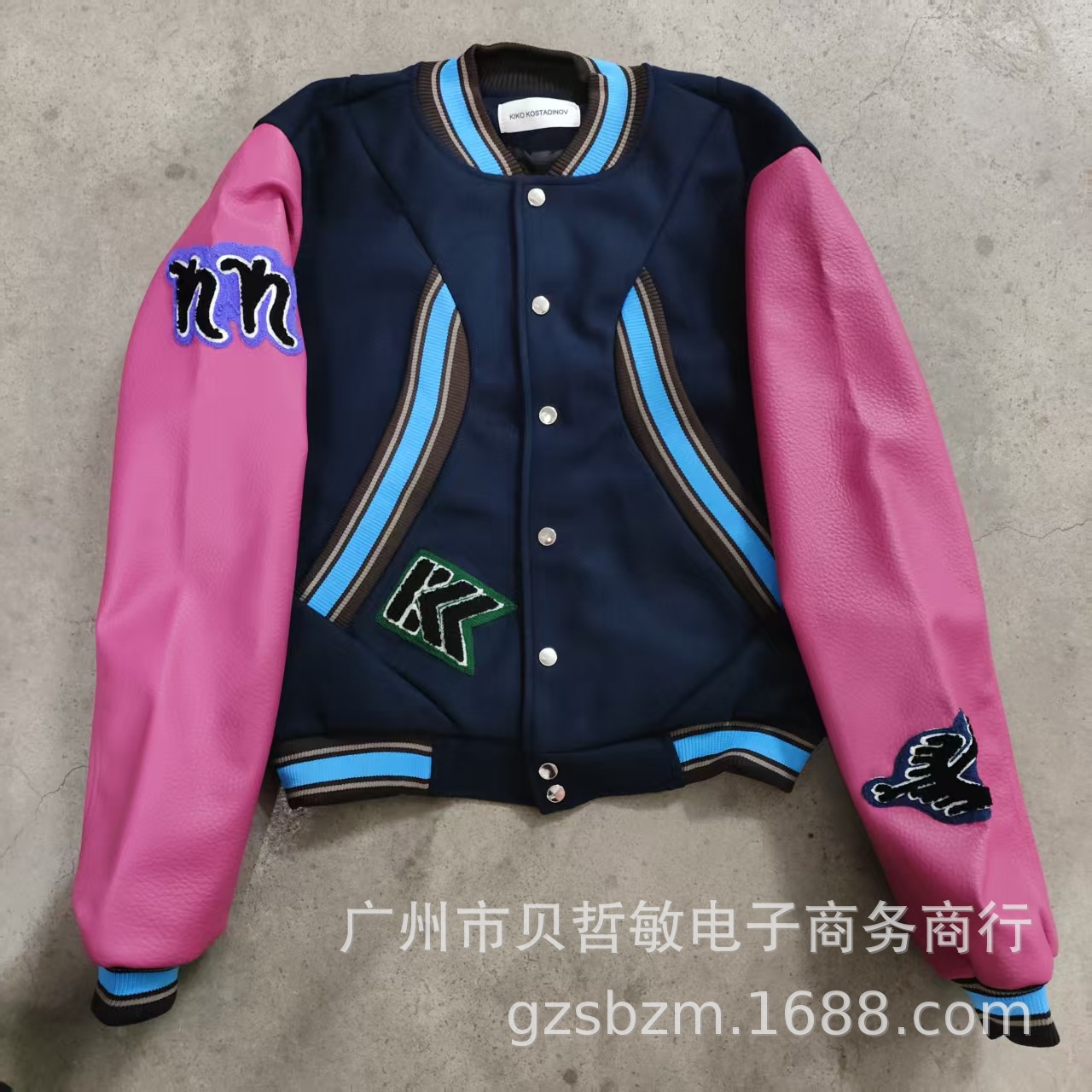 Американский ретро синий кожаный рукав сшитый бейсбольный костюм весной и осенью High Street KIKO вышивка шерстяная короткая куртка бейсбольный костюм