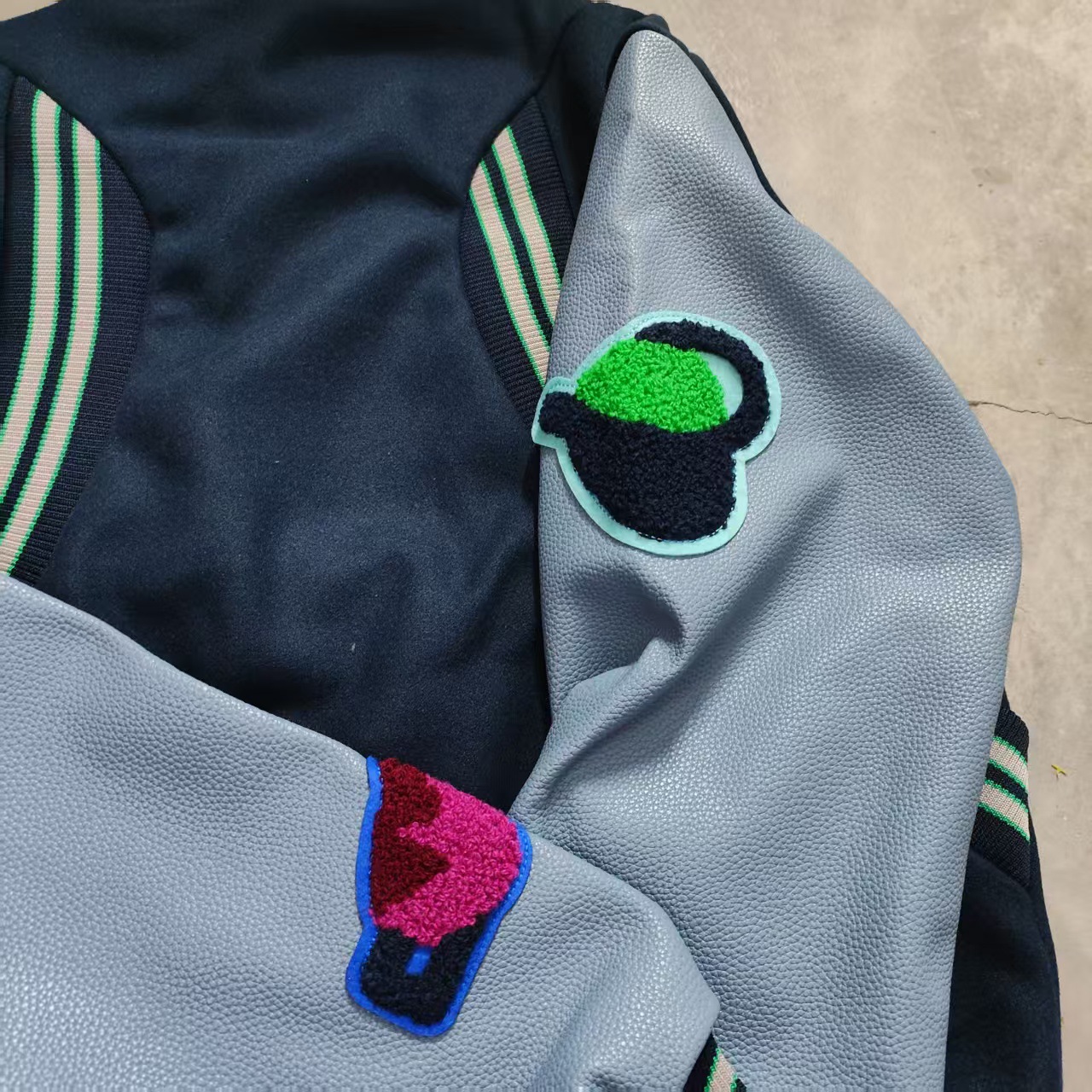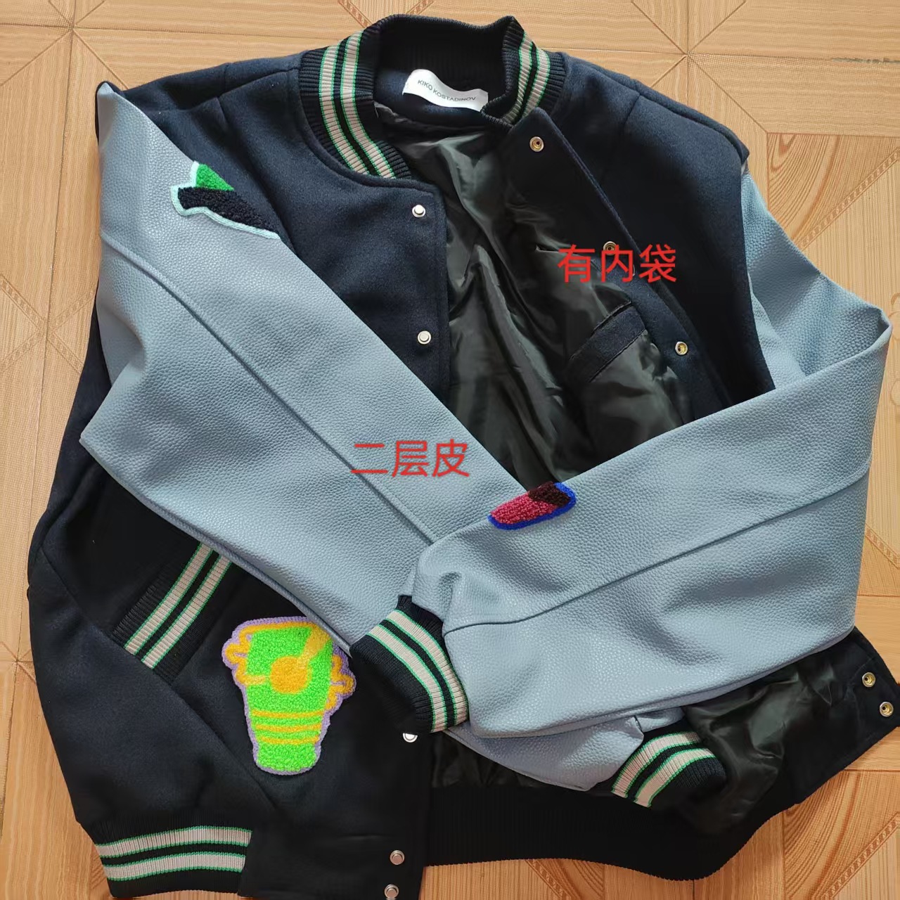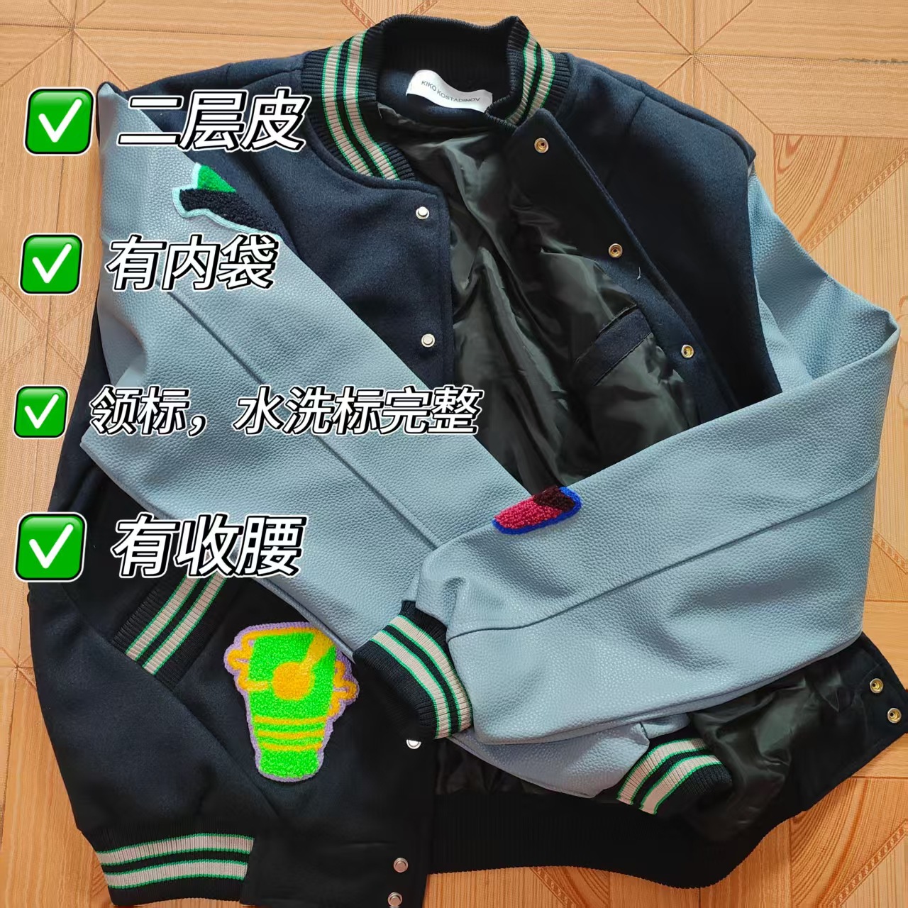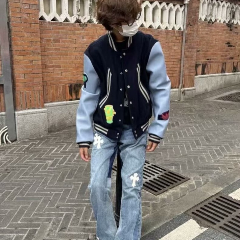 Американский ретро синий кожаный рукав сшитый бейсбольный костюм весной и осенью High Street KIKO вышивка шерстяная короткая куртка бейсбольный костюм