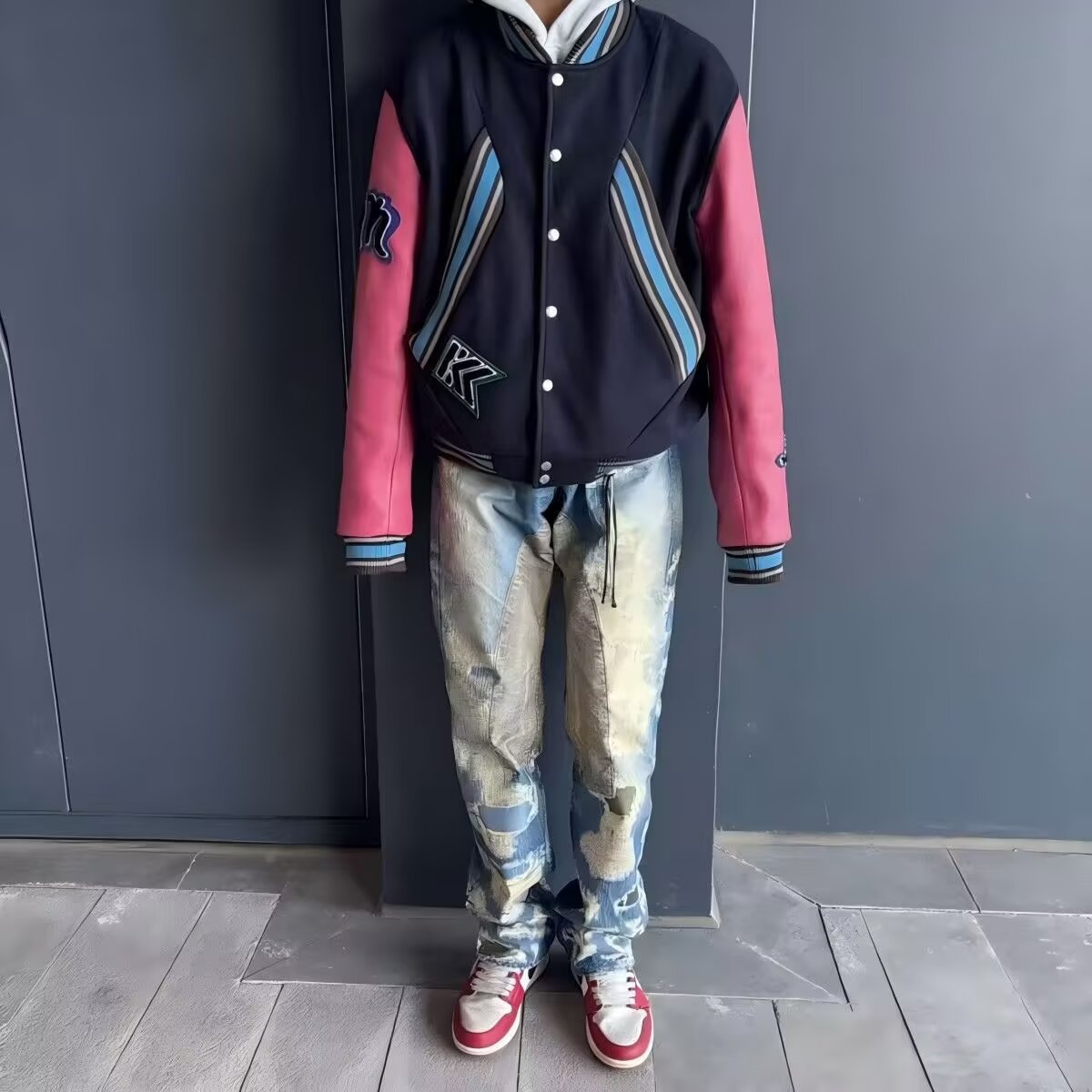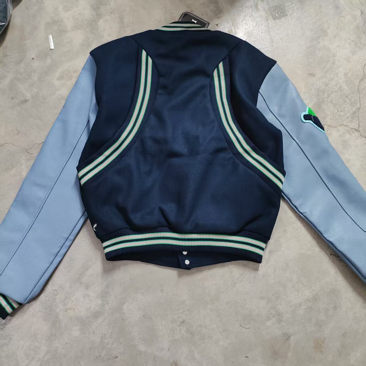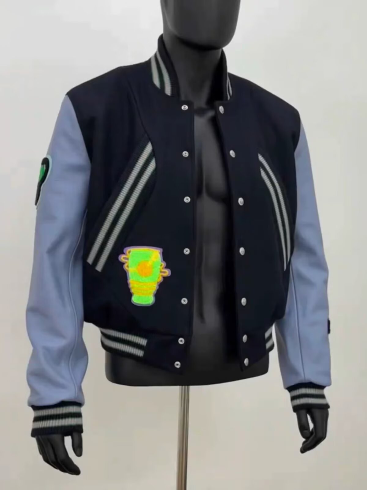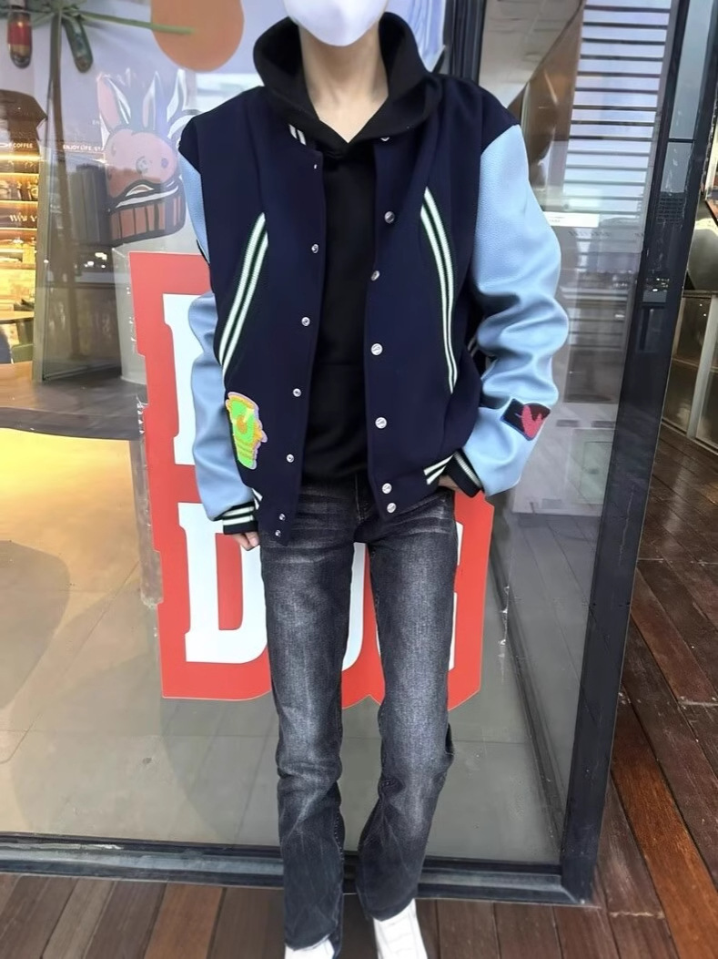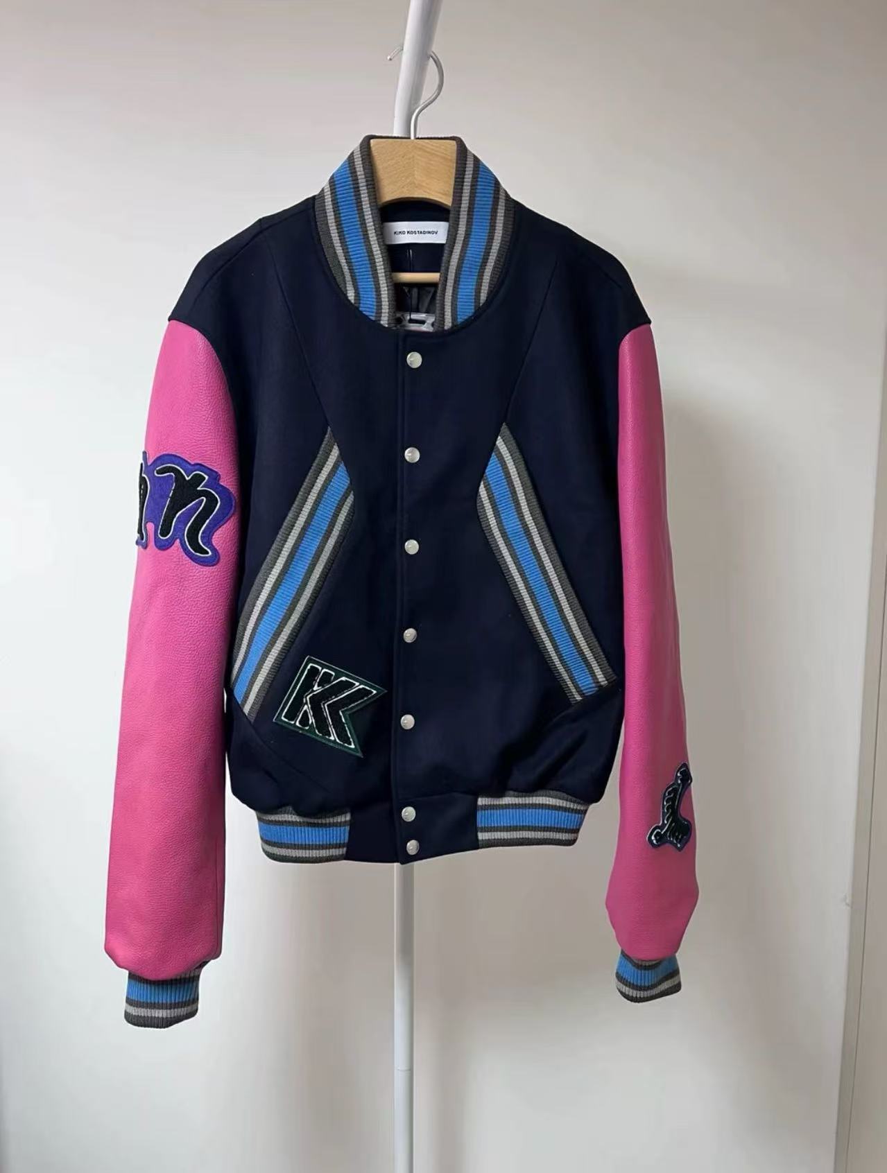 Американский ретро синий кожаный рукав сшитый бейсбольный костюм весной и осенью High Street KIKO вышивка шерстяная короткая куртка бейсбольный костюм