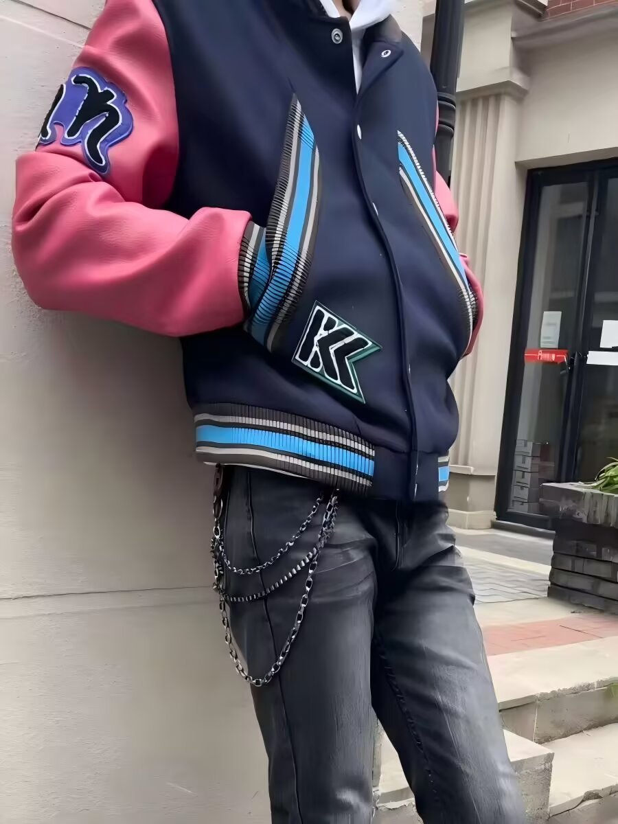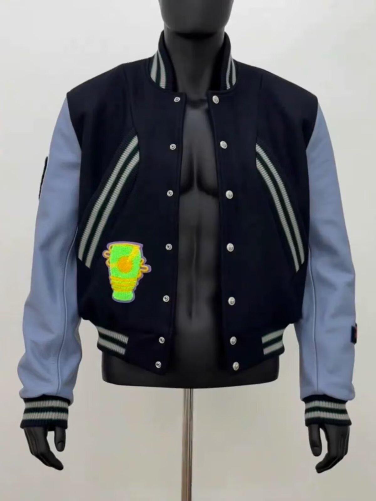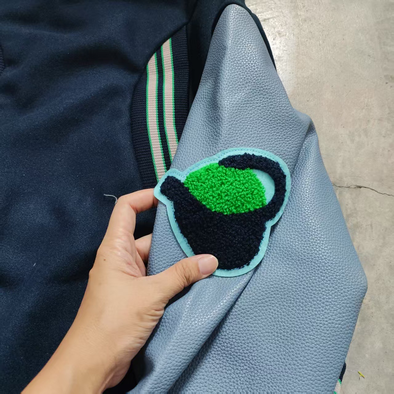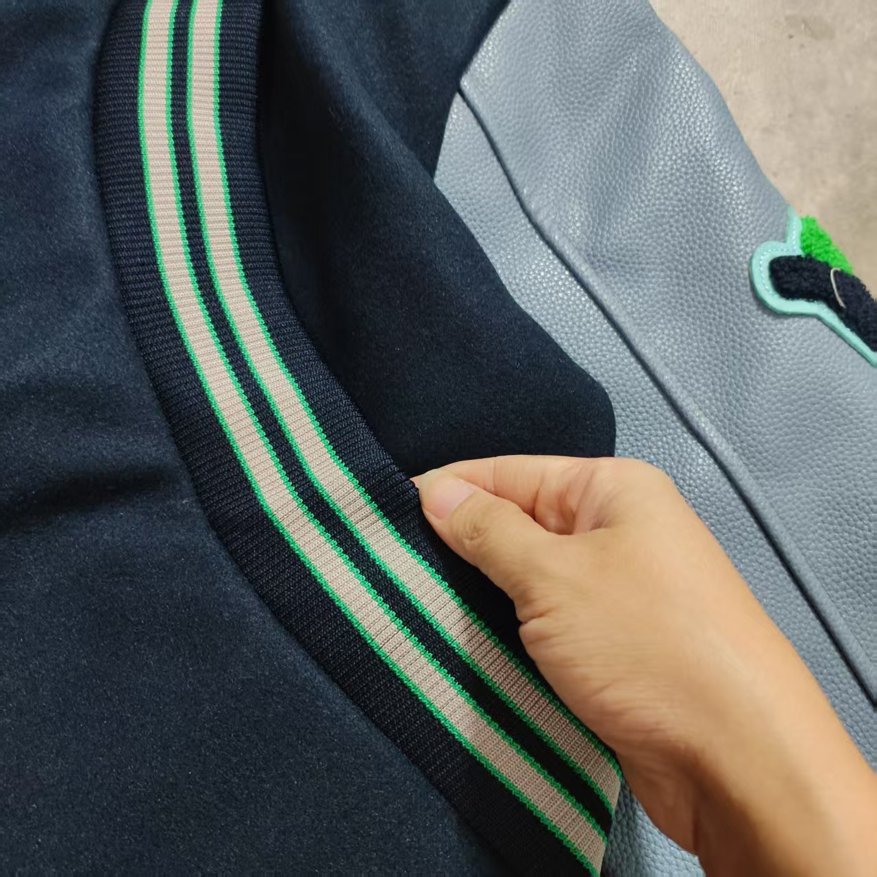 Американский ретро синий кожаный рукав сшитый бейсбольный костюм весной и осенью High Street KIKO вышивка шерстяная короткая куртка бейсбольный костюм