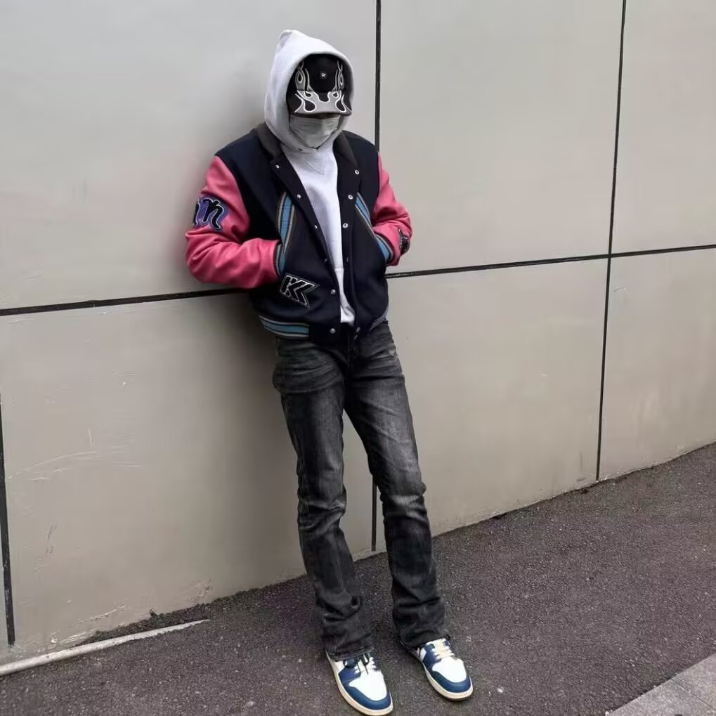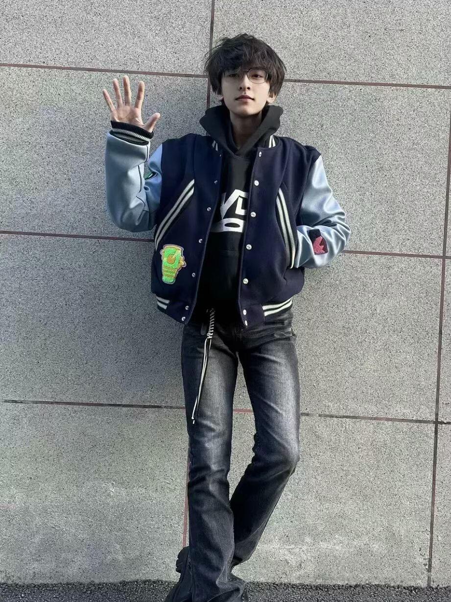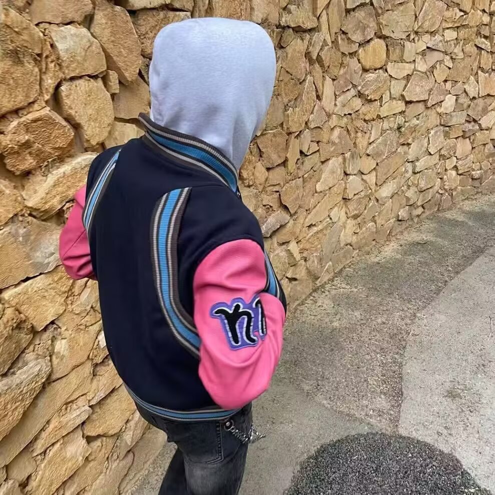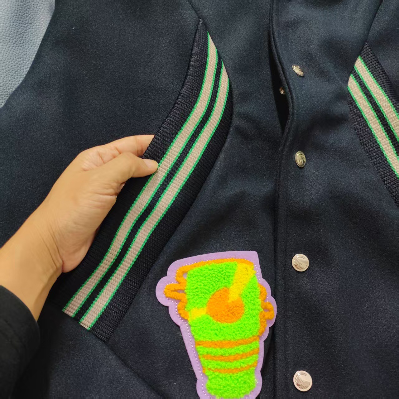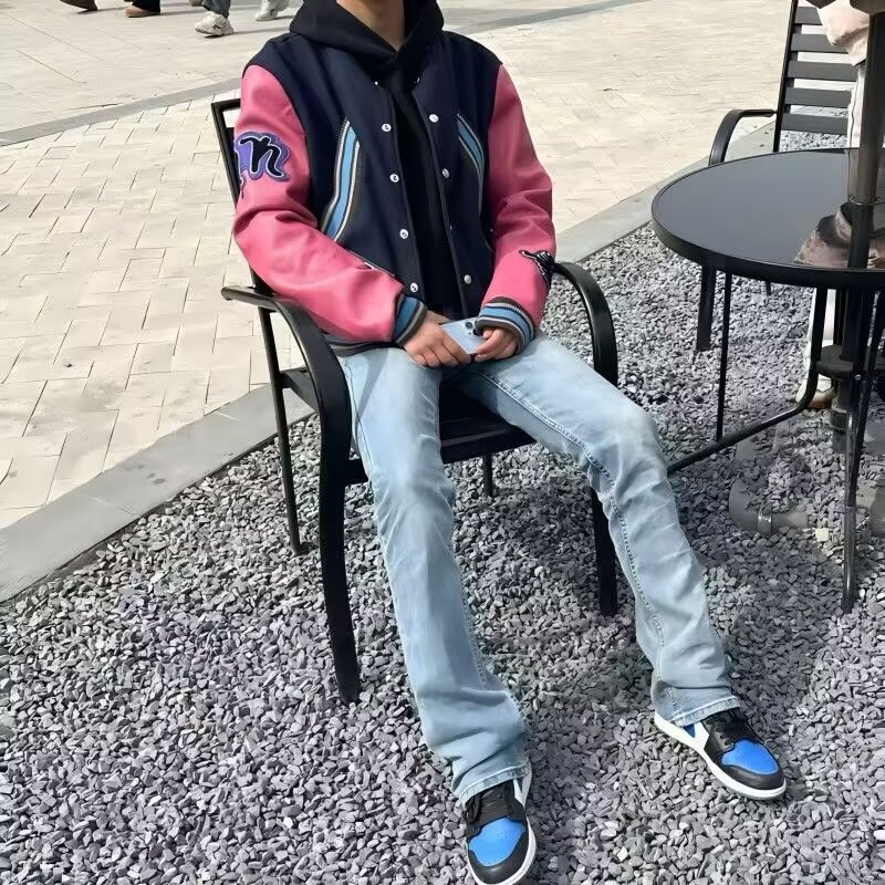 Американский ретро синий кожаный рукав сшитый бейсбольный костюм весной и осенью High Street KIKO вышивка шерстяная короткая куртка бейсбольный костюм