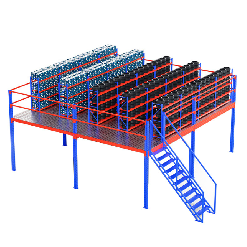 Стеллажи для склада из стальных конструкций, усиленные, двухъярусные, с мезонинной платформой, для промышленных объектов, с возможностью индивидуальной настройки и разборки.