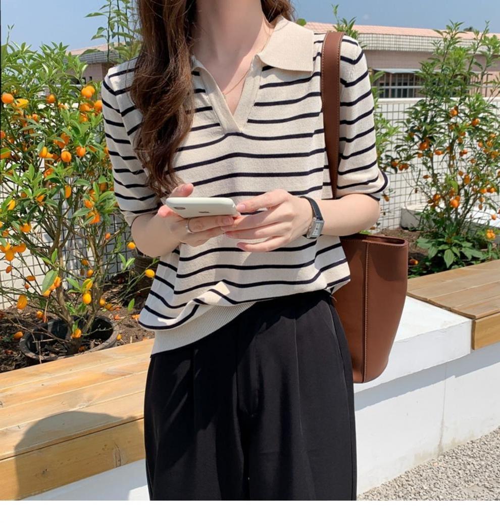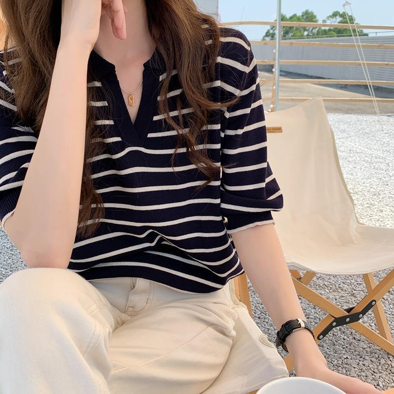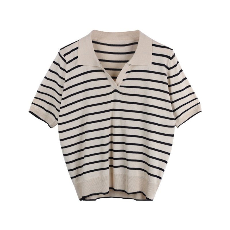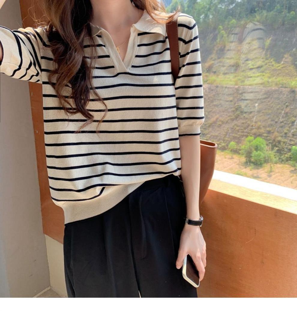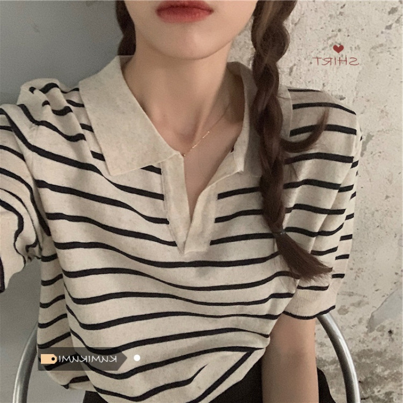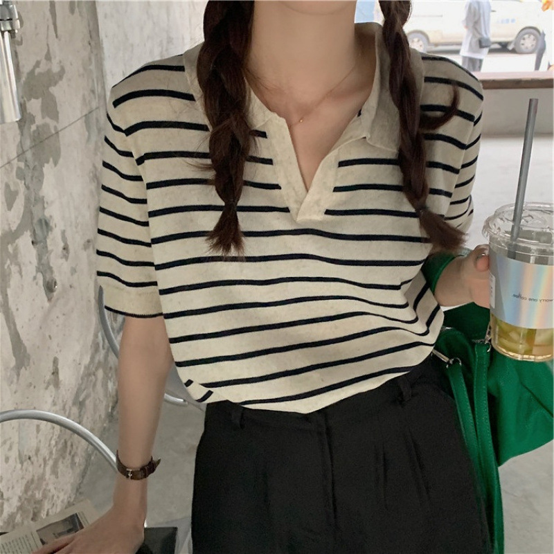 Вязаный свитер с короткими рукавами женский 2025 летний костюм тонкий темпераментный полосатый свободный лацканный рубашка с короткими рукавами
