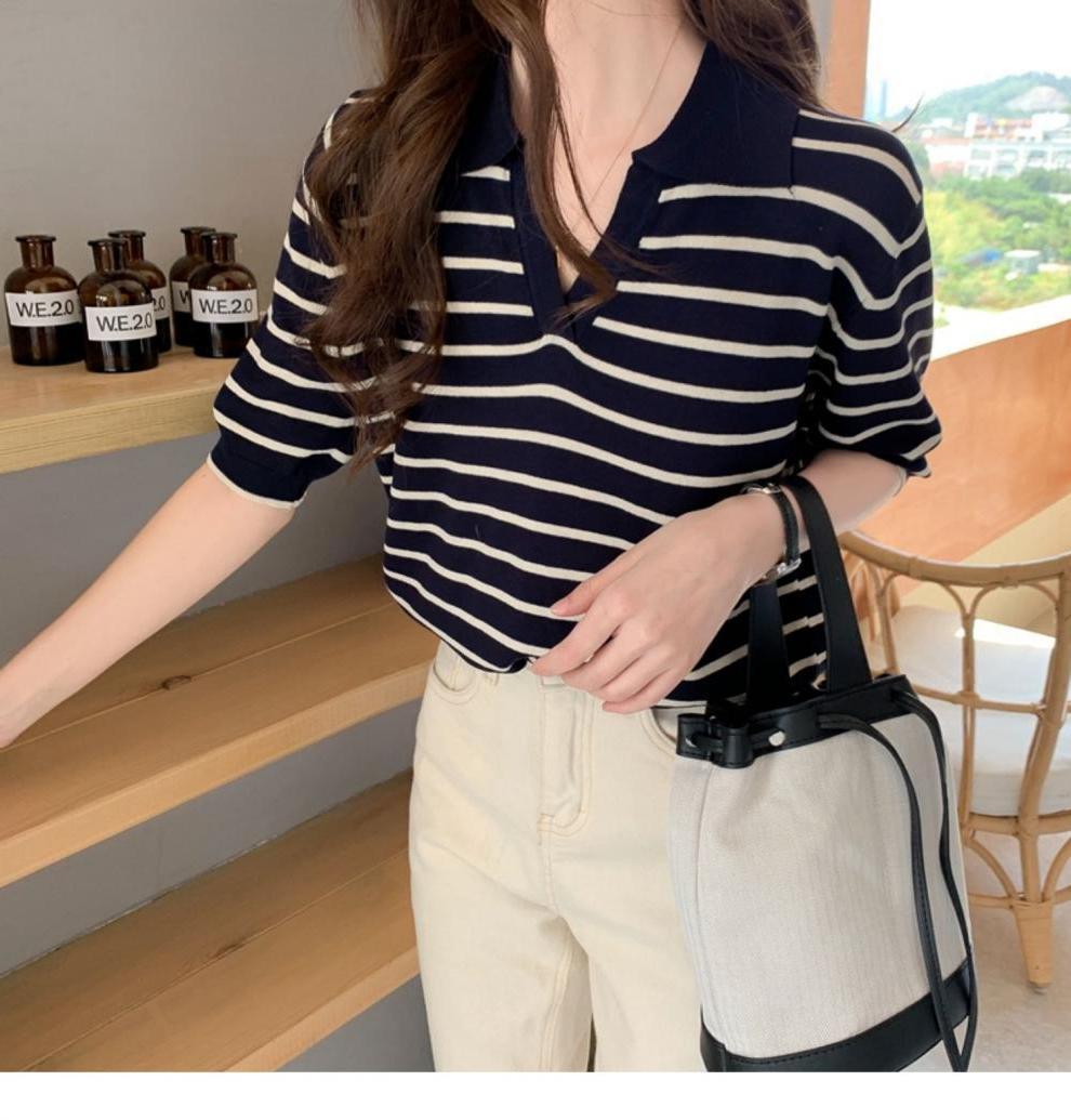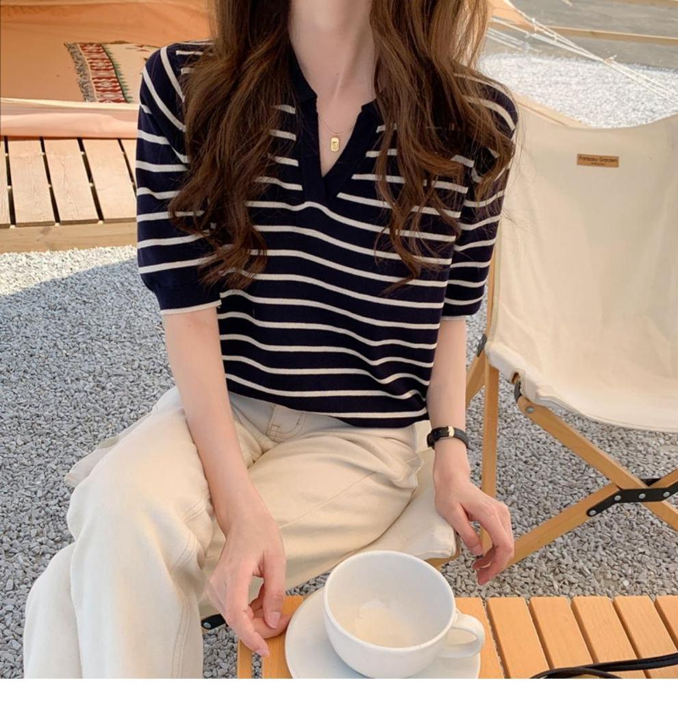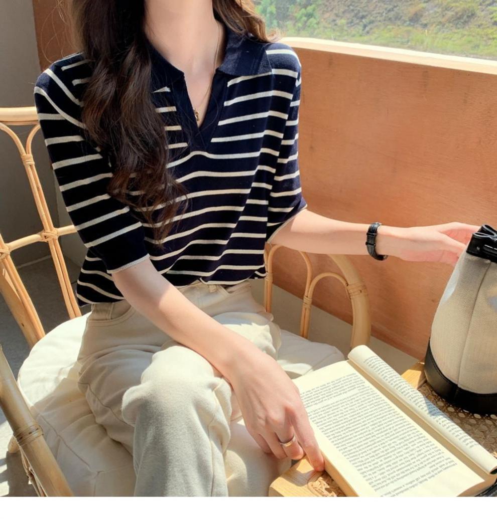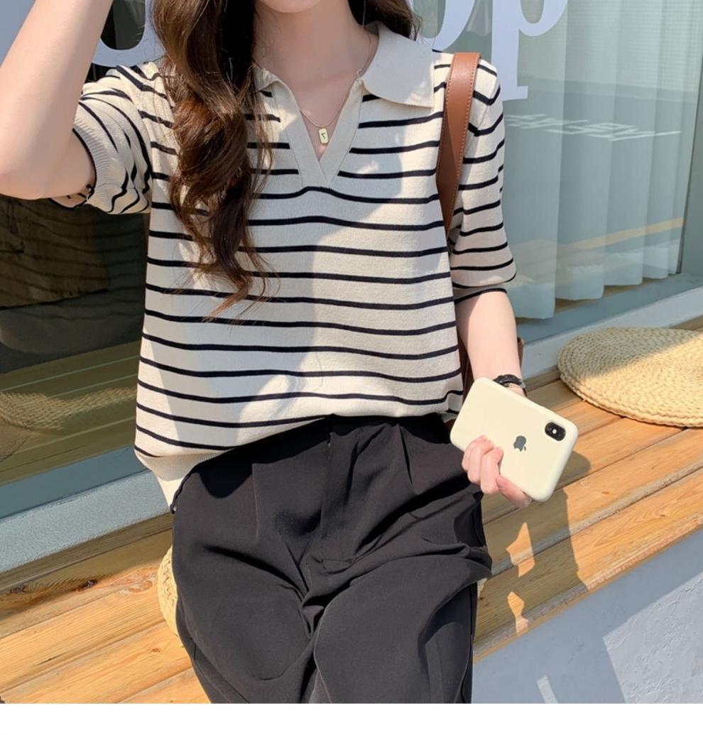 Вязаный свитер с короткими рукавами женский 2025 летний костюм тонкий темпераментный полосатый свободный лацканный рубашка с короткими рукавами