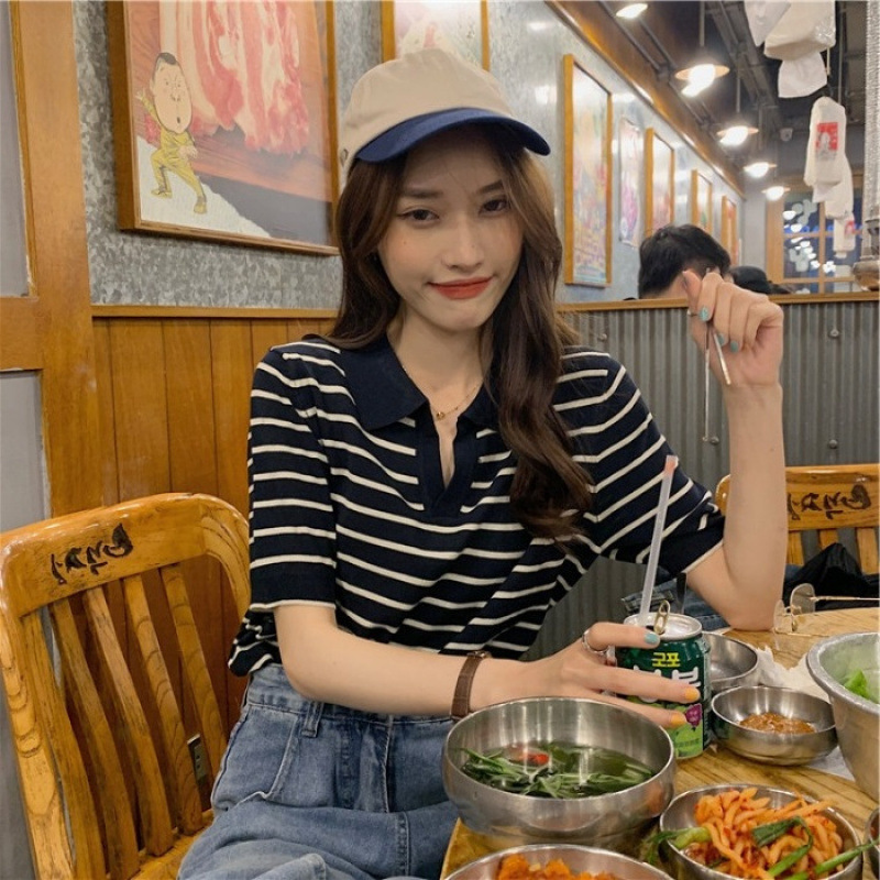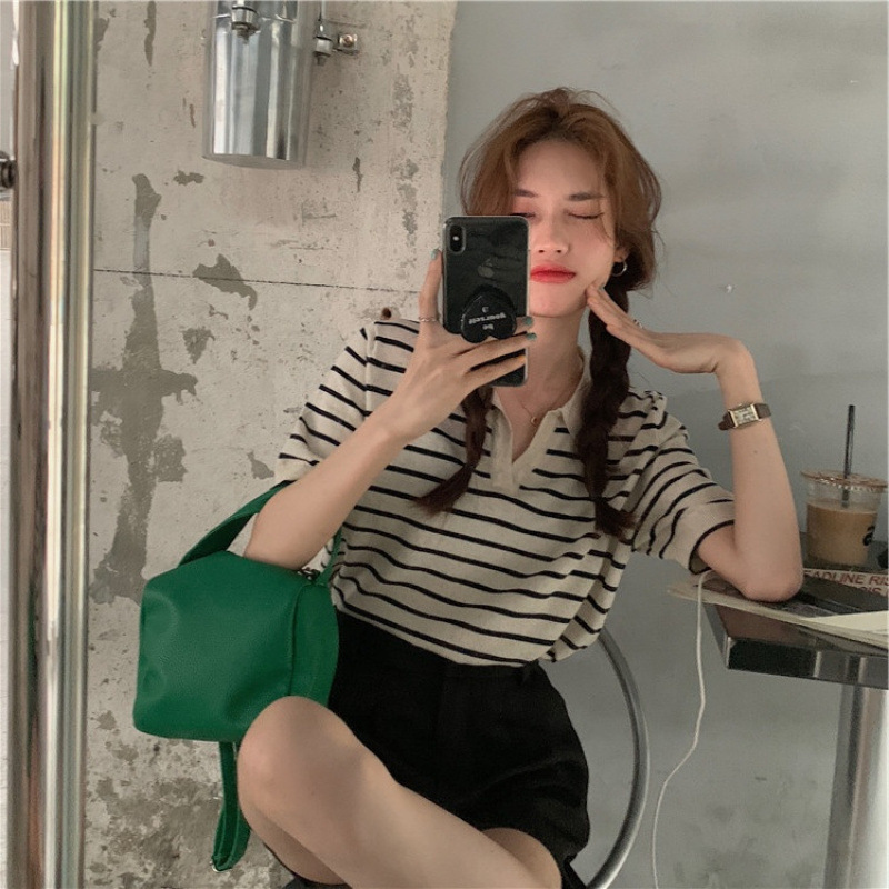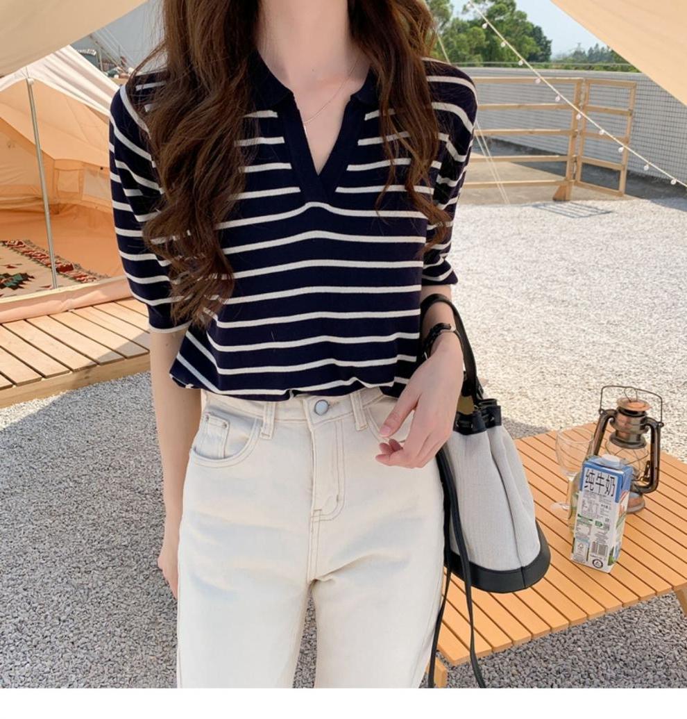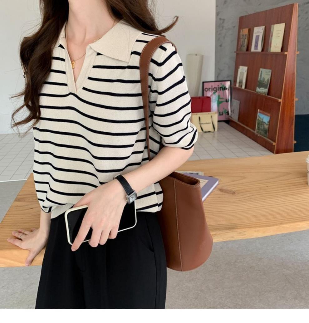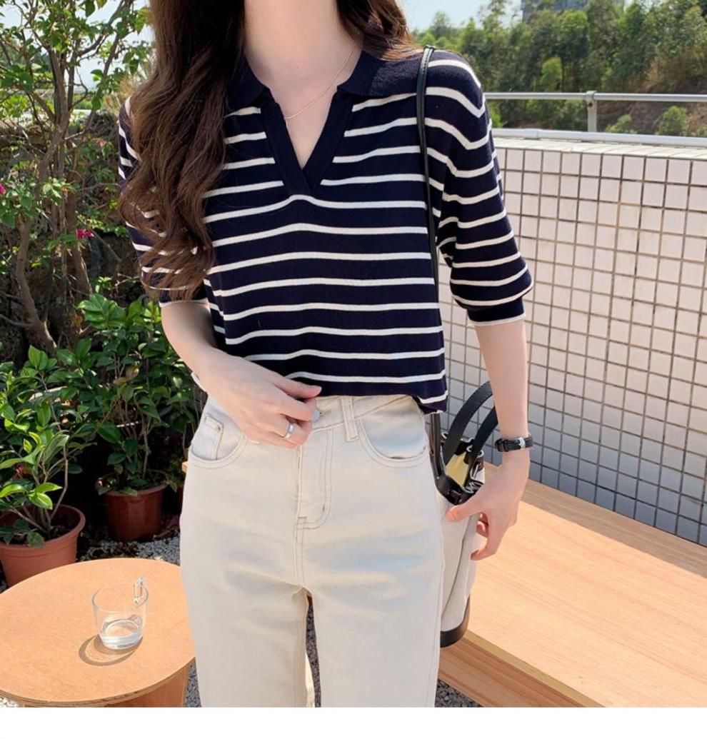 Вязаный свитер с короткими рукавами женский 2025 летний костюм тонкий темпераментный полосатый свободный лацканный рубашка с короткими рукавами