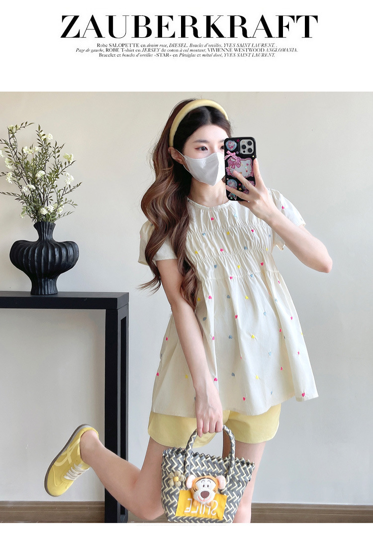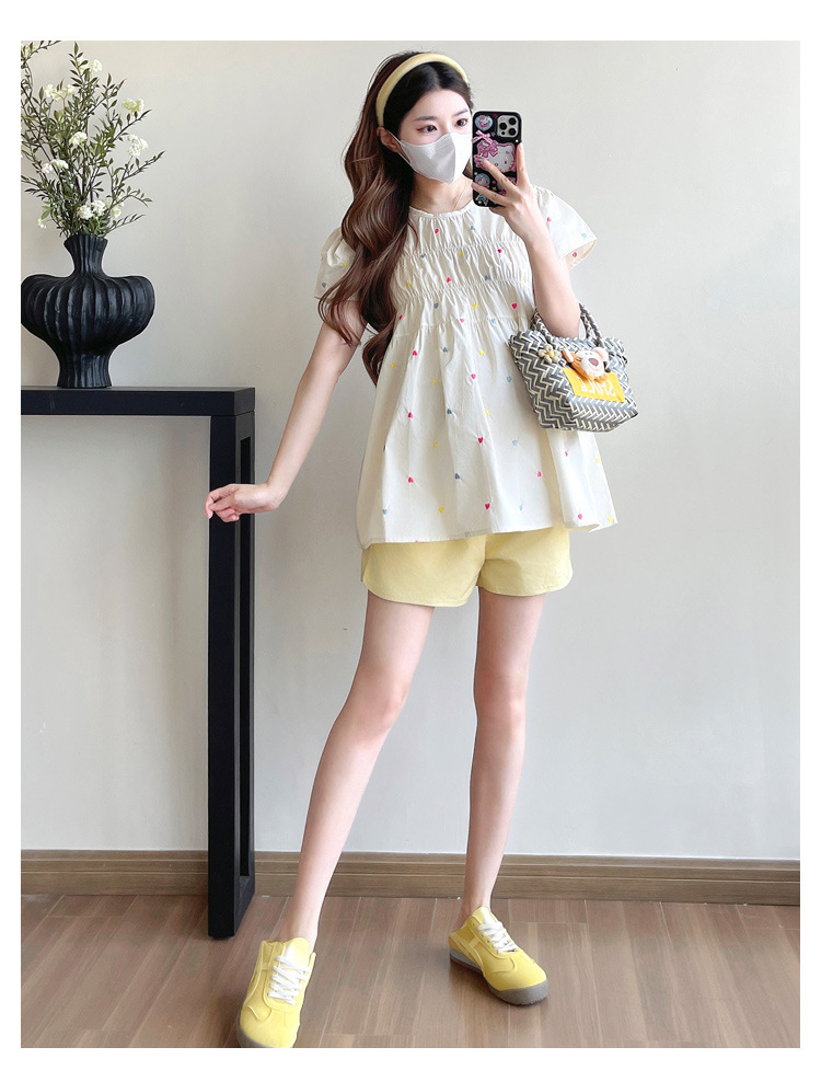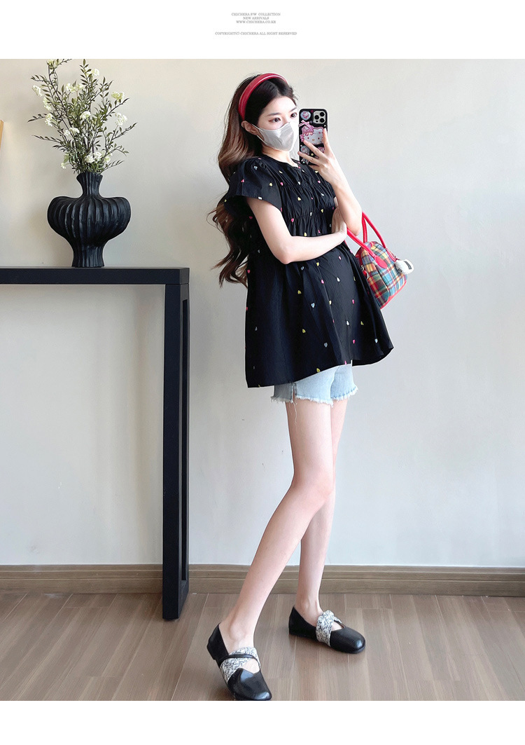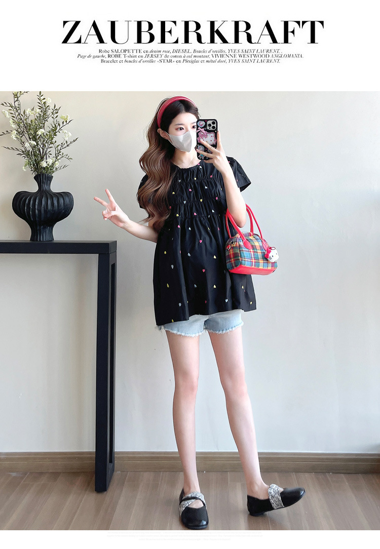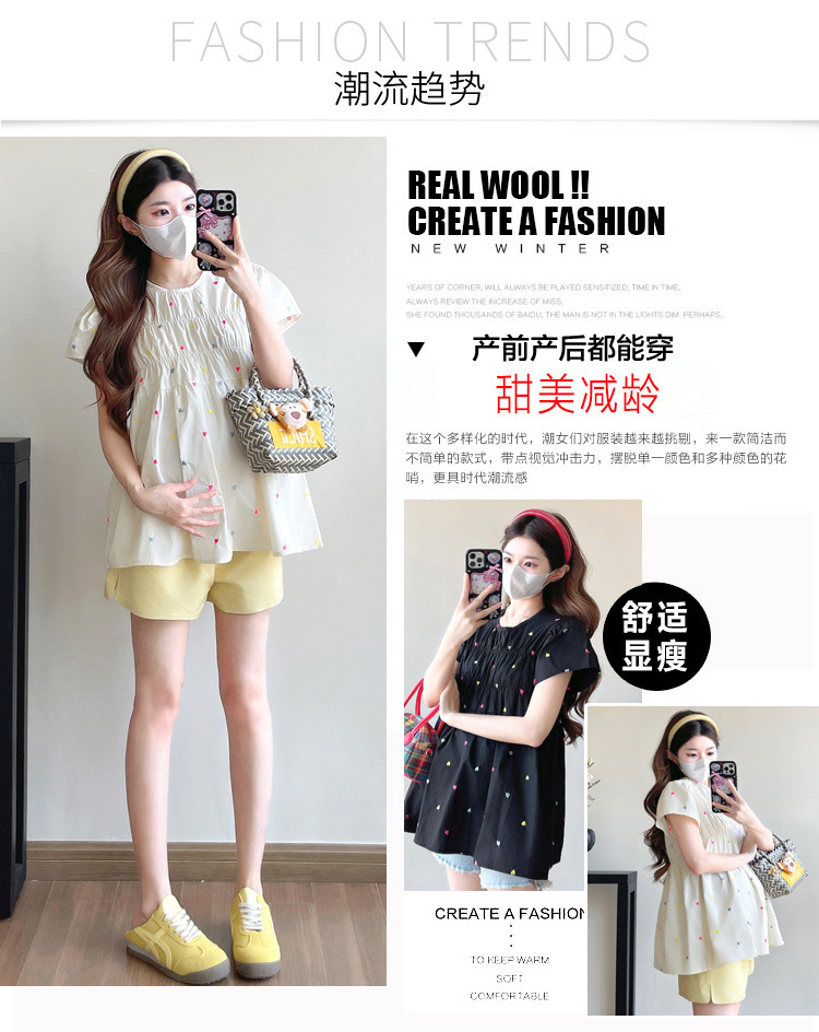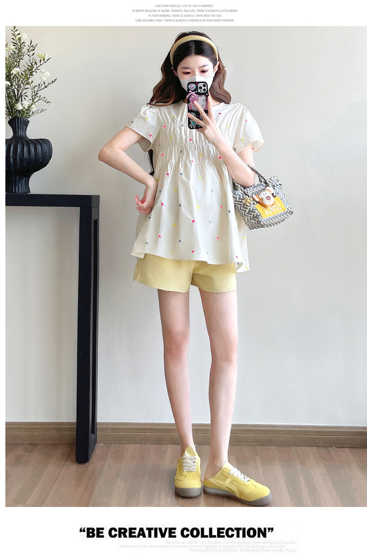 Съемка на месте ~ Новая одежда для беременных летом цветная любовь с вышивкой кукольная рубашка Нежный ветер с короткими рукавами