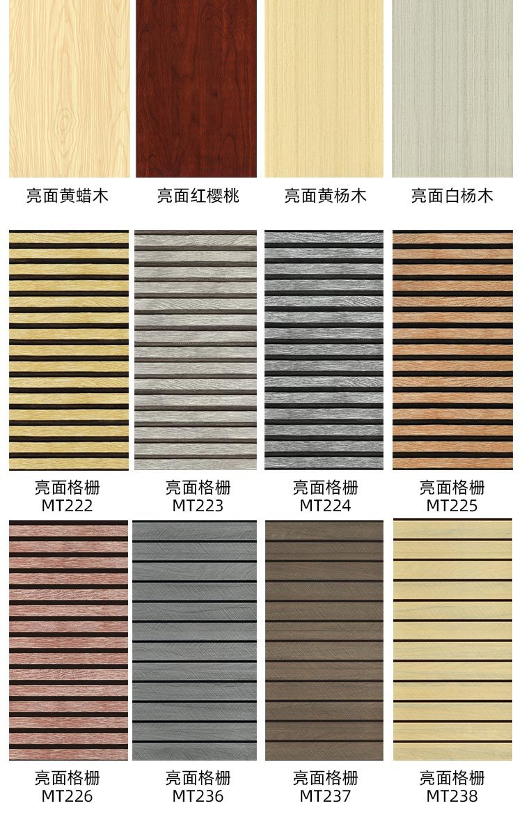 MT-236; MT-237; MT-238; MT-239; MT-222; MT-223; MT-224; MT-225; MT-226; Глянцевая древесина тополя; Глянцевый желтый дуб; Глянцевый белый дуб; Глянцевое красное сандаловое дерево; Глянцевая красная вишня; Глянцевое желтое восковое дерево; Глянцевый самшит; матовый белый древесный рисунок; матовый эбен; Матовый технический дерево 002; Матовый Тех Ми 004; Матовый Технотех Напольное Покрытие 006