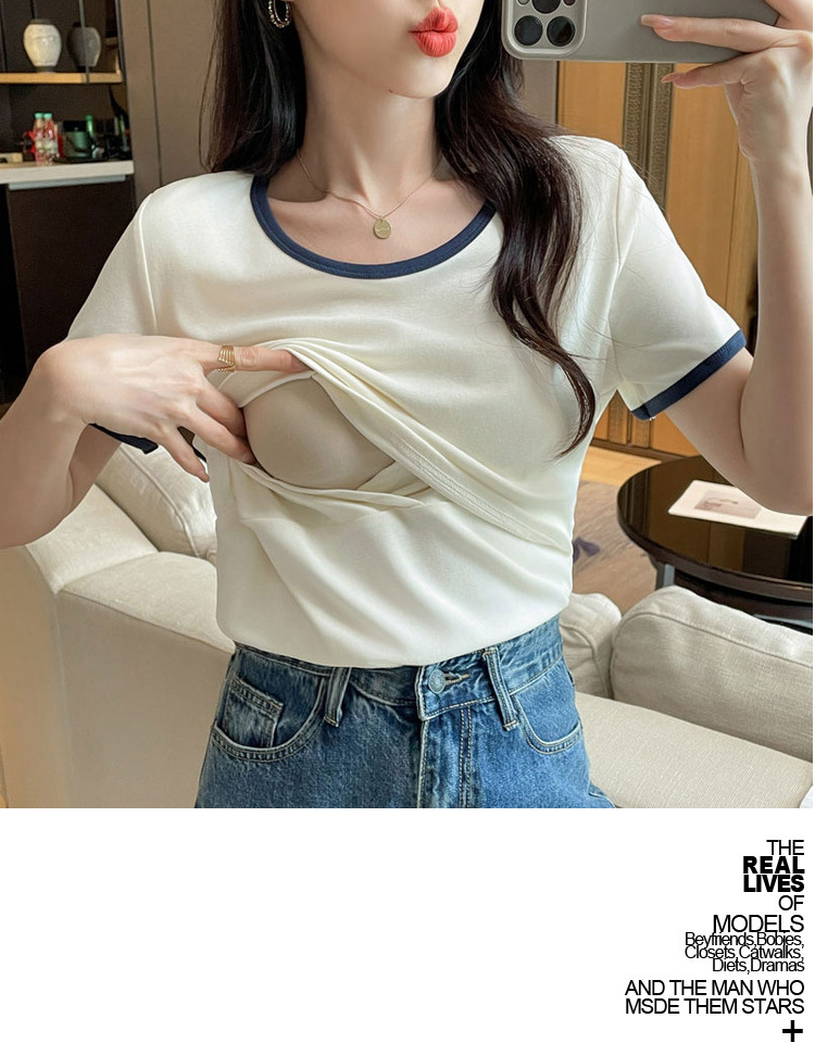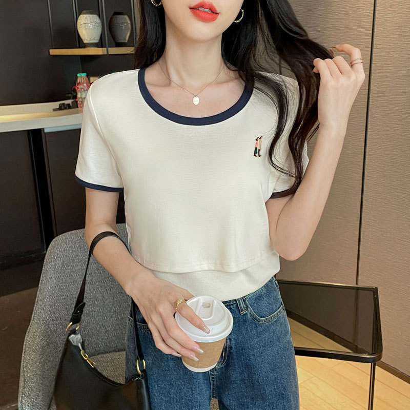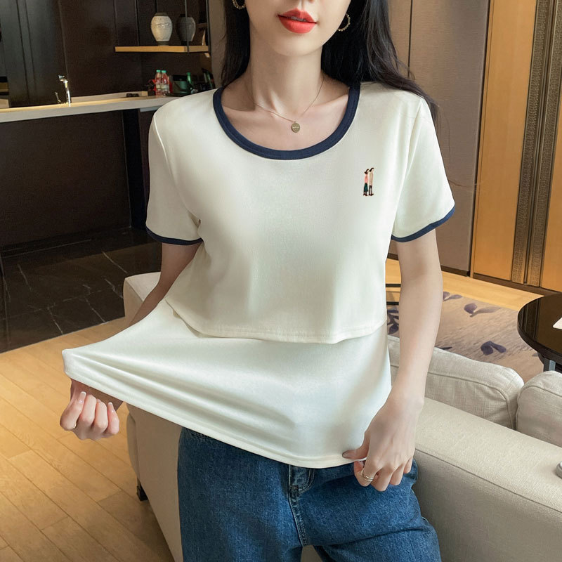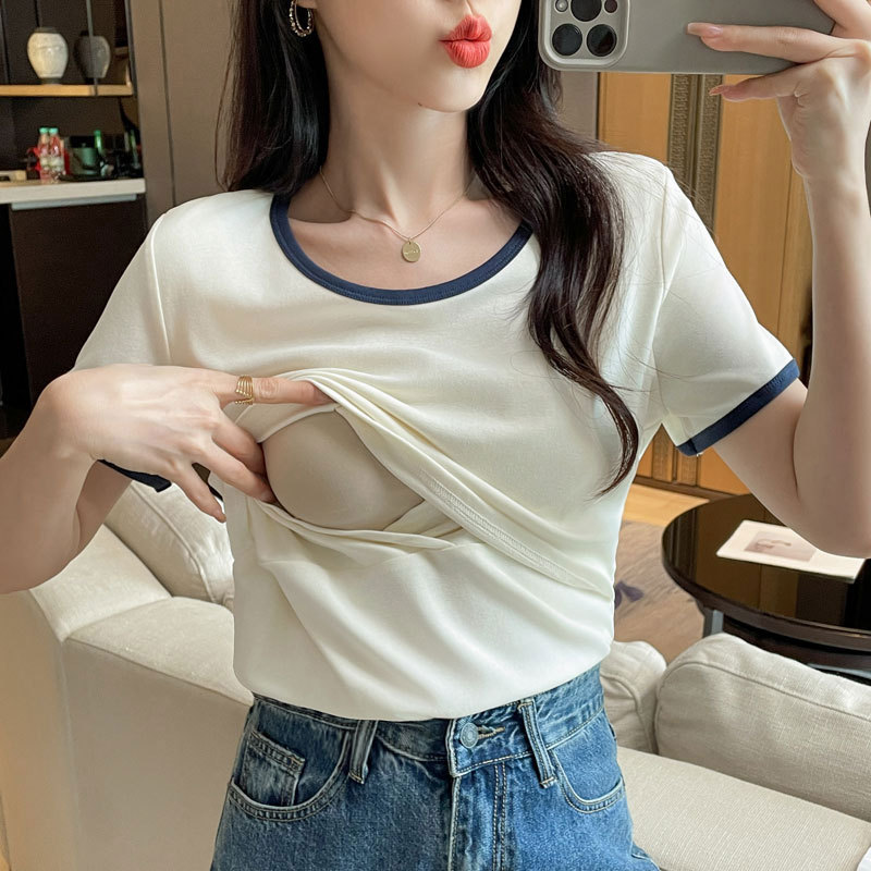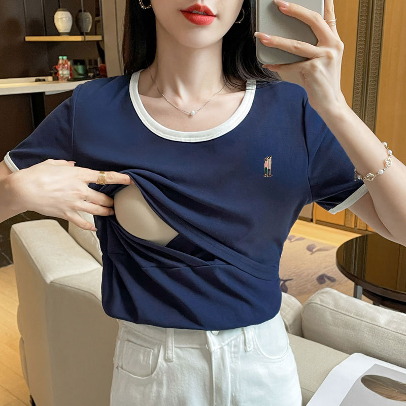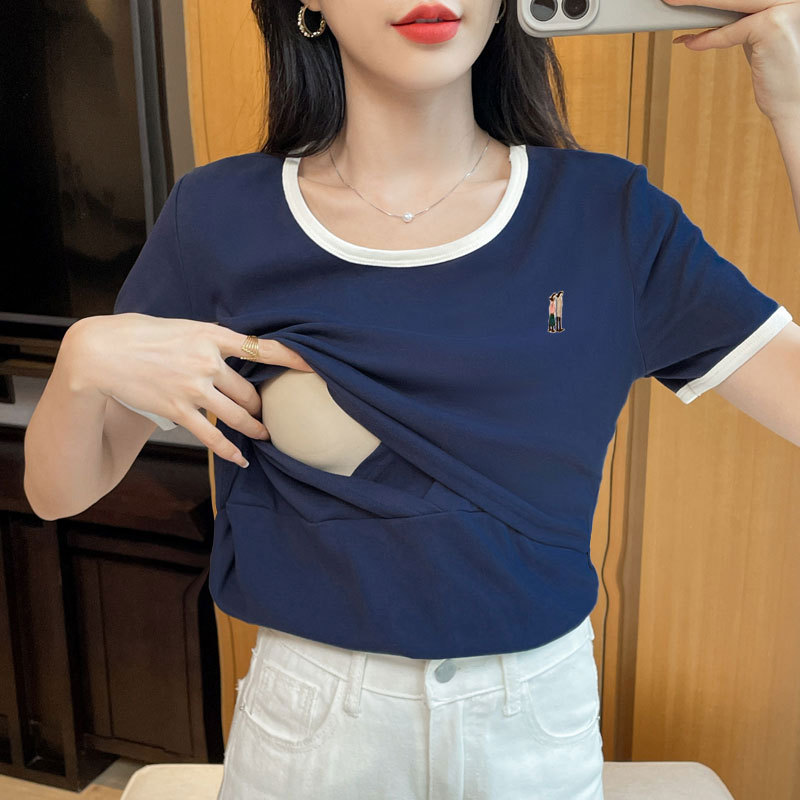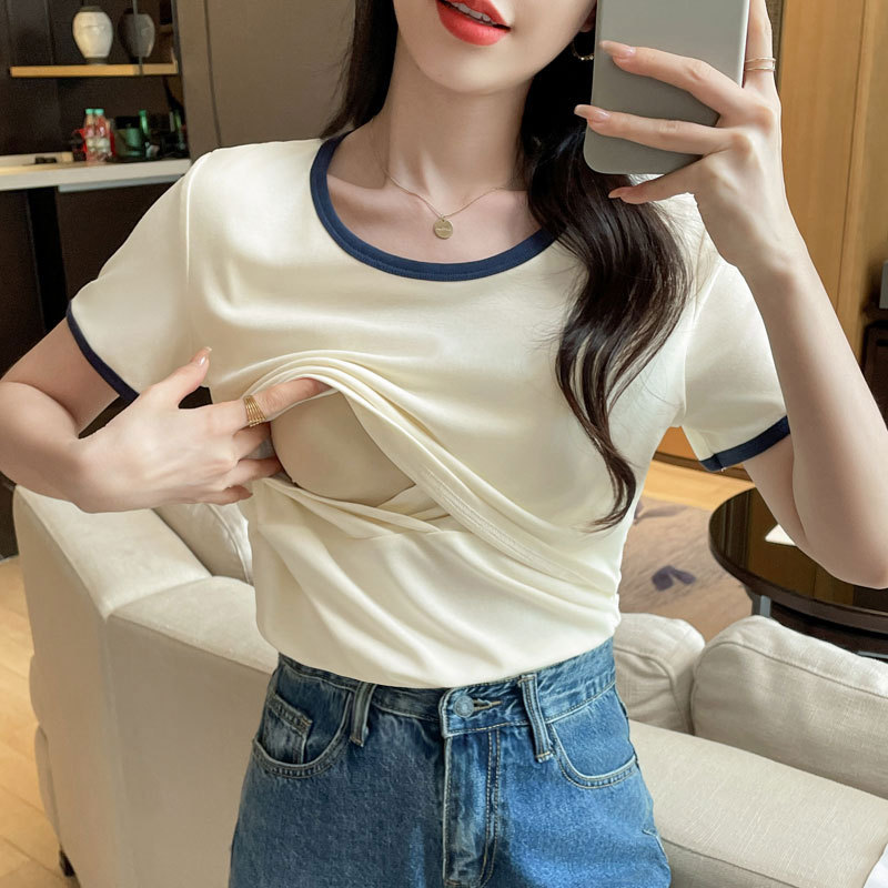 Кормящая хлопчатобумажная футболка для беременных летом с короткими рукавами и круглым вырезом