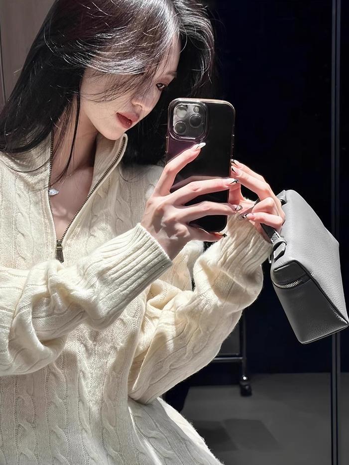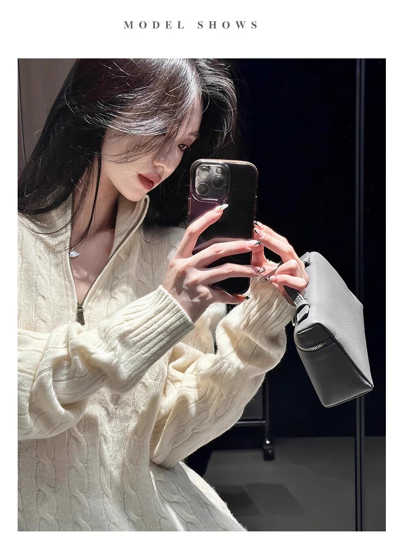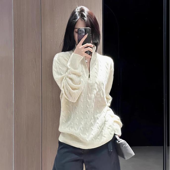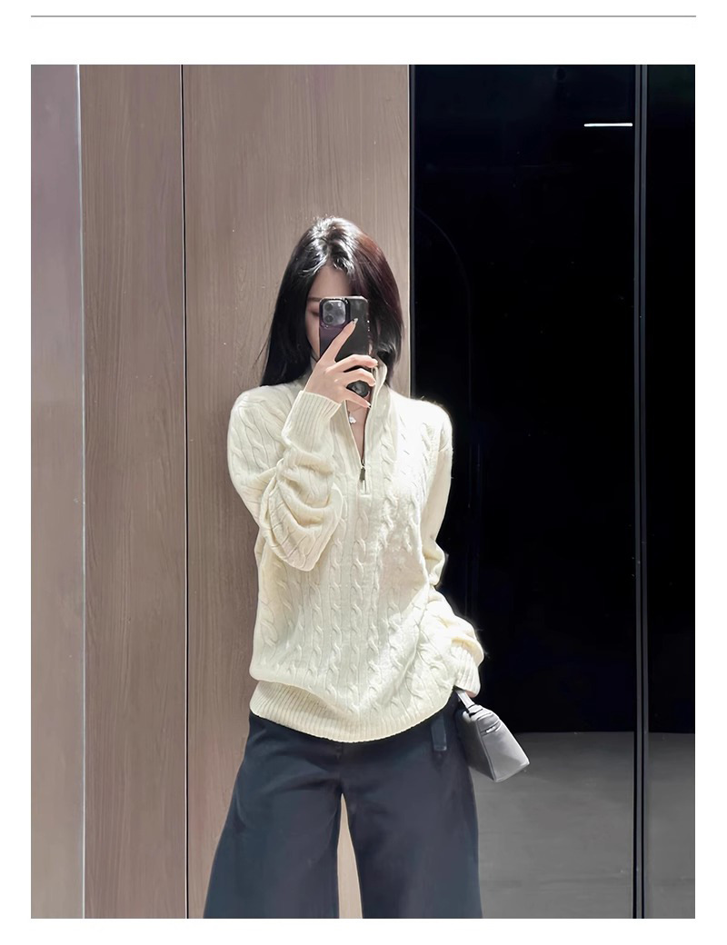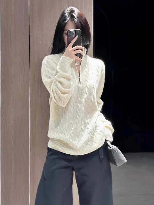 Американский ретро молочный белый старый денежный ветер с высоким воротником свитер женский осень-зима 2024 полузастежка-молния дизайн трикотажный нижний свитер