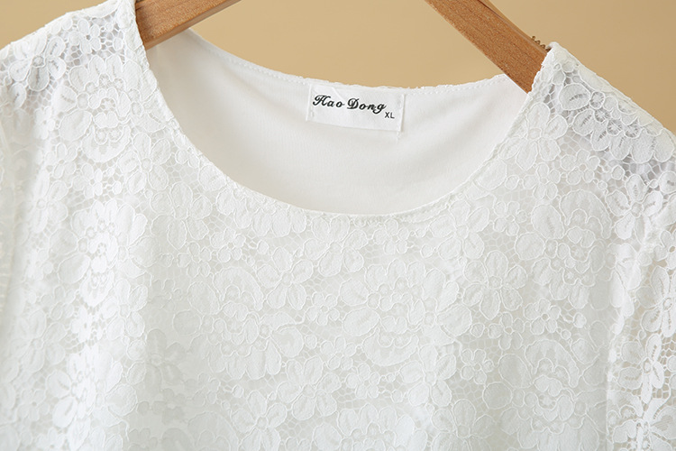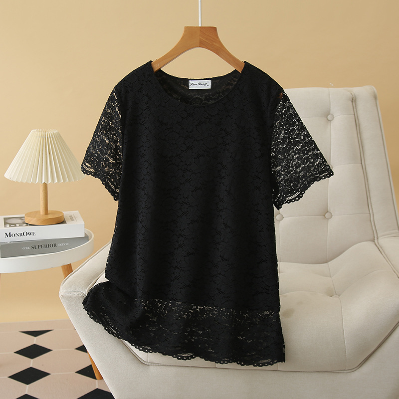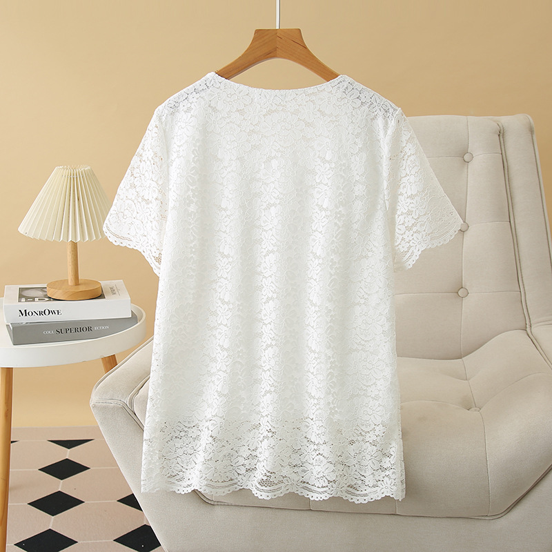 Толстая девушка кружевная рубашка с короткими рукавами 2025 летняя холодная футболка с круглым вырезом большого размера женская стройная двойная рубашка 3060