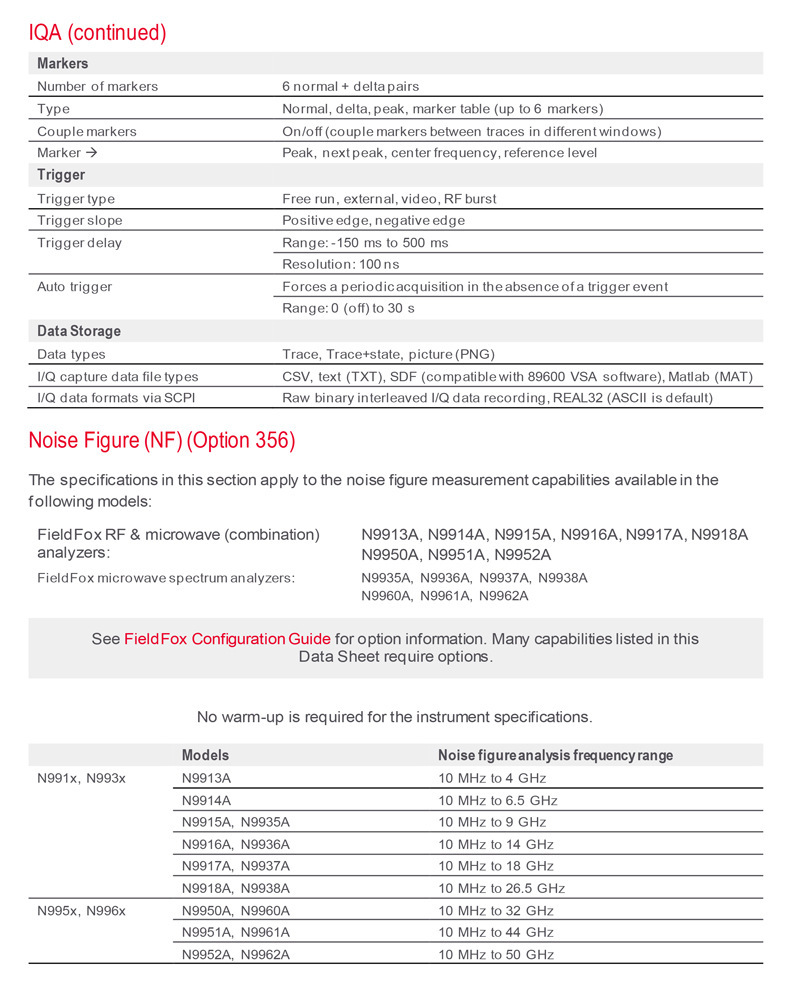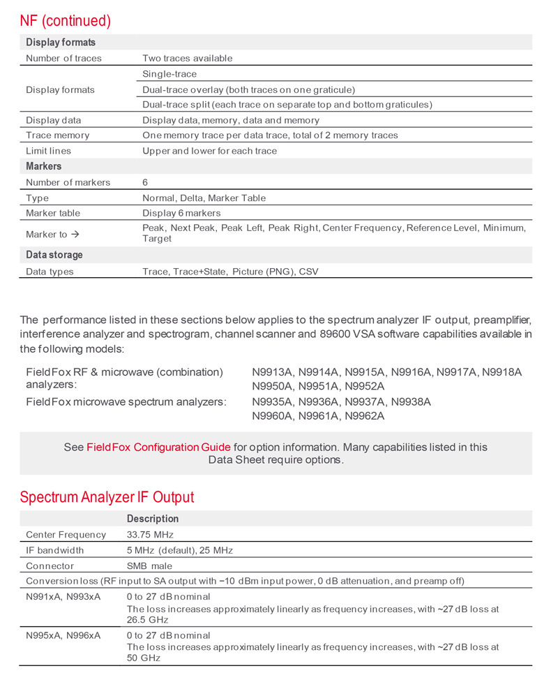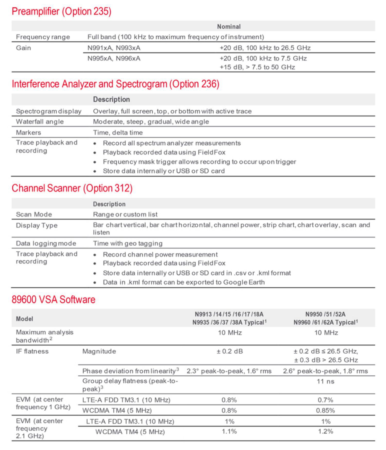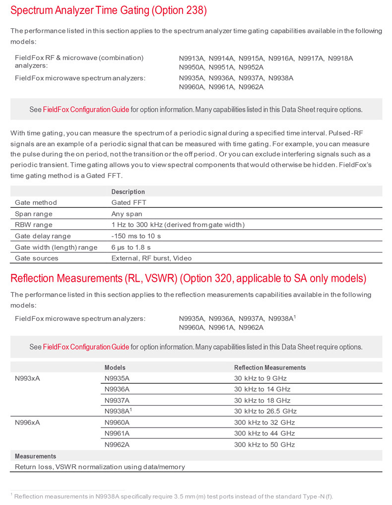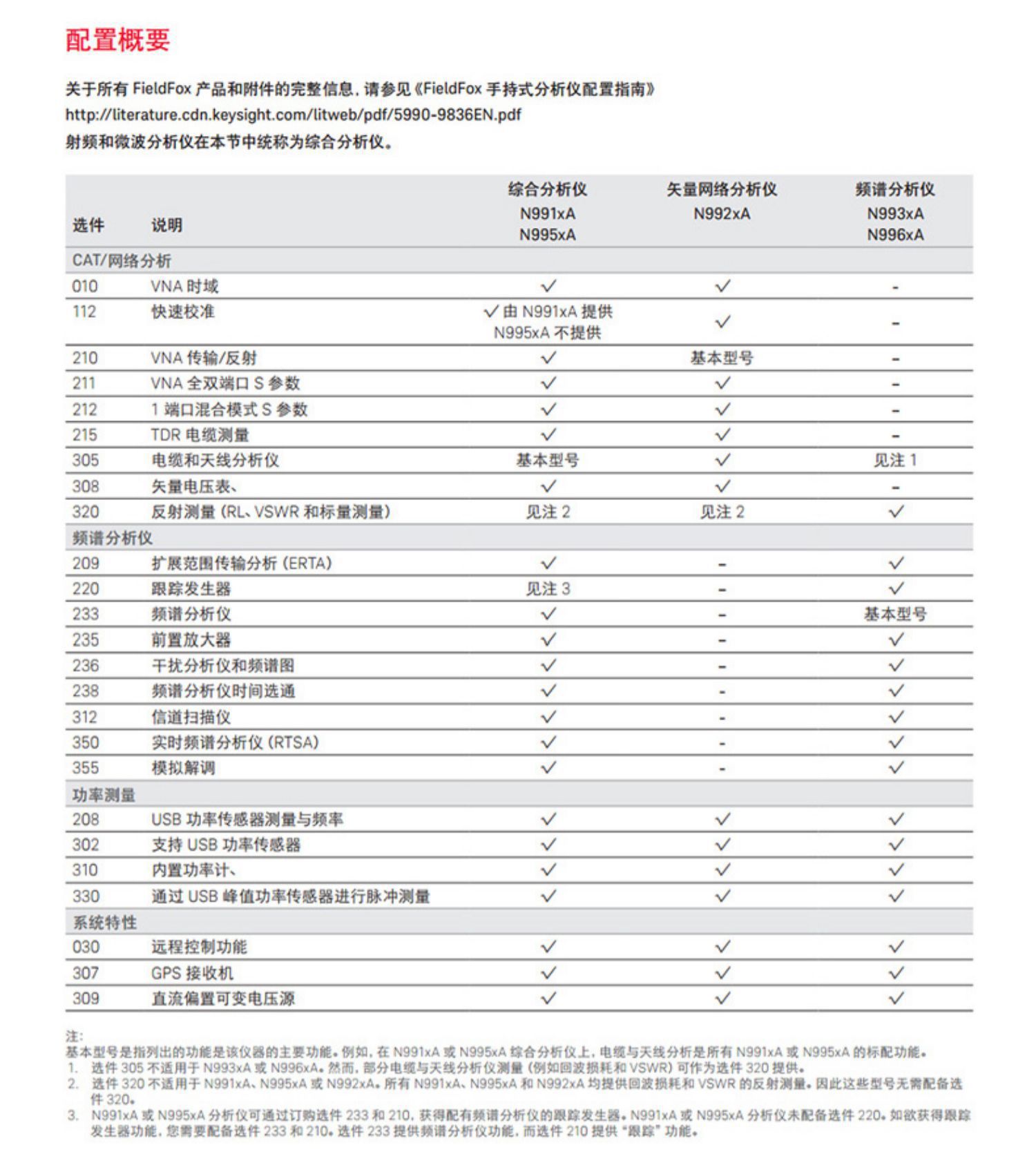 N9912A (ручной радиочастотный анализатор, 4 ГГц); N9912A (ручной радиочастотный анализатор, 6 ГГц); N9913A (портативный микроволновый анализатор, 4 ГГц); N9914A (ручной радиочастотный анализатор, 6,5 ГГц); N9915A (портативный микроволновый анализатор, 9 ГГц); N9916A (портативный микроволновый анализатор, 14 ГГц); N9917A (портативный микроволновый анализатор, 18 ГГц); N9918A (ручной микроволновый анализатор, 26,5 ГГц); N9950A(9kHz-32GHz); N9951A(9kHz-44GHz); N9952A(9kHz-50GHz); N9910X-708 (тестовый кабель N-SMA); N9914A-233 (опция анализатора спектра); N9914A-235 (опция предусилителя); N9914A-350 (опция спектра реального времени)
