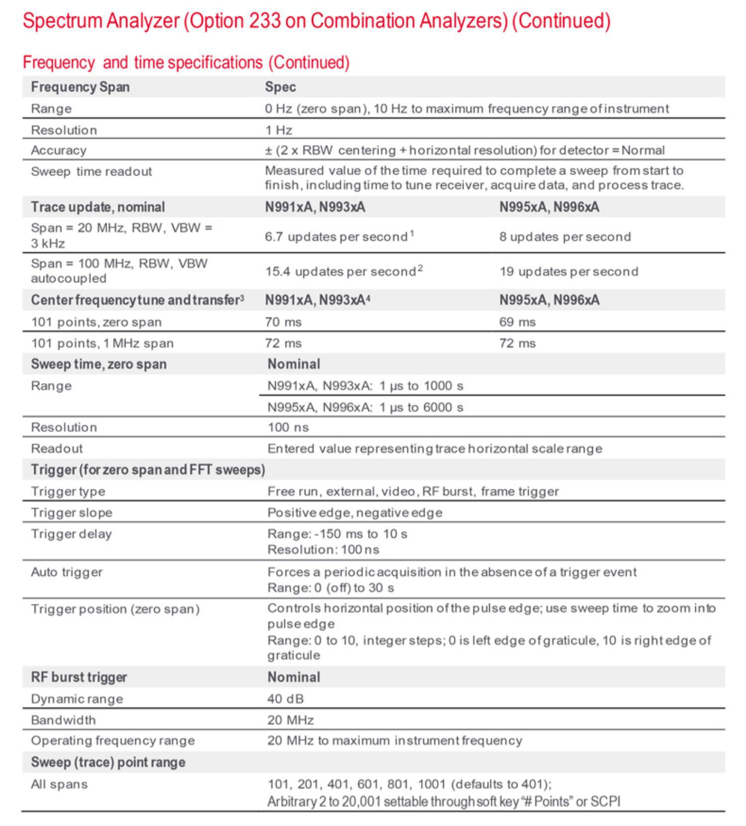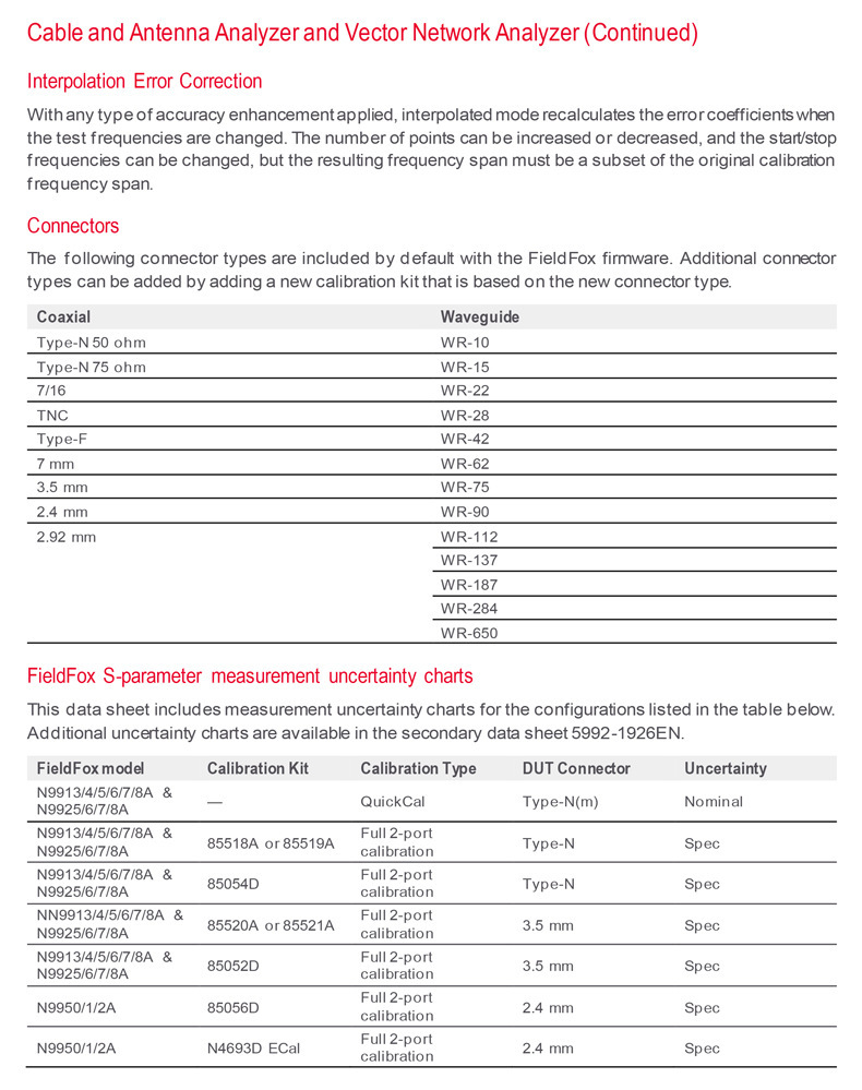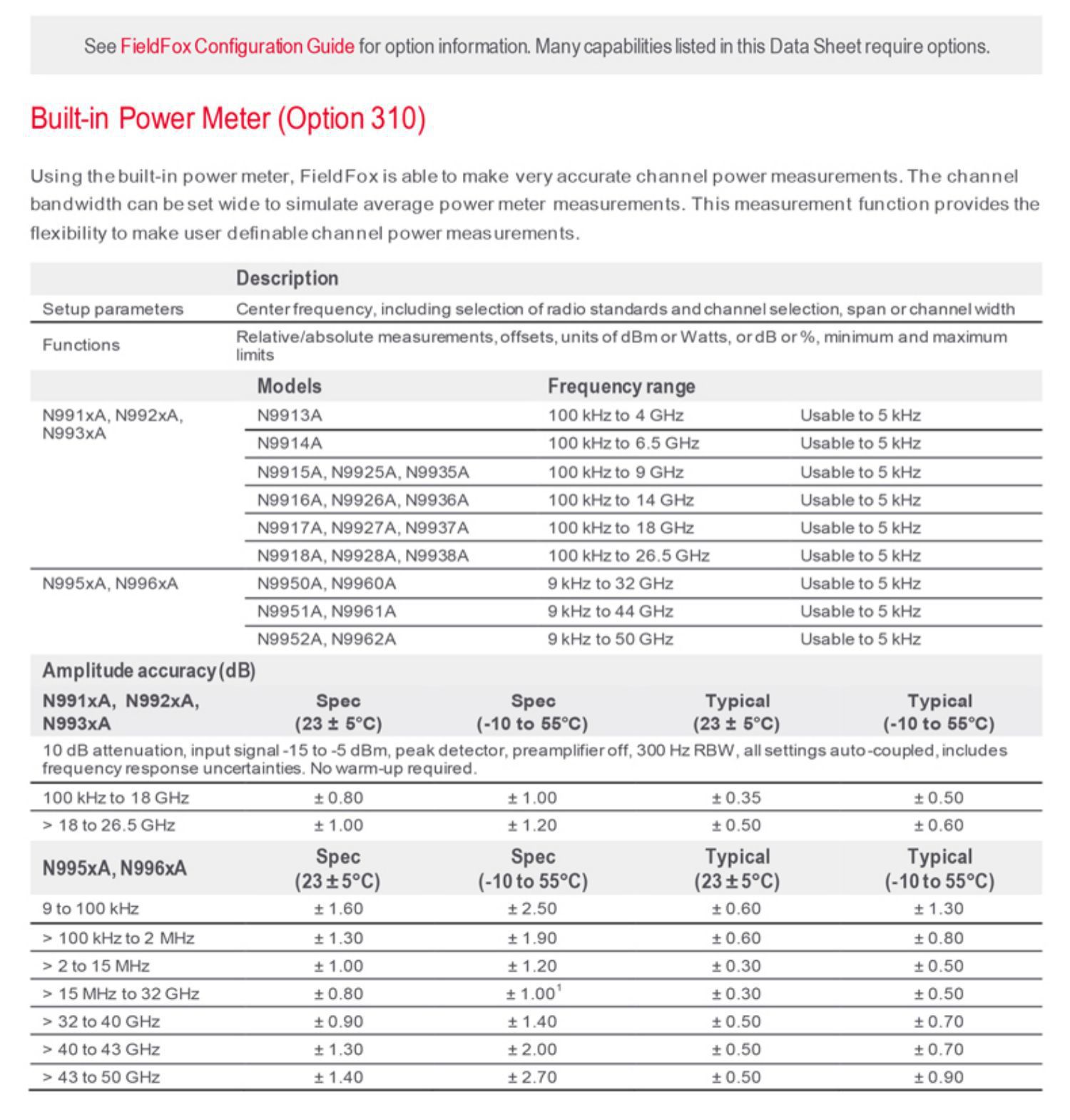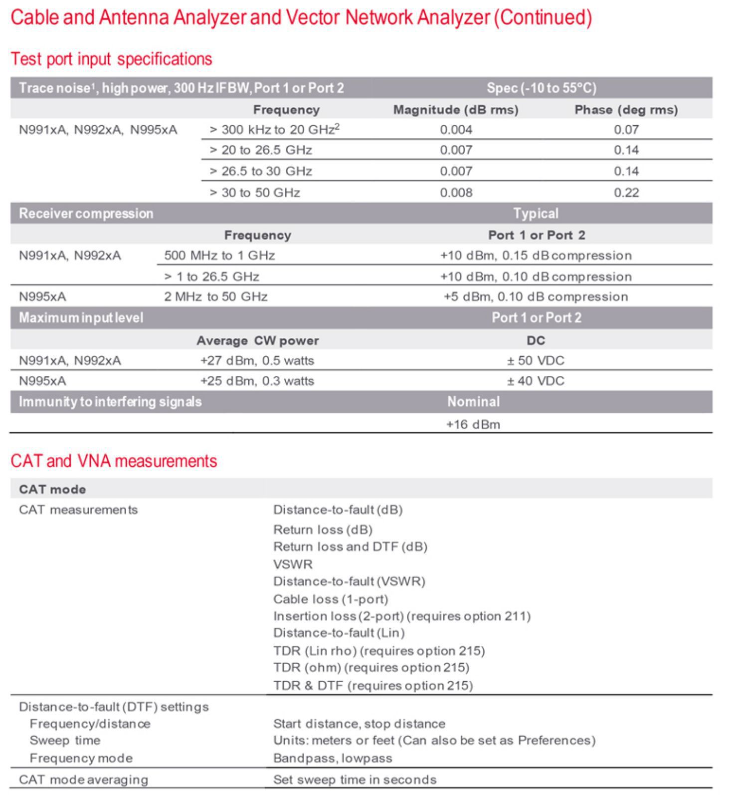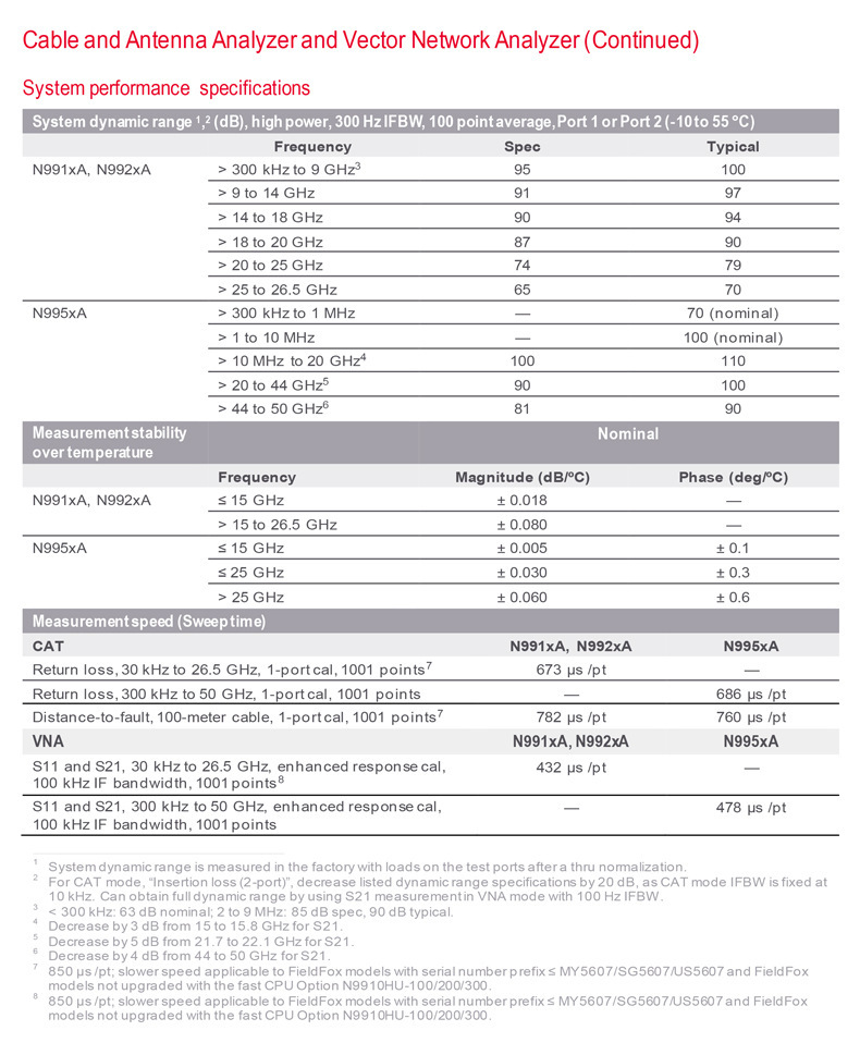 N9912A (ручной радиочастотный анализатор, 4 ГГц); N9912A (ручной радиочастотный анализатор, 6 ГГц); N9913A (портативный микроволновый анализатор, 4 ГГц); N9914A (ручной радиочастотный анализатор, 6,5 ГГц); N9915A (портативный микроволновый анализатор, 9 ГГц); N9916A (портативный микроволновый анализатор, 14 ГГц); N9917A (портативный микроволновый анализатор, 18 ГГц); N9918A (ручной микроволновый анализатор, 26,5 ГГц); N9950A(9kHz-32GHz); N9951A(9kHz-44GHz); N9952A(9kHz-50GHz); N9910X-708 (тестовый кабель N-SMA); N9914A-233 (опция анализатора спектра); N9914A-235 (опция предусилителя); N9914A-350 (опция спектра реального времени)