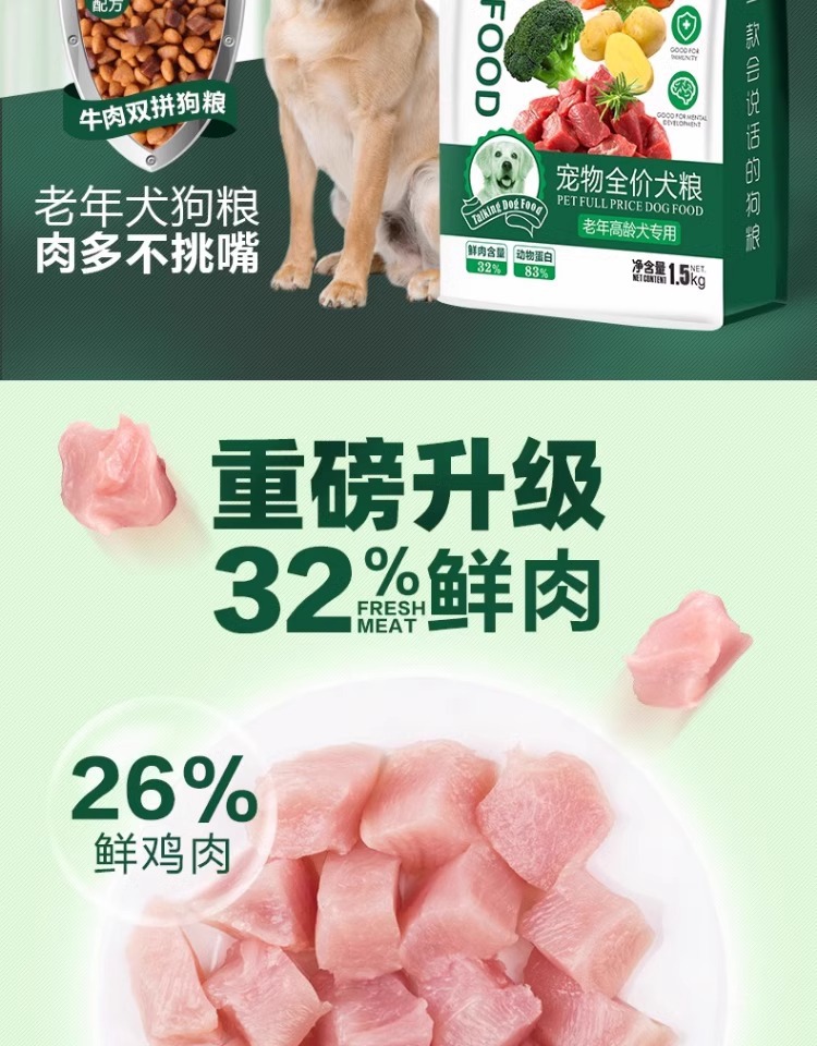 1 пакетик корма для пожилых собак 1.5kg; 2 пакета корма для пожилых собак, всего 3kg [1 банка консервированного корма для пожилых собак бесплатно]; 3 пакета корма для пожилых собак, всего 4.5kg [1 бесплатная питательная паста]; 5 пакетов корма для пожилых собак [Купите 5, получите 1 бесплатно ★ Действительно отправьте 6 пакетов]; 1 пакетик корма для пожилых собак + 1 коробка пробиотиков; 1 пакетик корма для пожилых собак + 1 бутылка мягких таблеток для здоровья суставов; 1 пакетик корма для пожилых собак + 1 бутылка мягких таблеток кальция из овечьего молока.; 1 пакетик корма для пожилых собак + 1 бутылка мягких таблеток лецитина; 1 пакетик корма для пожилых собак + 1 бутылка питательной пасты ★ Четвертый лагерь; 1 пакетик корма для пожилых собак + 6 банок консервированного корма для пожилых собак; 1 пакетик улучшенного корма для пожилых собак (2kg)