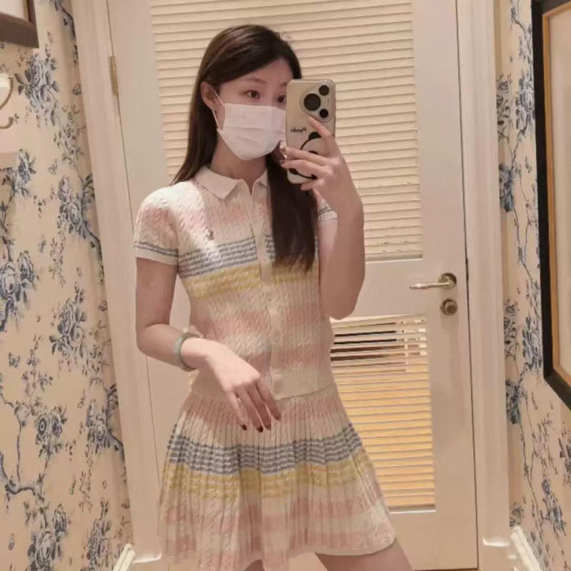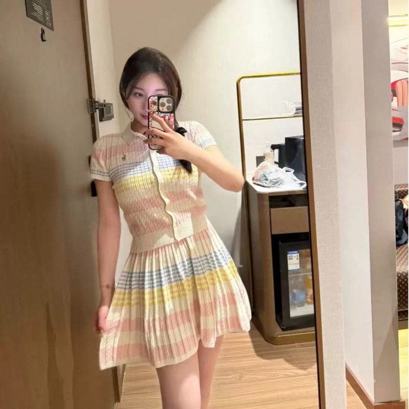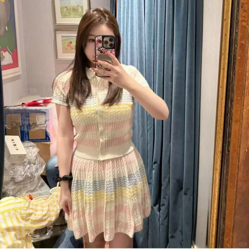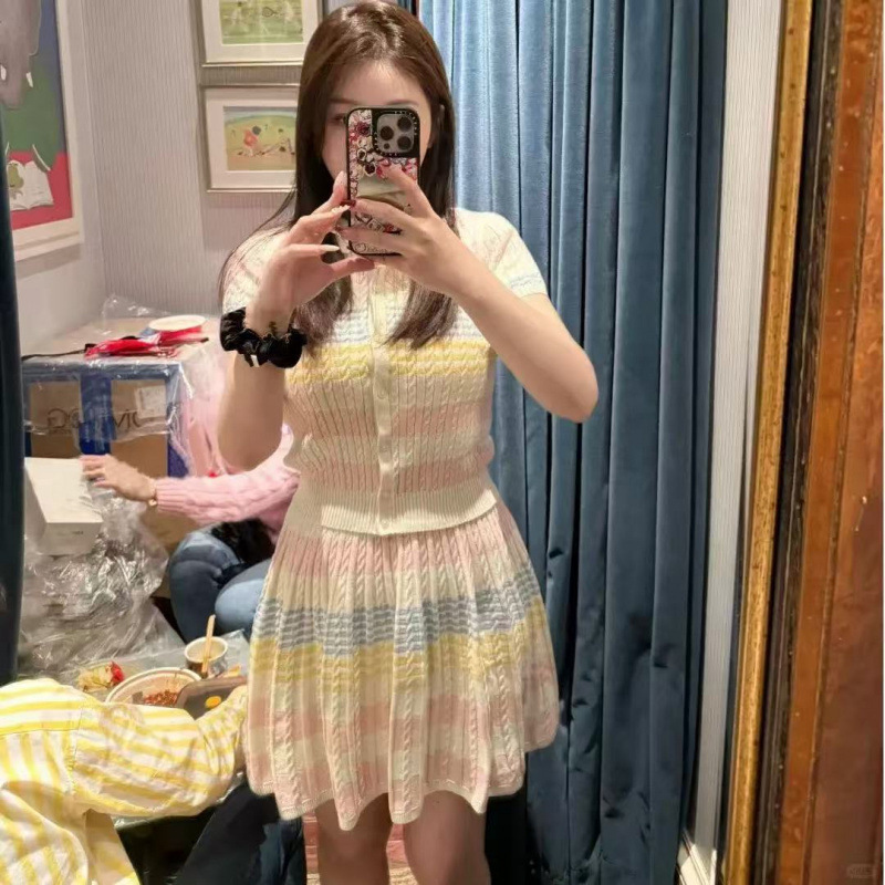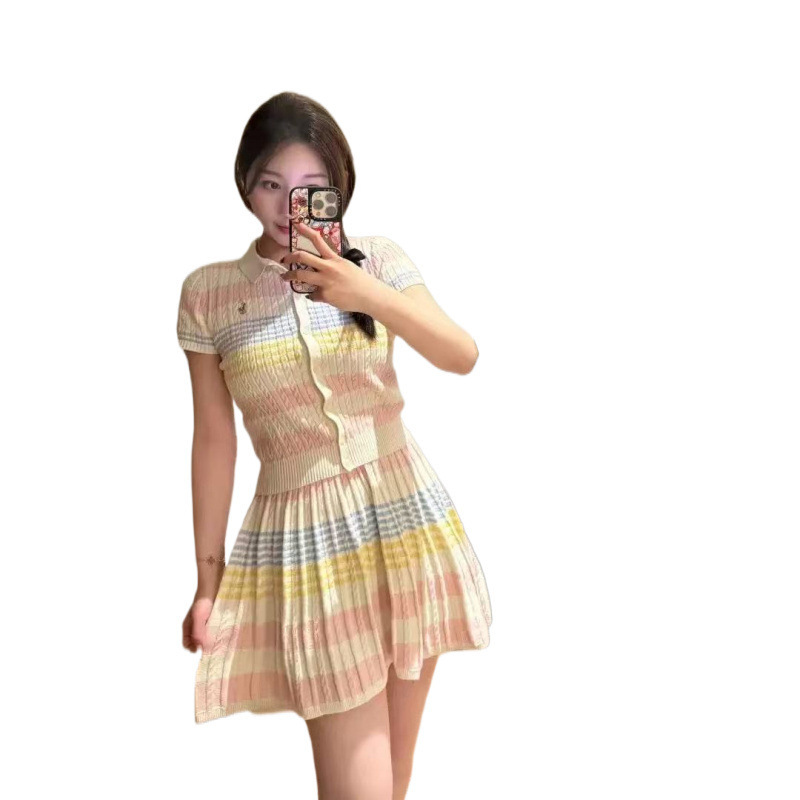 Темперамент воротник женский 2025 лето новый пони вышивка трикотажный кардиган юбка костюм