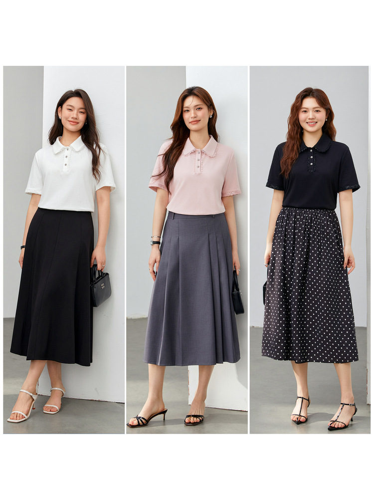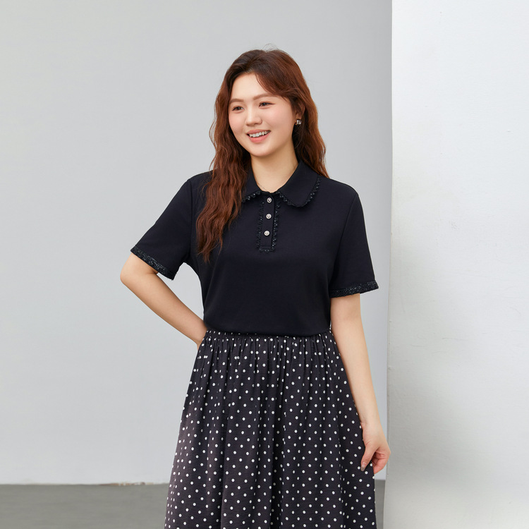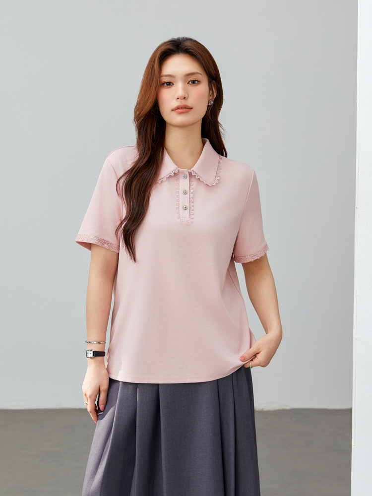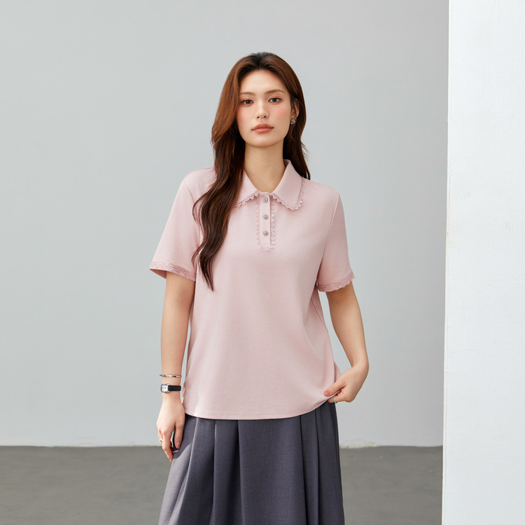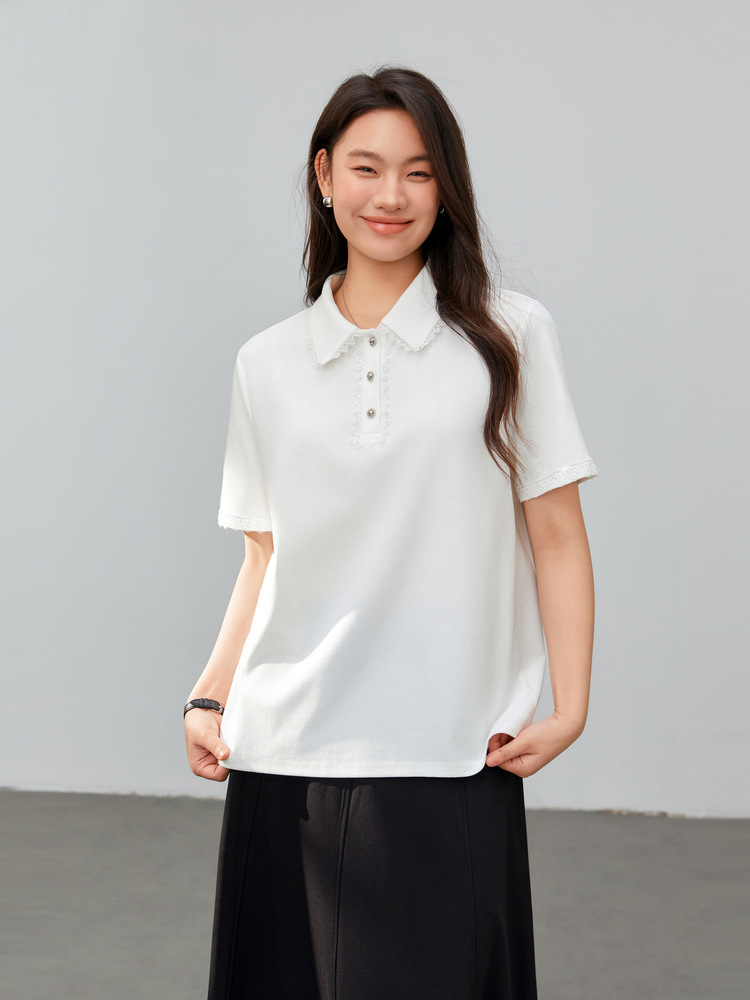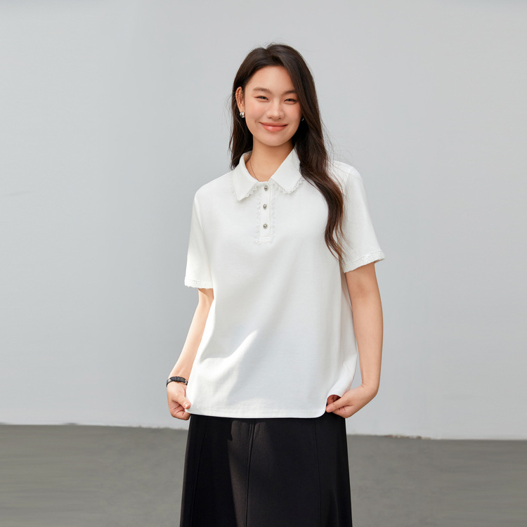 [Нежная универсальная футболка с кружевными лацканами, уменьшающая возраст] Тонкая и красивая женская одежда больших размеров, весна 2025, новый стиль