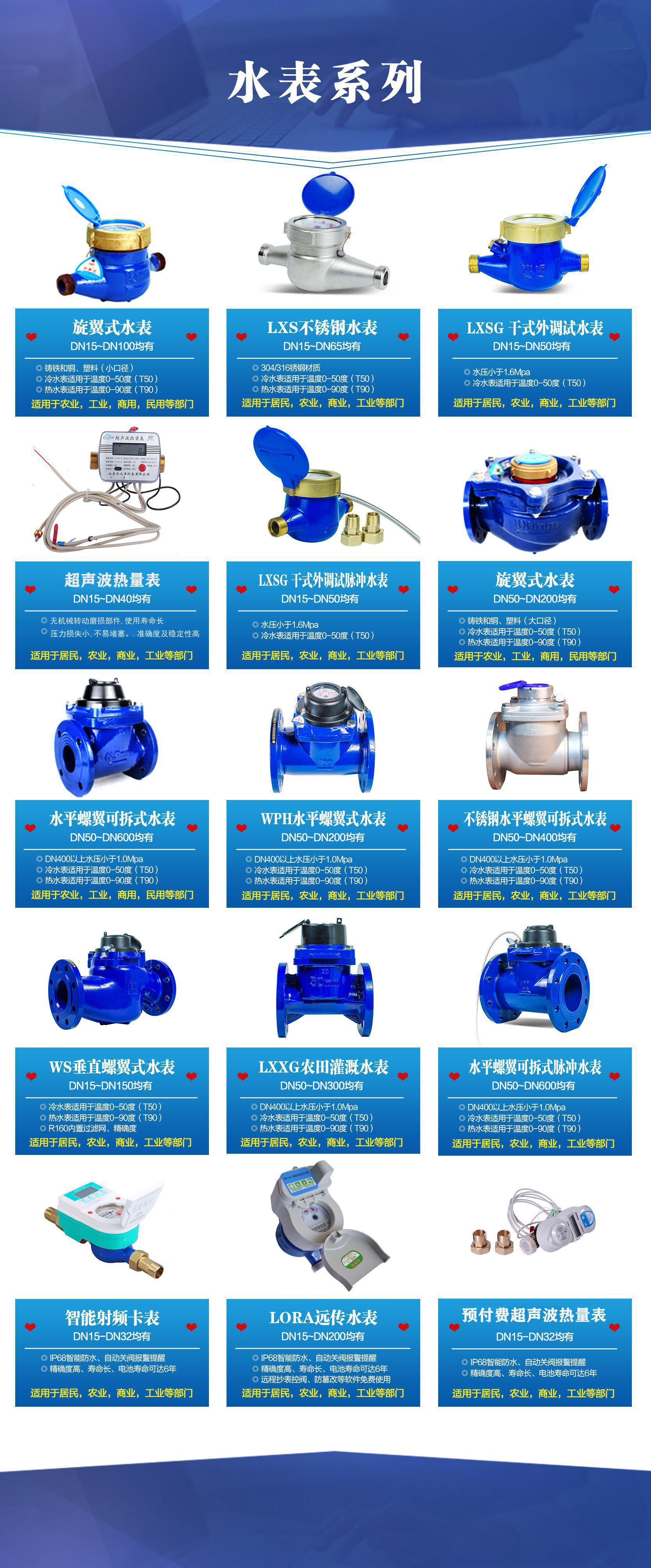 Счетчик воды DN15 (все железные нестандартные); Счетчик воды DN20 (все железные нестандартные); Счетчик воды DN25 (все железные нестандартные); Счетчик воды DN15 (все железные сухого типа нестандартные); Счетчик воды DN20 (все железные сухого типа нестандартные); Счетчик воды DN25 (все железные сухого типа нестандартные); Счетчик воды DN15 (стальная крышка и стальное соединение по национальному стандарту); Счетчик воды DN20 (стальная крышка и стальное соединение по национальному стандарту); Счетчик воды DN25 (стальная крышка и стальное соединение по национальному стандарту); Счетчик воды DN15 (медная крышка и медное соединение сухого типа, национальный стандарт); Счетчик воды DN20 (медная крышка и медное соединение сухого типа, национальный стандарт); Счетчик воды DN25 (медная крышка и медное соединение сухого типа, национальный стандарт); Счетчик воды DN15 (медная крышка и медное соединение по национальному стандарту); Счетчик воды DN20 (медная крышка и медное соединение по национальному стандарту); Счетчик воды DN25 (медная крышка и медное соединение по национальному стандарту); Счетчик воды из АБС-пластика DN15 (нестандартный); Счетчик воды из АБС-пластика DN20 (нестандартный); Нейлоновый счетчик воды DN15 (национальный стандарт); Нейлоновый счетчик воды DN20 (национальный стандарт); Нейлоновый счетчик воды DN25 (национальный стандарт)