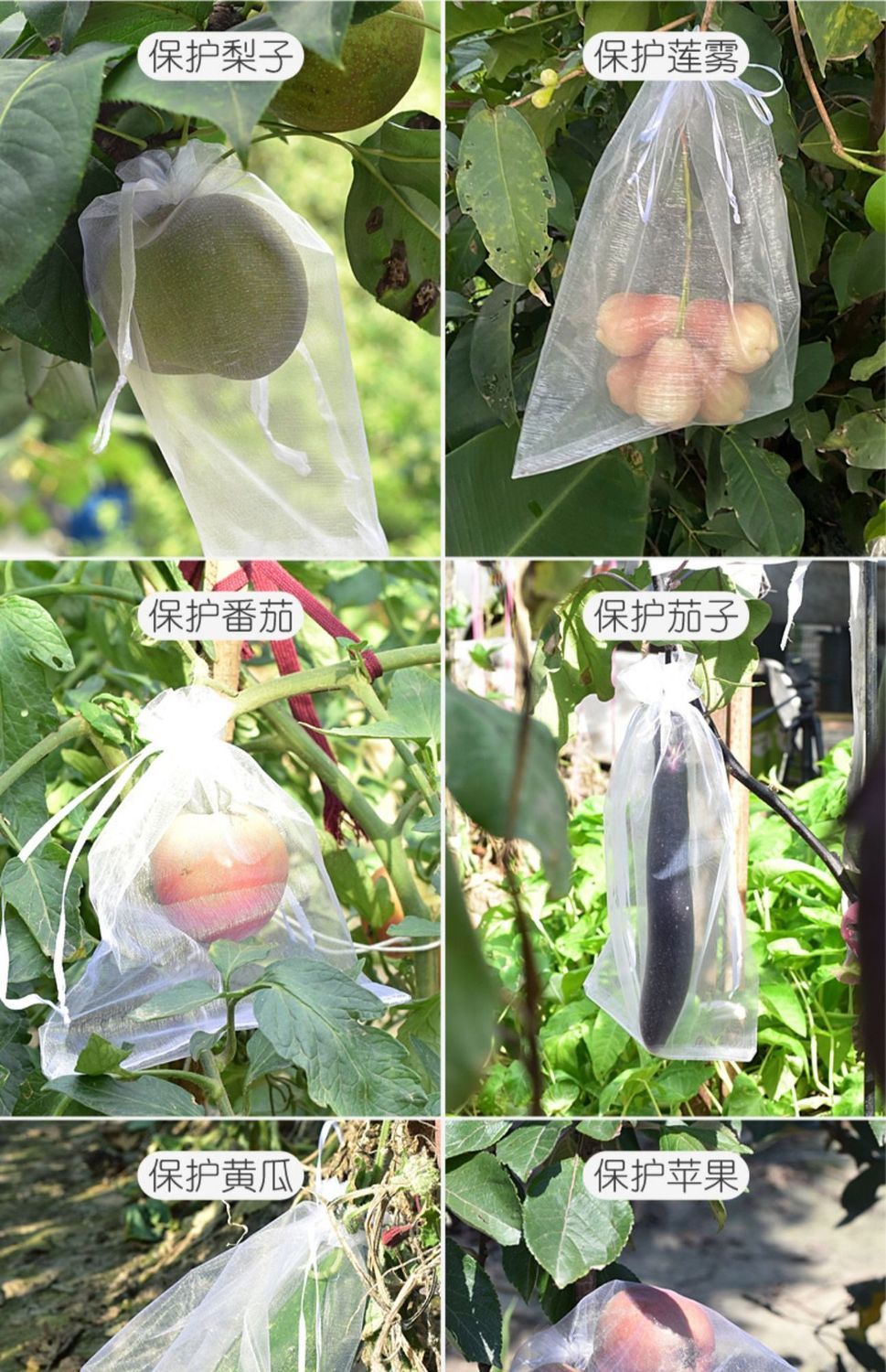 Сетка [маленький размер 9*12 см] защищает от насекомых и птиц.; Сетка [средний размер 13*18 см] защищает от насекомых и птиц.; Сетка [большой размер 20*30 см] защищает от насекомых и птиц; Маленькая сумка из нетканого материала из люфы (15*38см); Большая сумка из нетканого материала из люфы (15*45см)