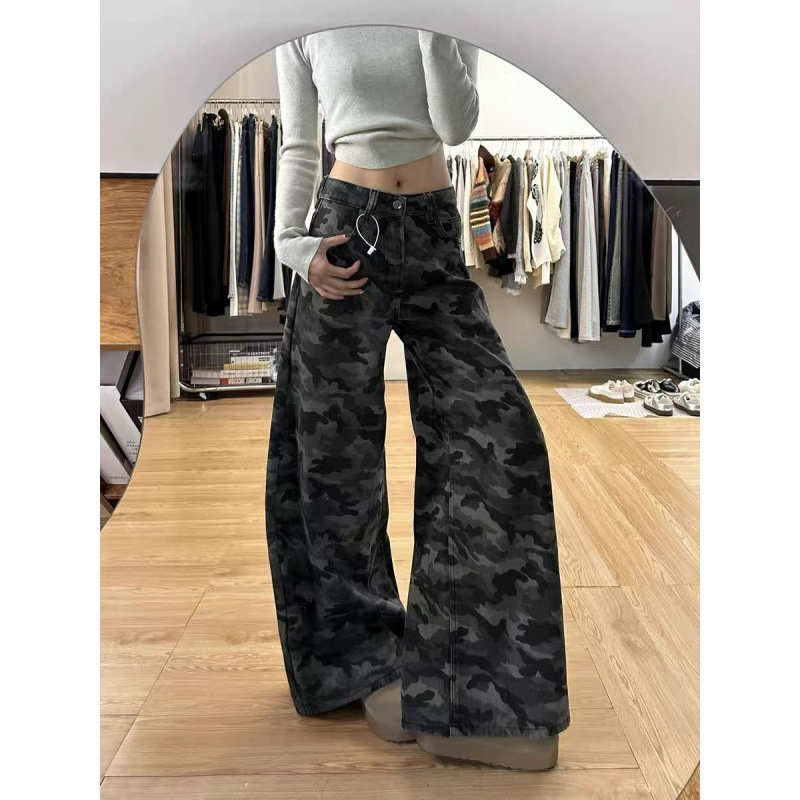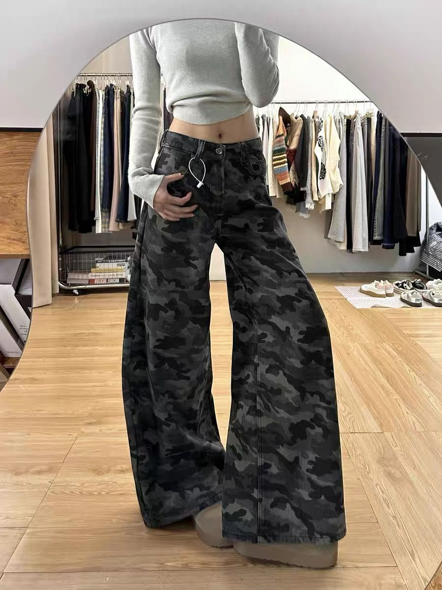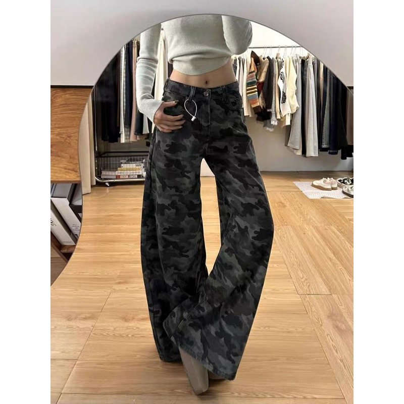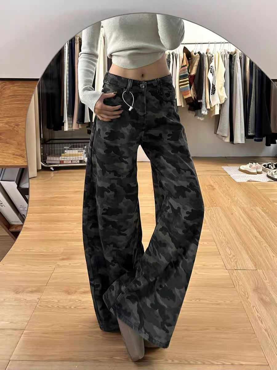 2025 весна ретро с высокой талией, свободная тонкая штанина, вымытые брюки, американские высокие улицы, широкие ноги, камуфляжные джинсы для женщин
