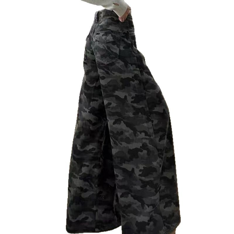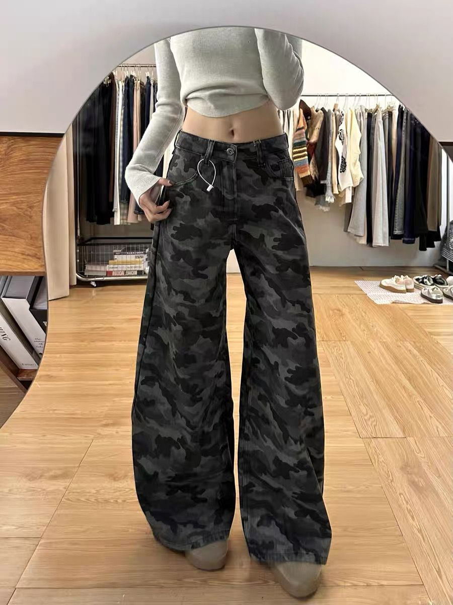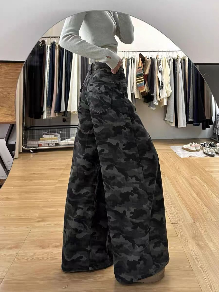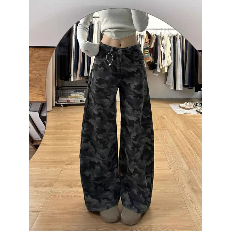 2025 весна ретро с высокой талией, свободная тонкая штанина, вымытые брюки, американские высокие улицы, широкие ноги, камуфляжные джинсы для женщин