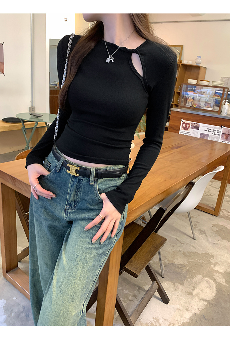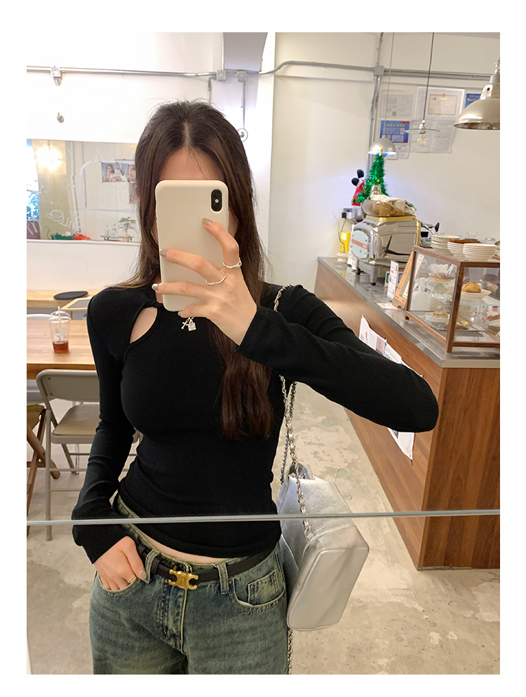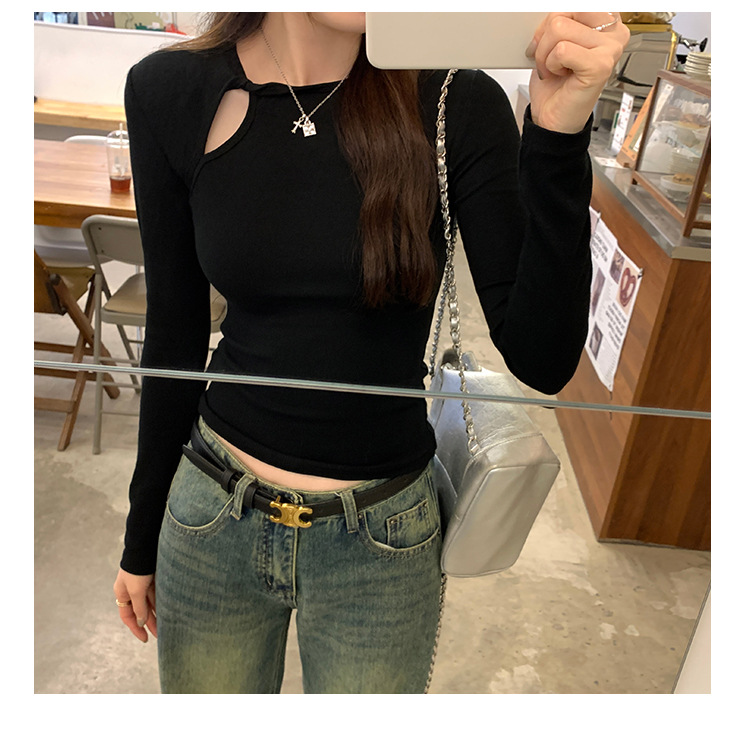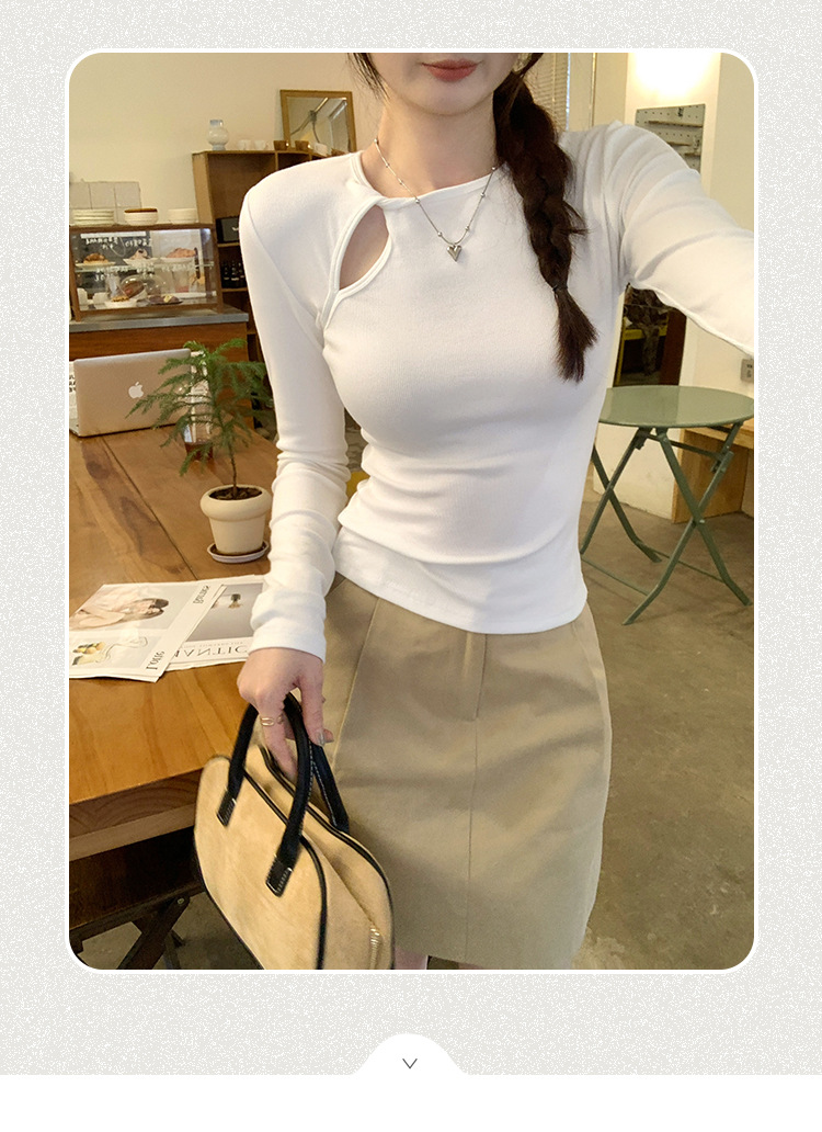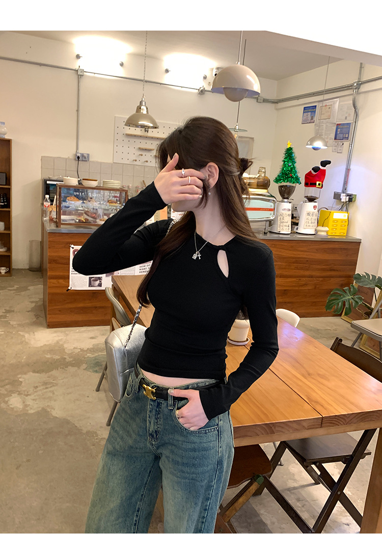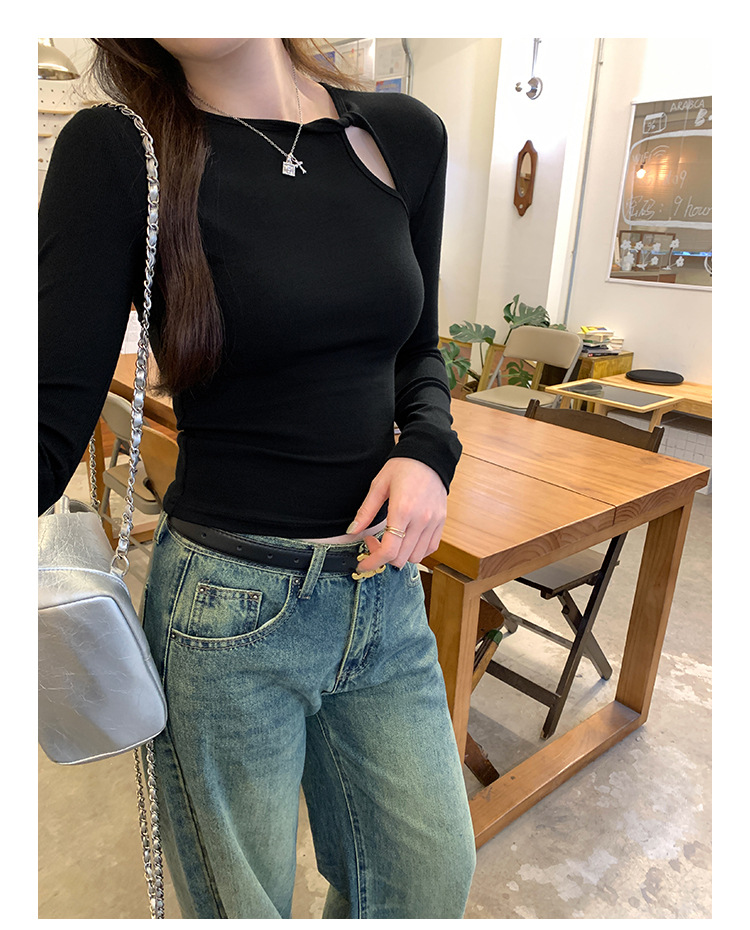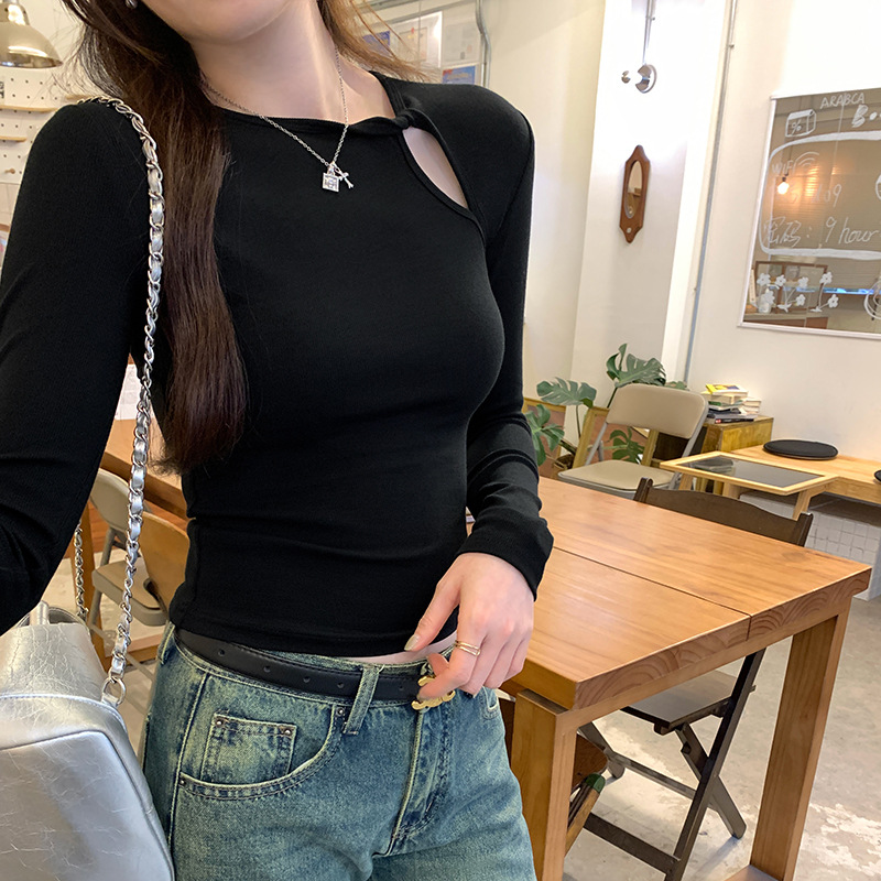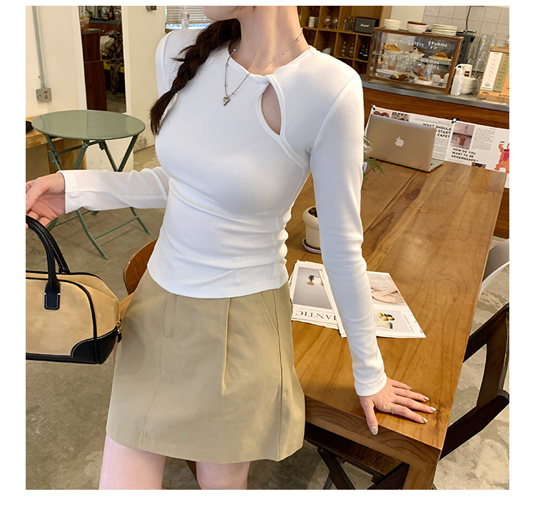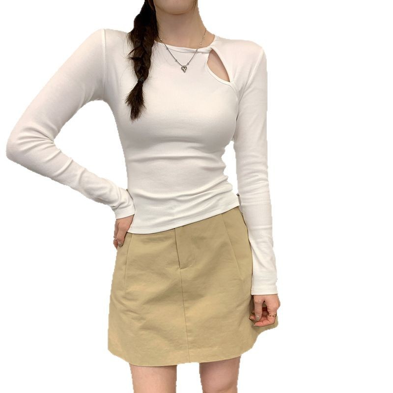 Вырезанный круглый воротник на плече белая футболка с длинным рукавом женская весна и осень новая чистая тонкая рубашка