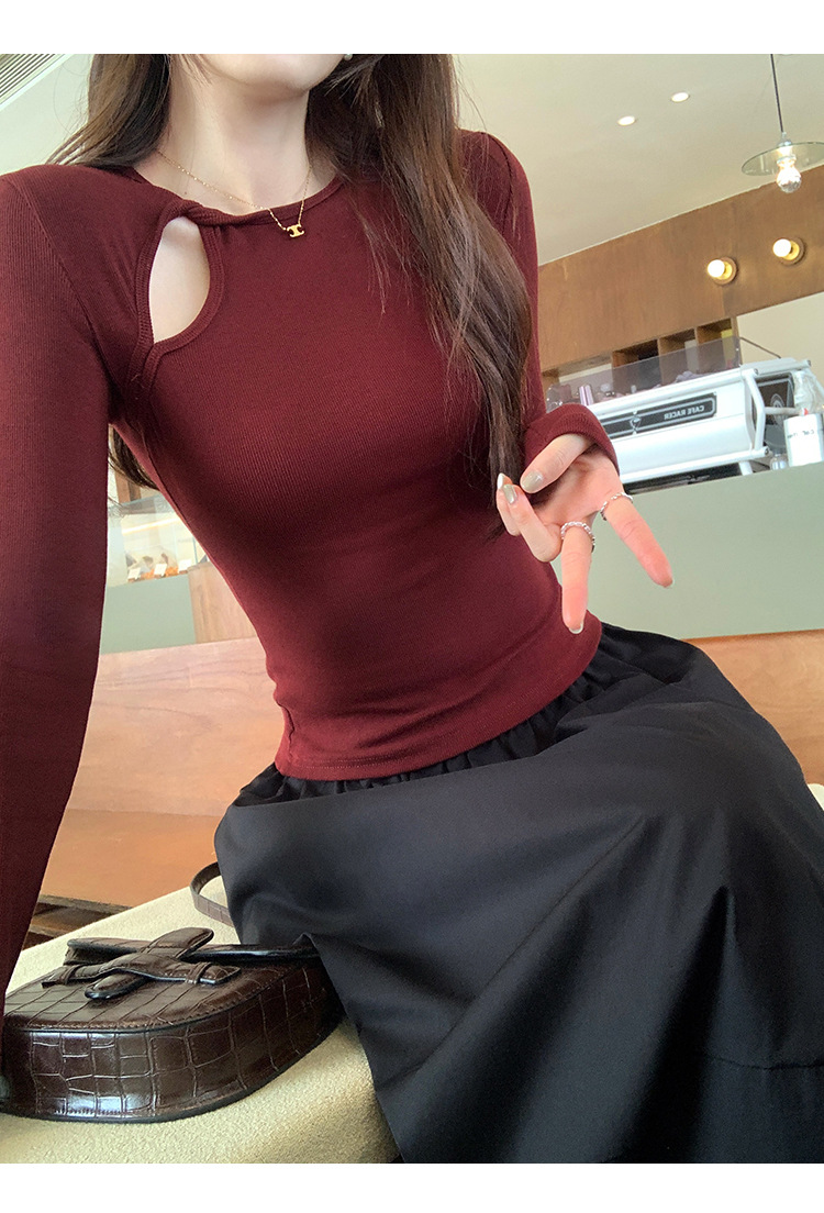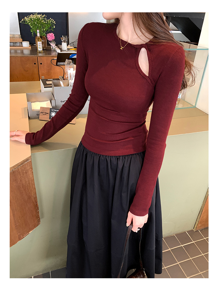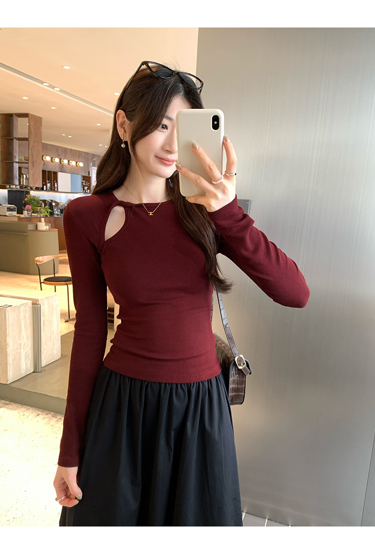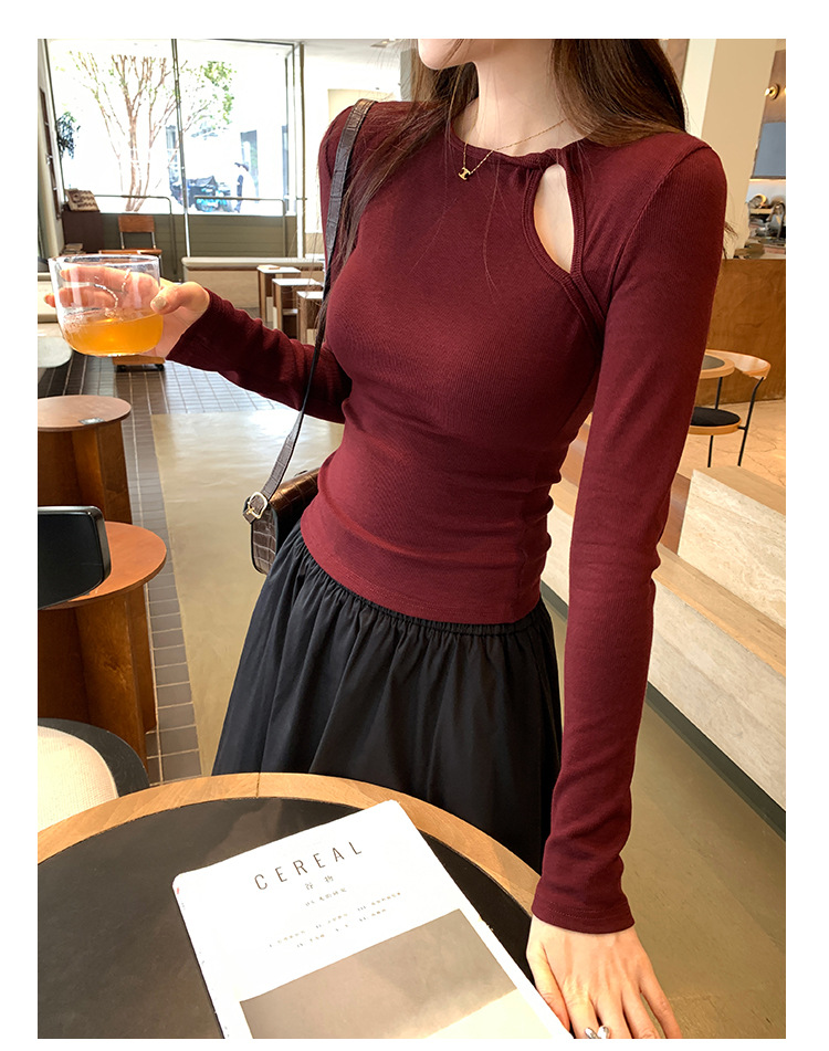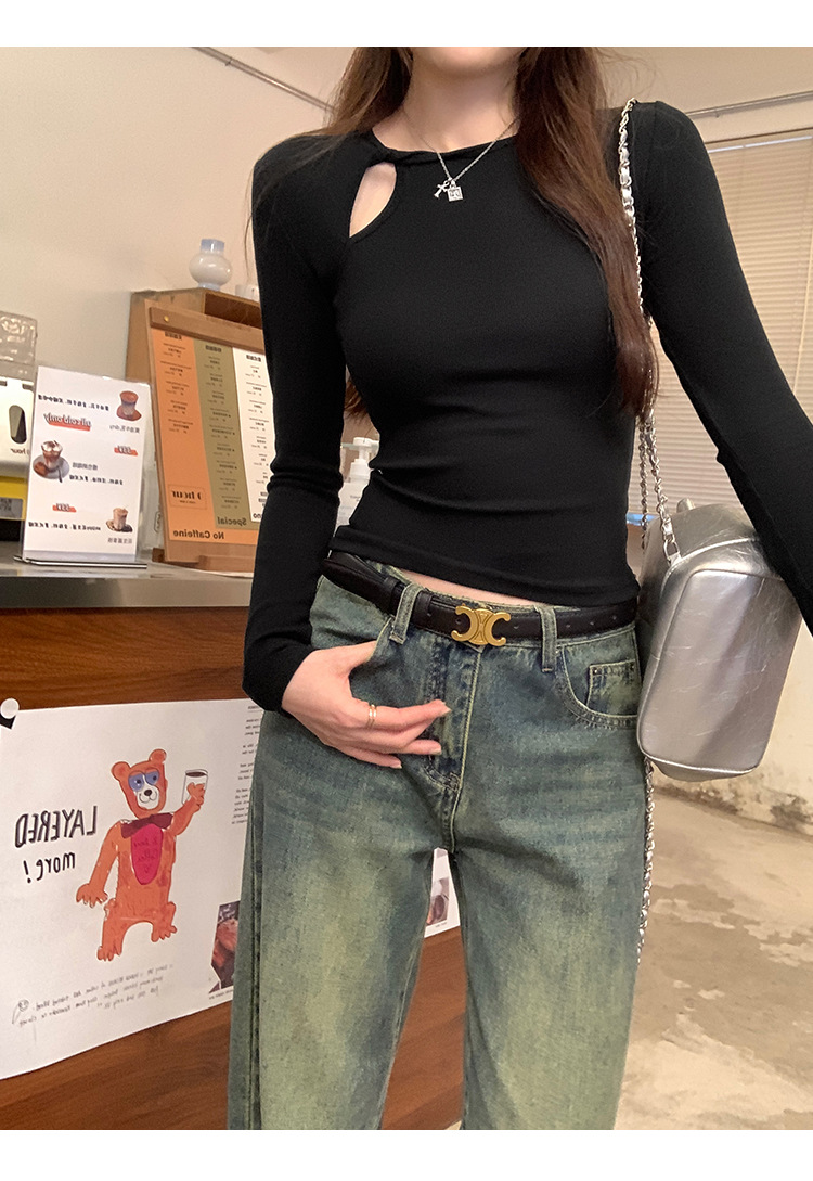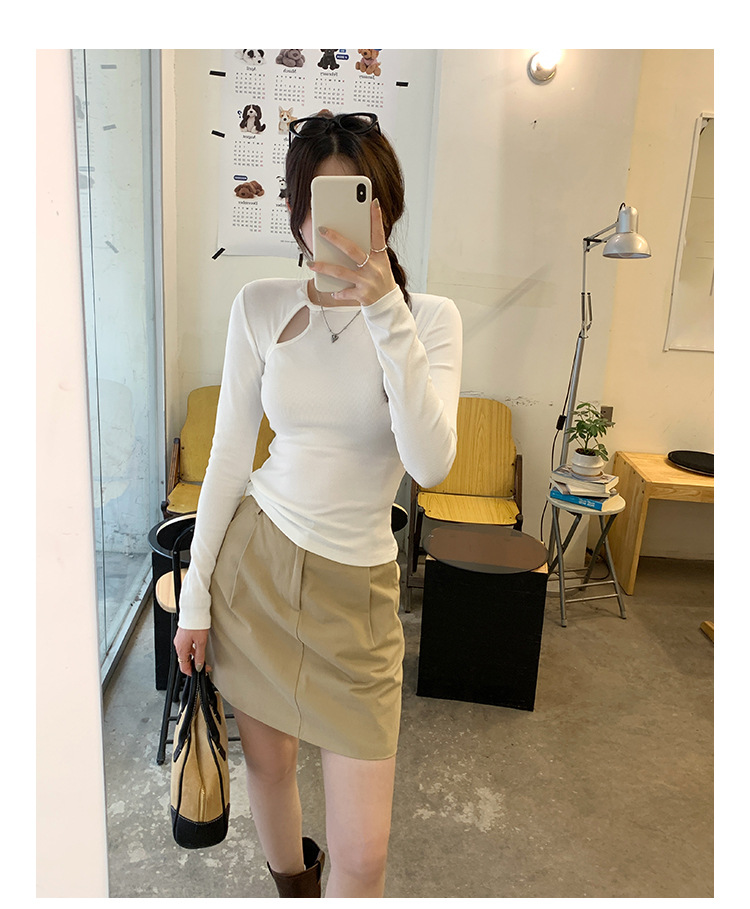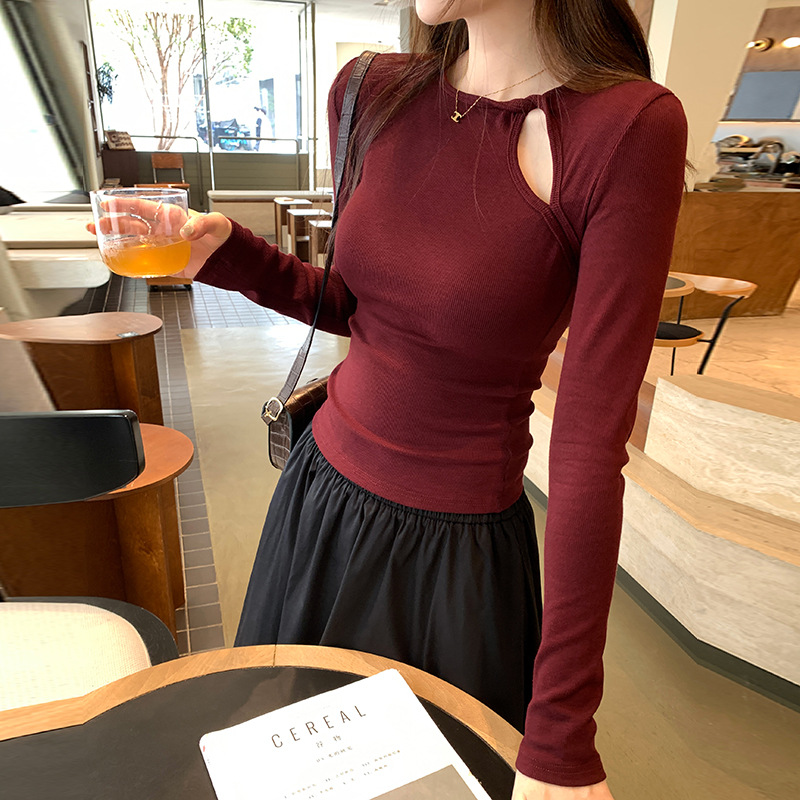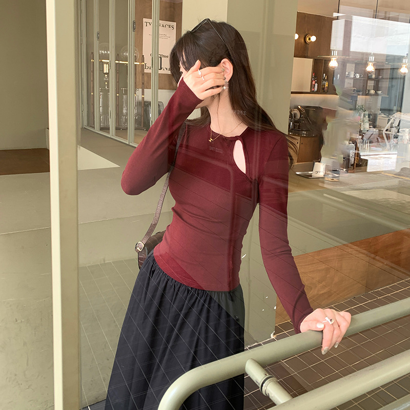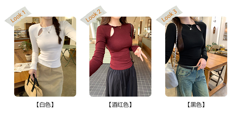 Вырезанный круглый воротник на плече белая футболка с длинным рукавом женская весна и осень новая чистая тонкая рубашка