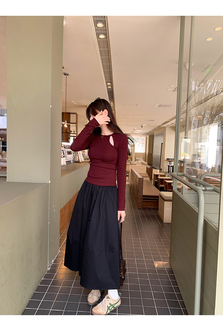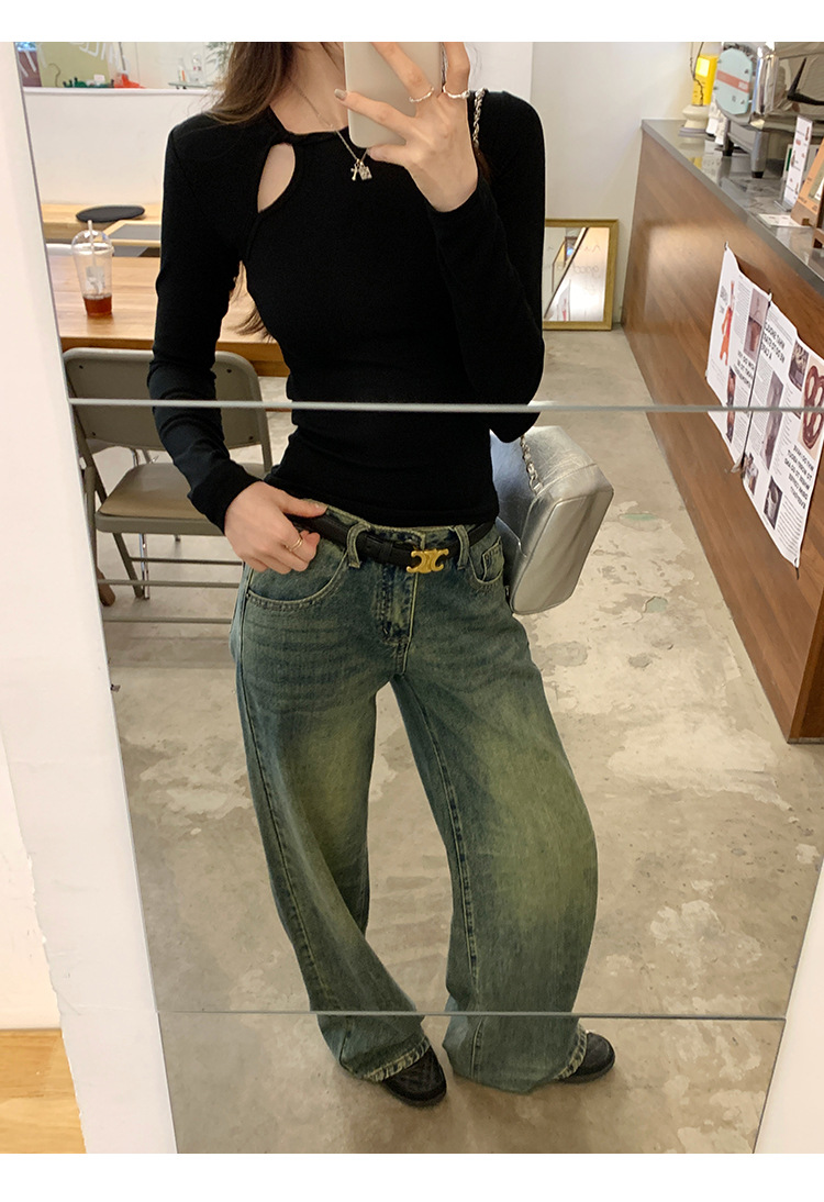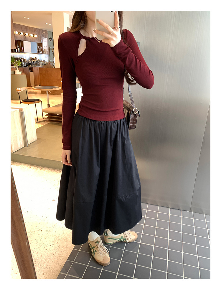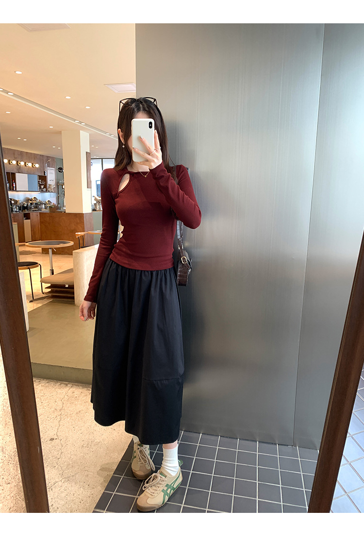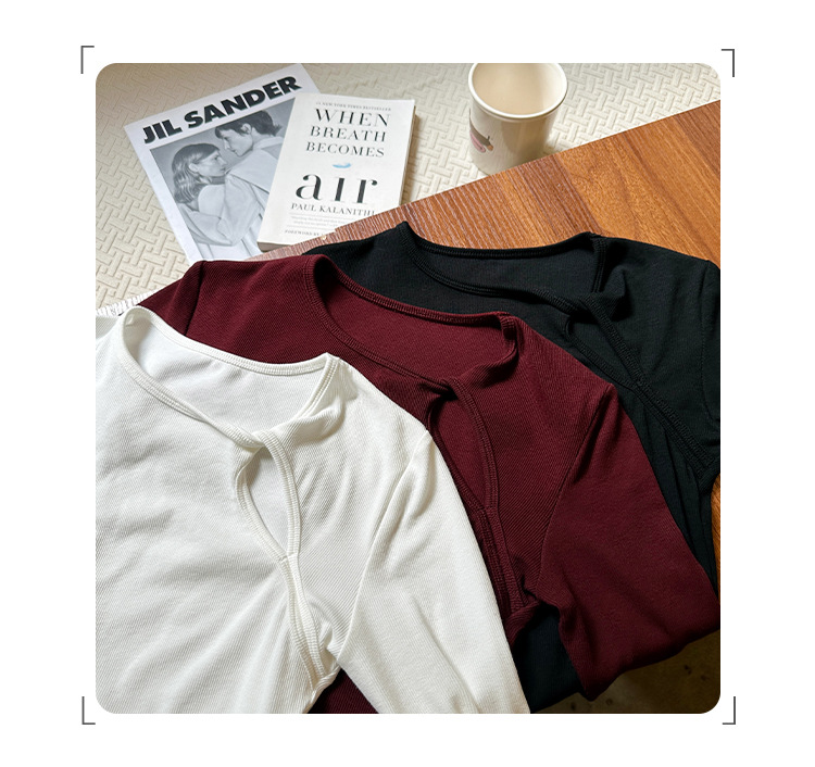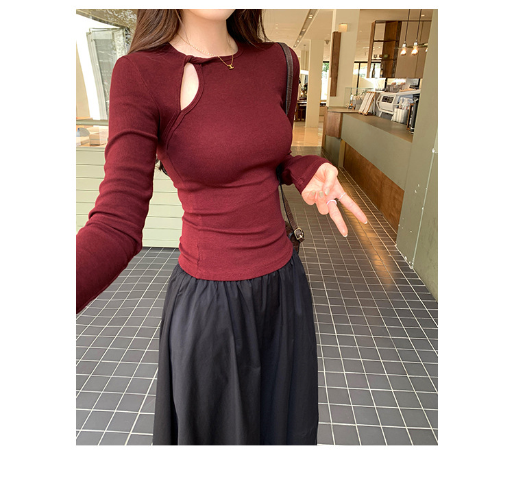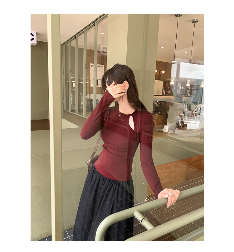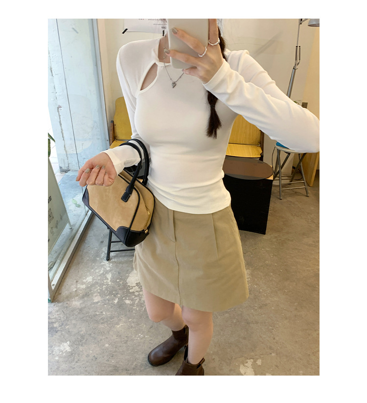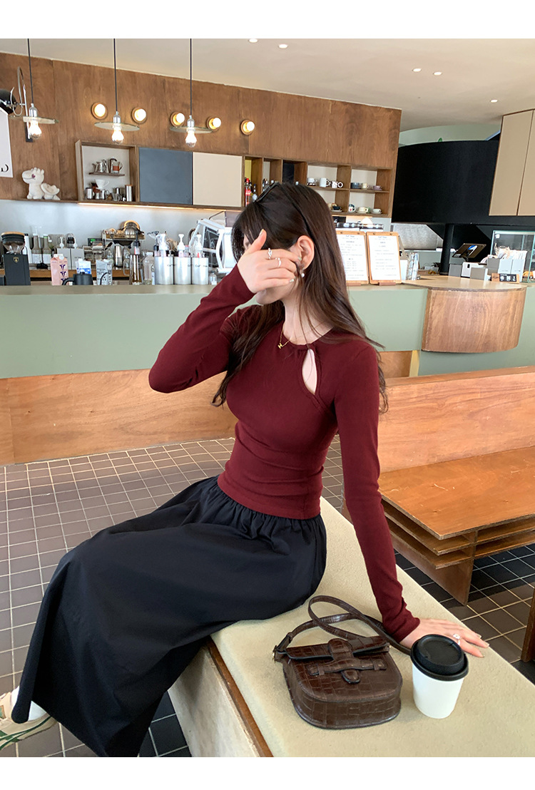 Вырезанный круглый воротник на плече белая футболка с длинным рукавом женская весна и осень новая чистая тонкая рубашка