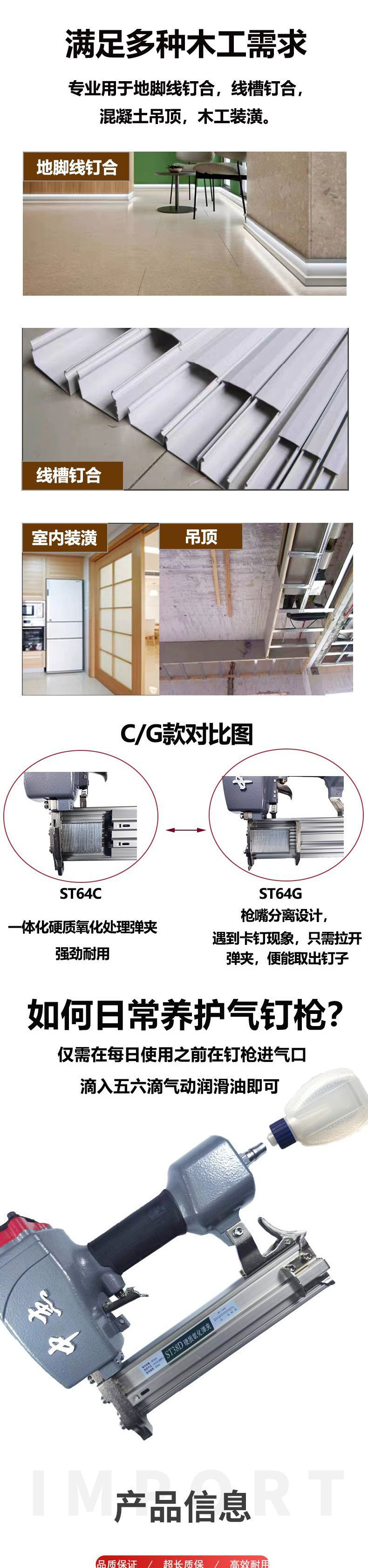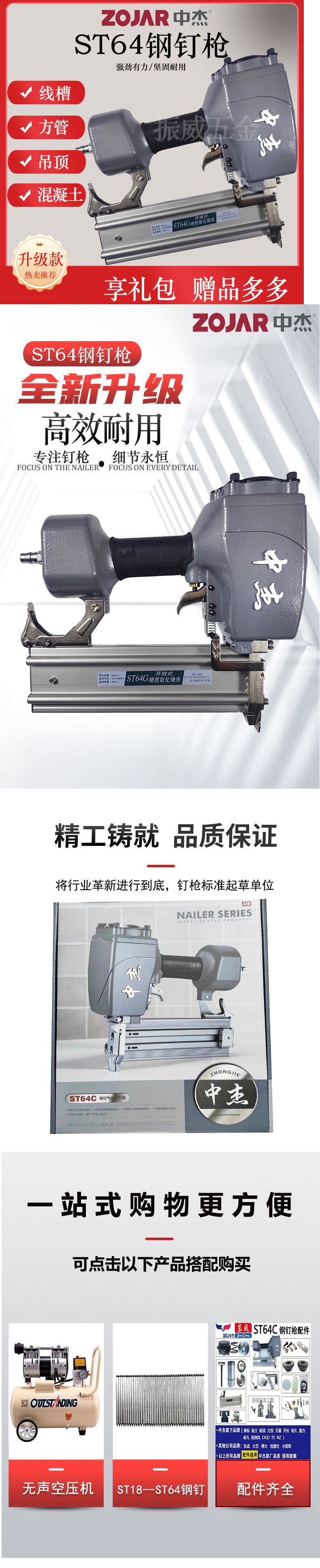 Стальной пистолет для гвоздей Zhongjie ST64C (обычная модель); Стальной пистолет для гвоздей Zhongjie ST64G (без модели гвоздя); Малый стальной пистолет для гвоздей Zhongjie ST38D (переключатель безопасности)
