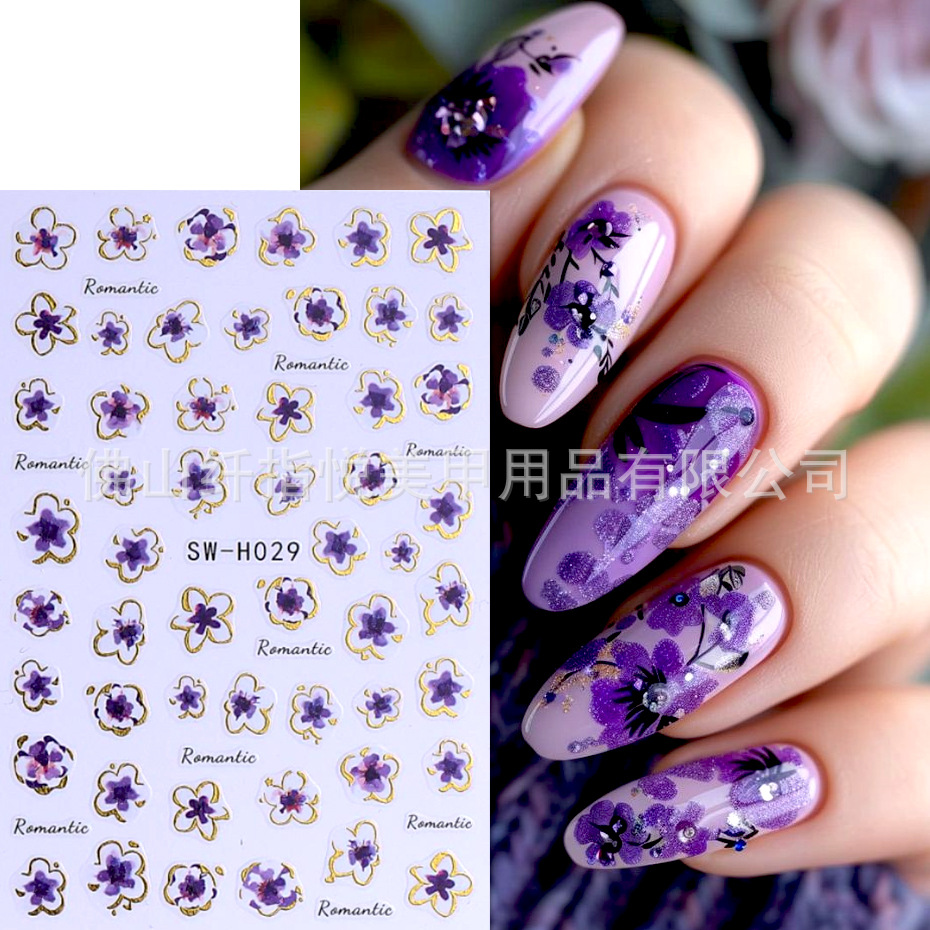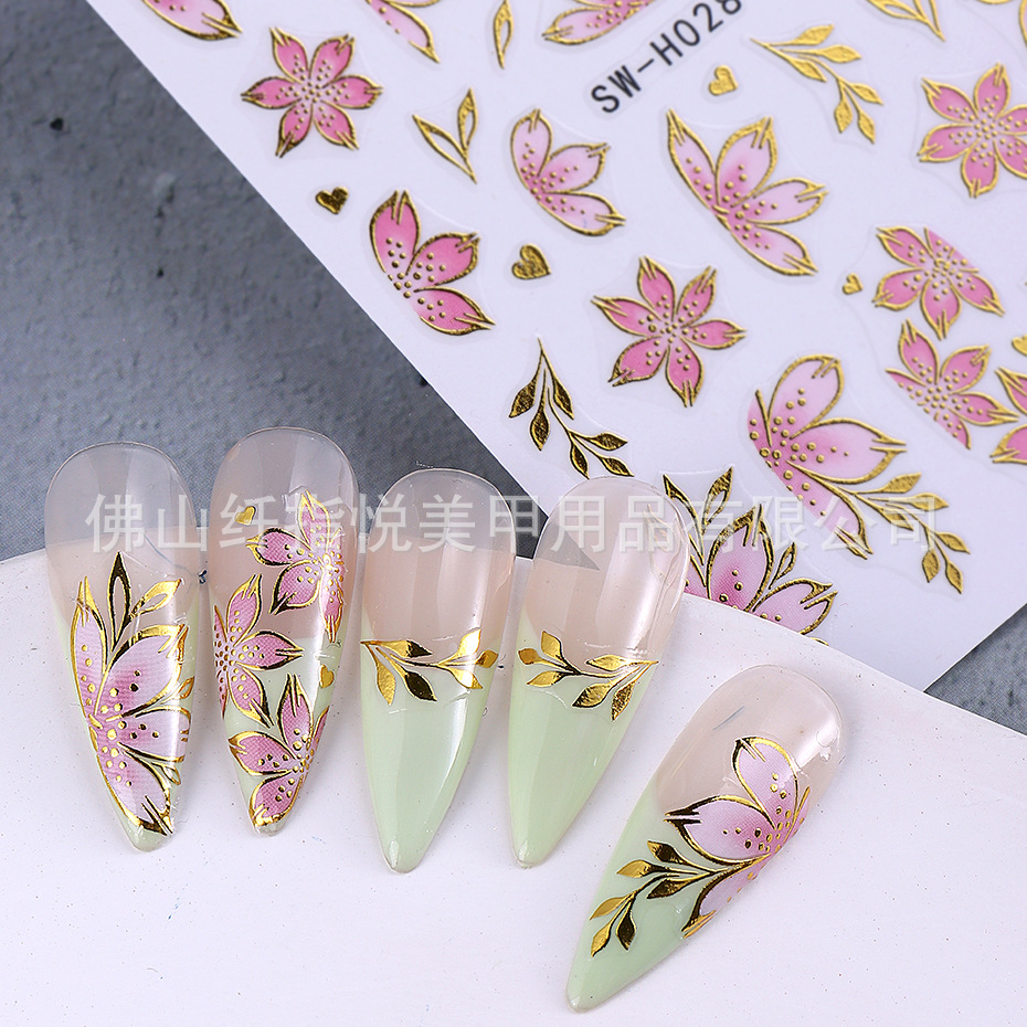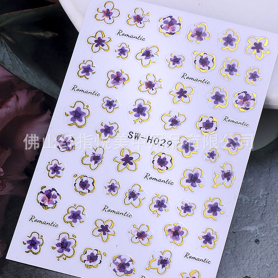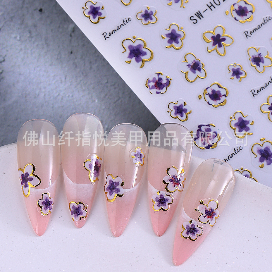 Трансграничные взрывные наклейки для ногтей оптом ins позолоченные розовые полупрозрачные лепестки фиолетовые цветы весенние наклейки для ногтей