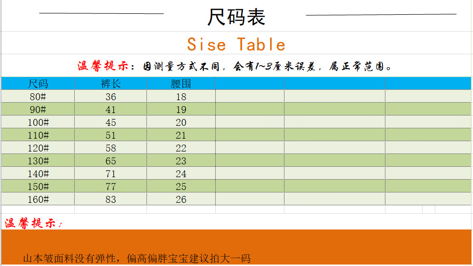 80cm; 90cm; 100cm; 110cm; 120cm; 130cm; 140cm; 150cm; 160cm