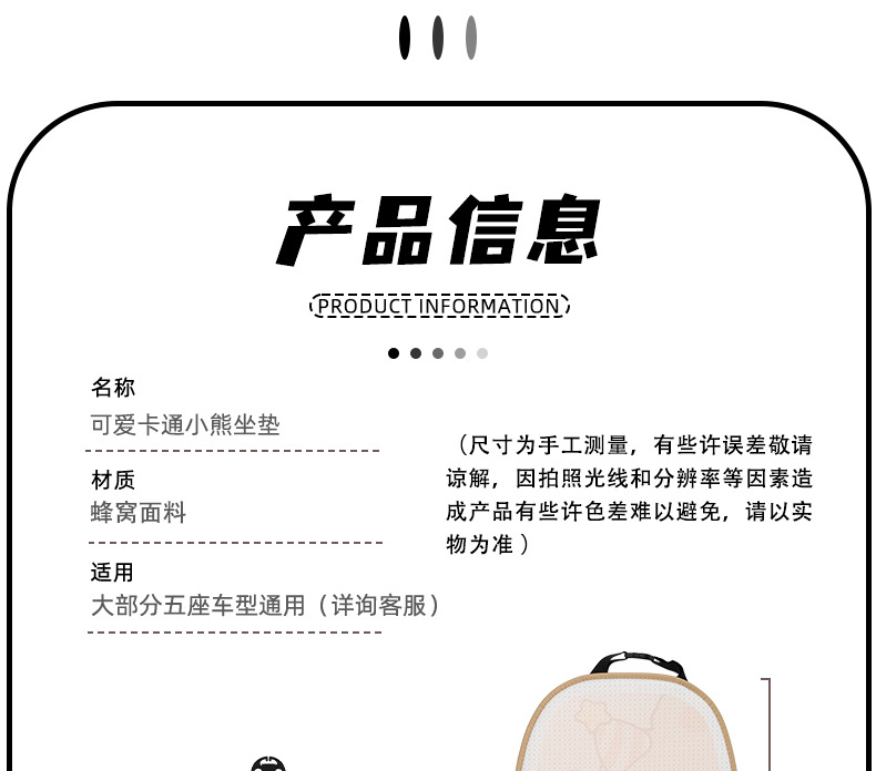 Подушка для переднего сиденья «Хлебный мишка»; Подушка-спинка «Хлебный мишка»; Подушка для сиденья «Хлебный медведь» — задний ряд; Набор из трех подушек «Хлебный медведь»; Набор из семи подушек «Хлебный медведь»; Подушка с изображением головы медведя и бантом из кроличьего меха; Подушка на талию с кроличьим мехом и бантом в виде медведя; Подушка сиденья Honeycomb Biye Bear, передний ряд; Спинка сиденья Honeycomb Biye Bear с подушкой; Сиденье-подушка Honeycomb Biye Bear сзади; Набор из трех частей подушки Honeycomb Biye Bear; Набор из семи подушек для сиденья Honeycomb Biye Bear