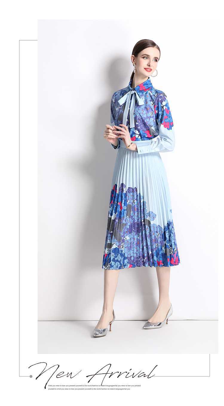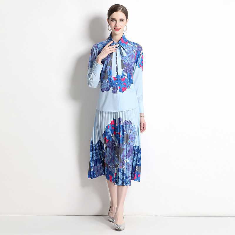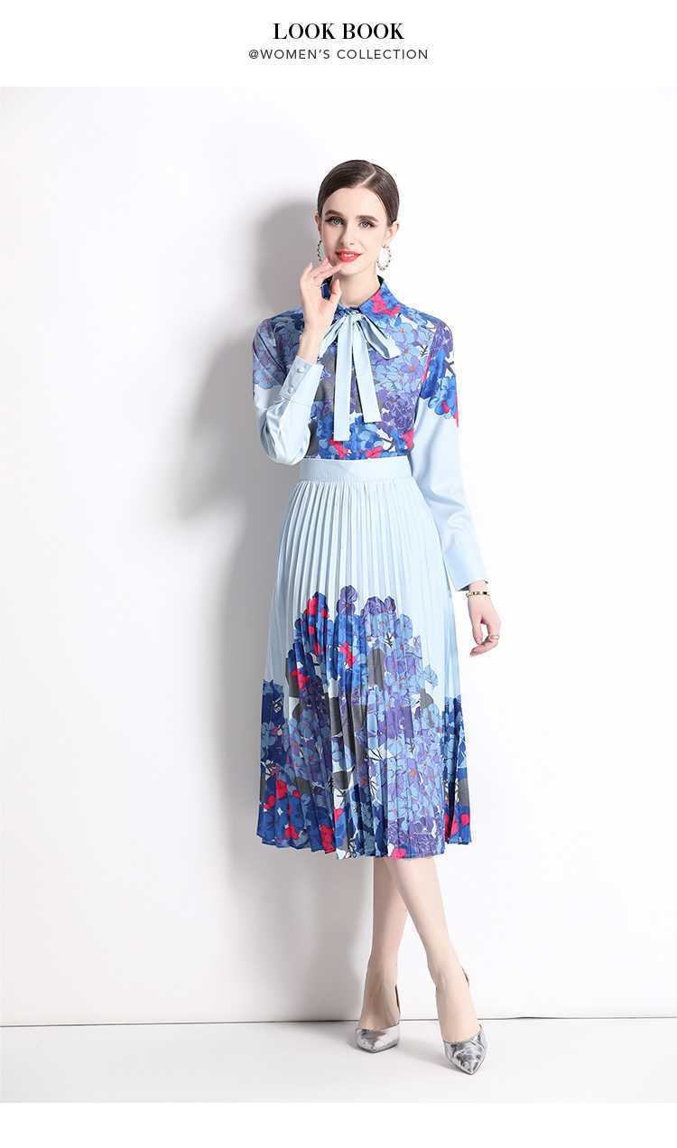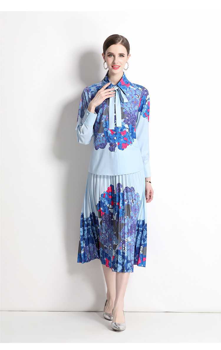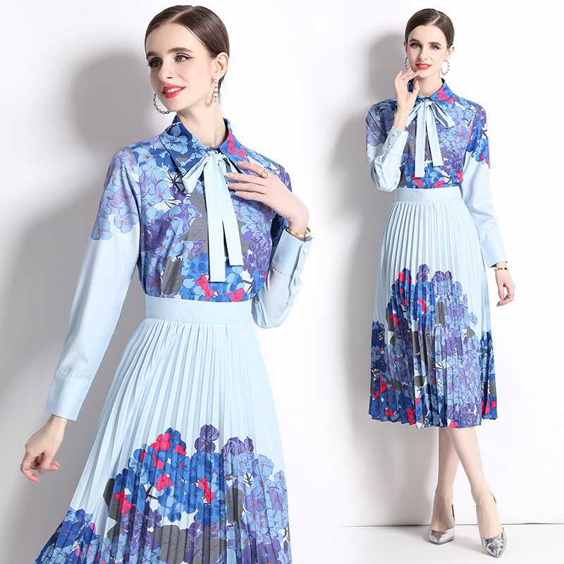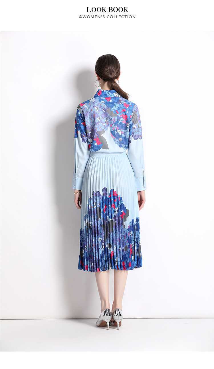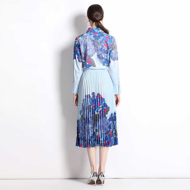 Реальная стрельба темно-синий полный набор гортензии модный праздничный принт Polo лацканная рубашка романтическая плиссированная юбка