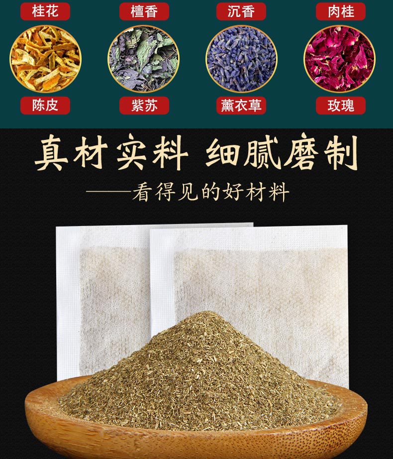 配方:石菖蒲、艾叶、桂枝、藿香、白芷、苍术、 佩兰等