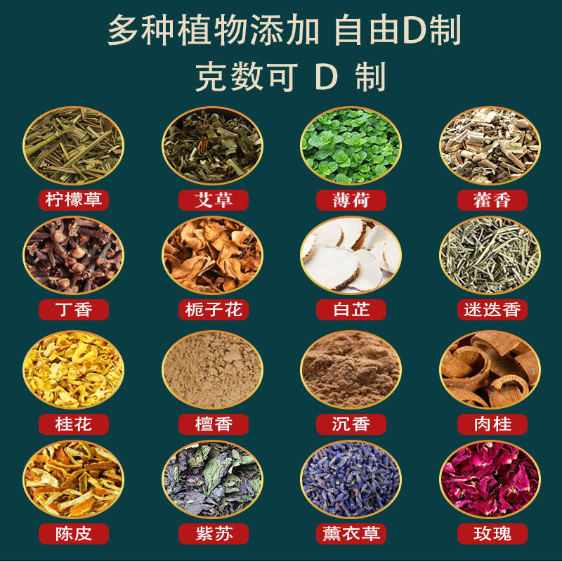 配方: 茉莉花、橙皮、佛手、玫瑰、柠檬草、艾叶等